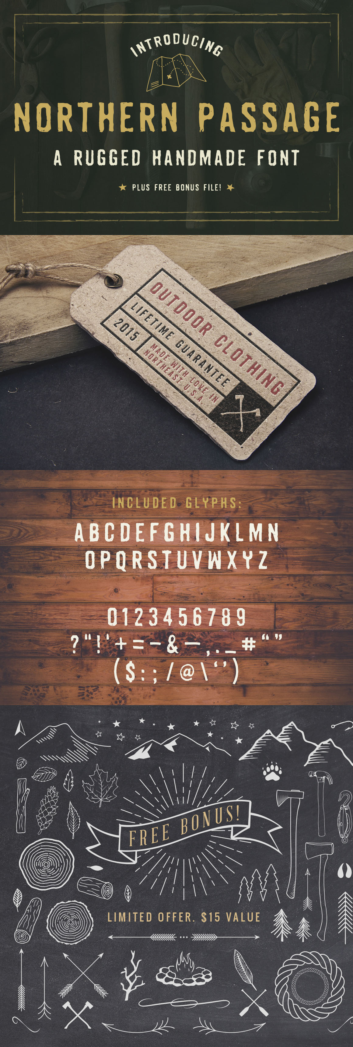 I’m proud to offer my first typeface, Northern Passage. My family and I love to go camping and hiking, which inspired me to create a handmade font with a vintage, weathered appearance like you might see on an old cabin sign. This is an all-caps display font that would be perfect for any design that needs a rustic, woodsy feel. BONUS: In celebration of releasing this new typeface, I’m also including my popular “Hand-Drawn Rustic Nature Elements” completely free for a limited time (a $15 value).