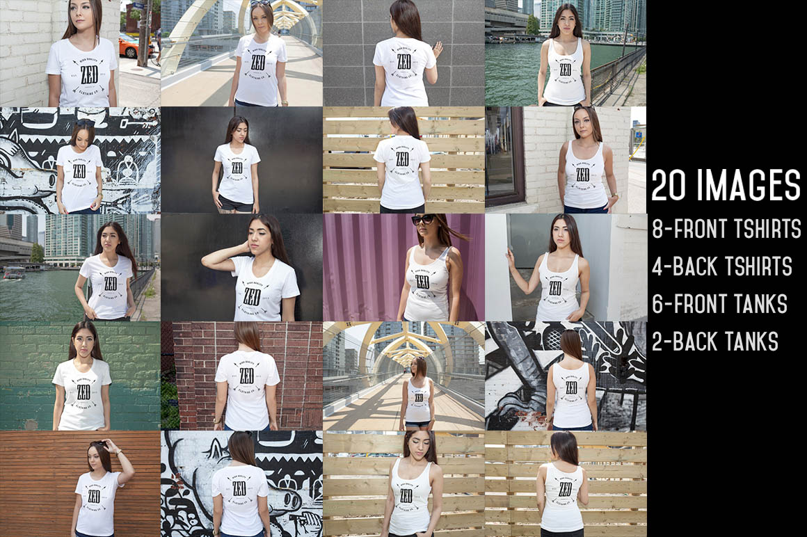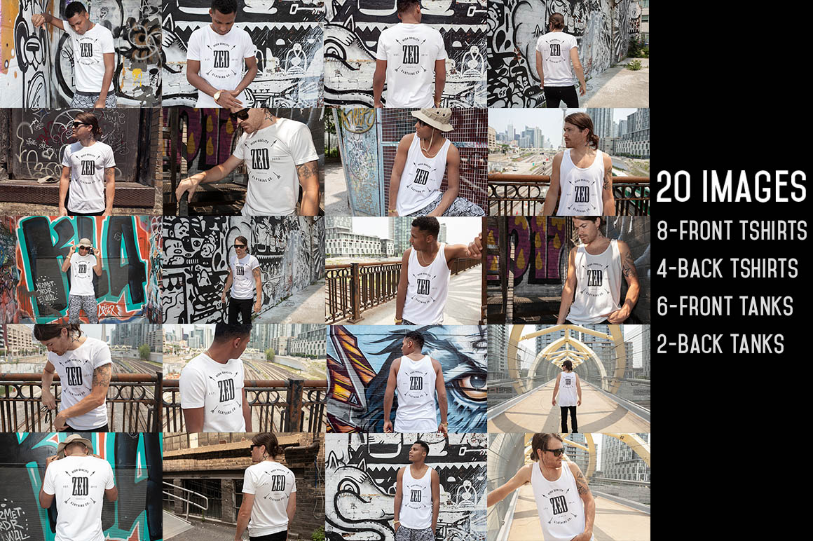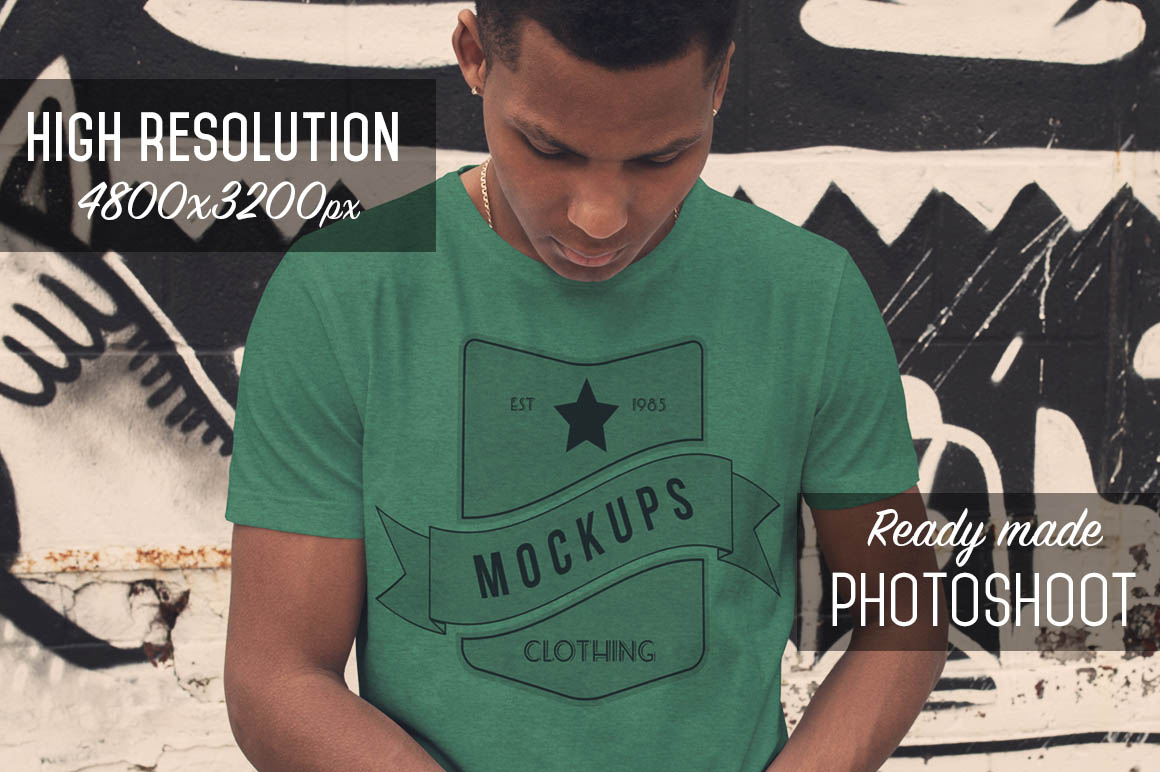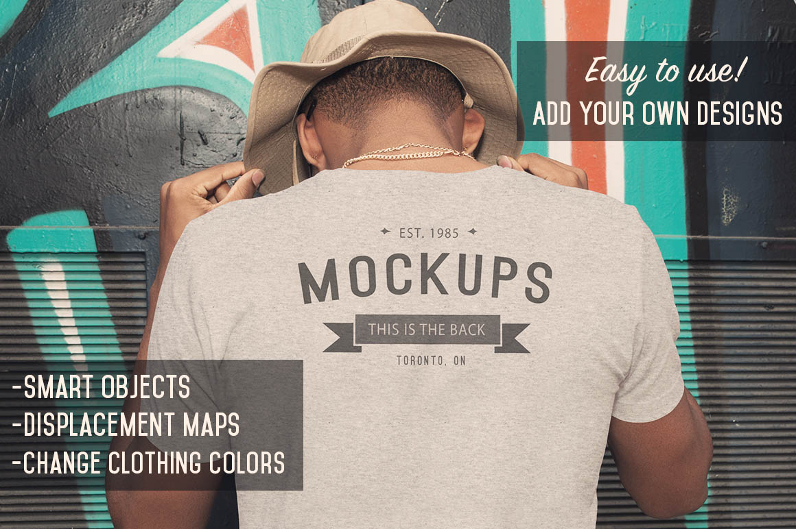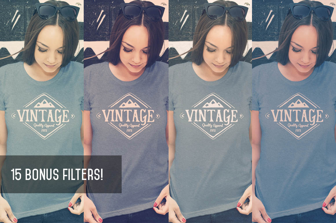 20 Professional Photo Shoot Mockups in High res (4800x3200px) Ready for print or web. Easily display your designs on ready made photo shoots with real models. This template set also comes with the popular “15 Vintage Photo Filter Actions” ($5 value). Easy to edit Smart Objects. Change the shirt color to anything you want as well as Heather Gray! Realistic textures, folds and displacement mapping. Your designs will look like they were actually apart of this photo shoot! There is a detailed help video included that walks you through the whole process!