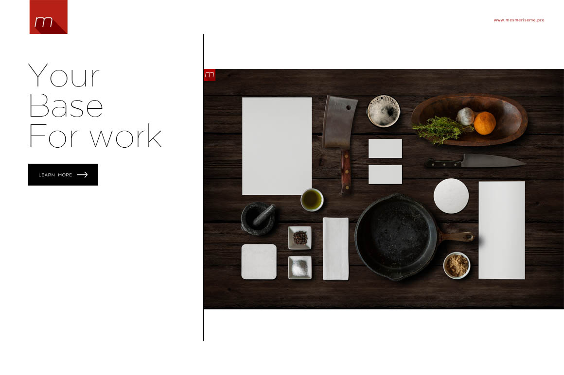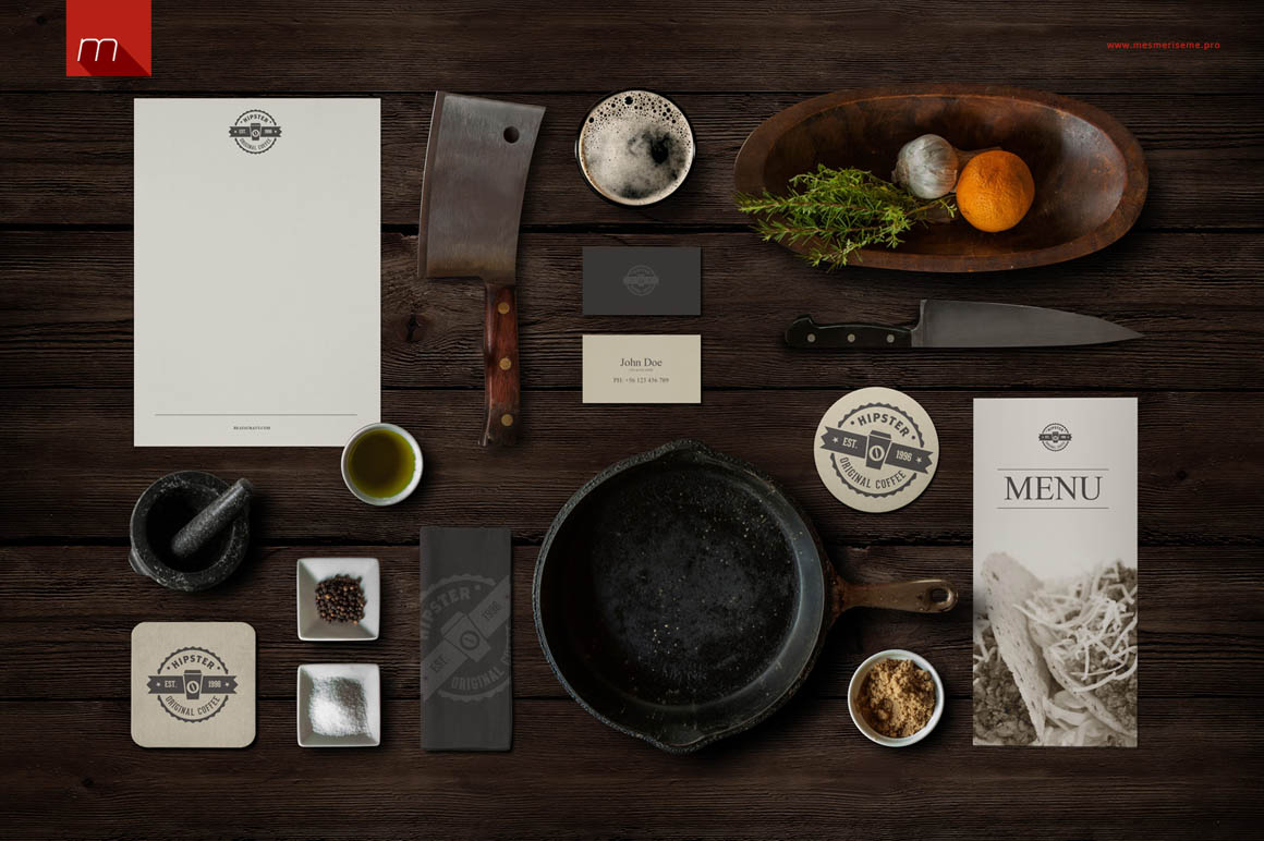 VINTAGE RESTAURANT 2 BRANDING IDENTITY MOCK-UP: 1 psd file: 6000×4000 px; editable elements (change them colors, put design using smart objects): letterhead, business cards, rectangular coaster, napkin, circular coaster, menu; non editable elements: bowl with oil, mortar, chopper, drink, big bowl, knife, bowl with salt, bowl with peper, bowl with spice, frying pan; 17 elements; well oganized layers.