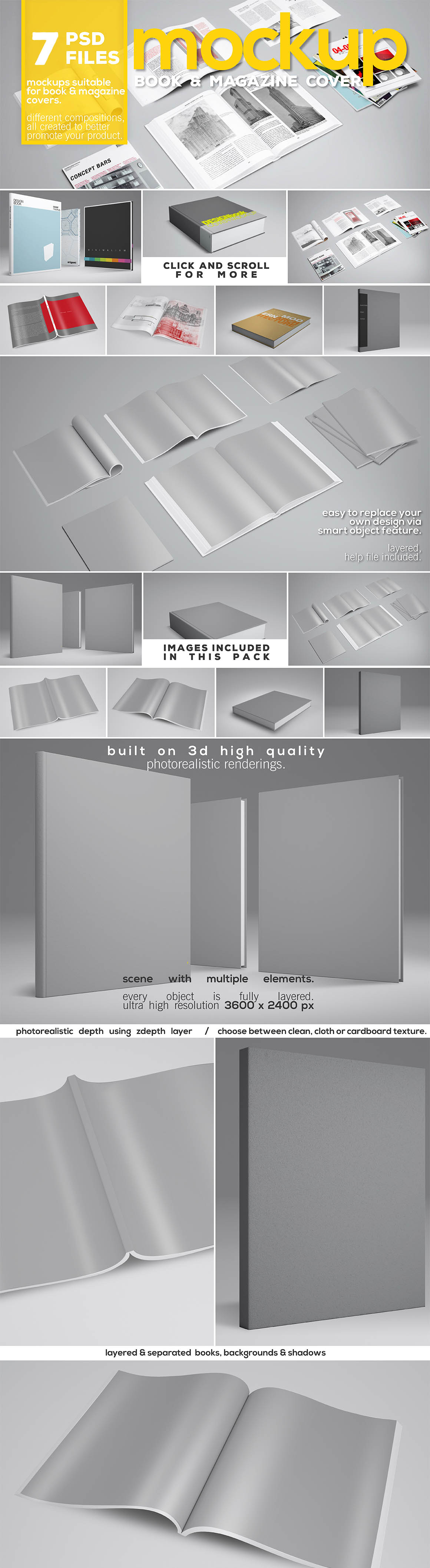 7 studio type images (different formats and sizes) built on very accurate 3d models of books and magazines: Easily editable via smart object, Ultra High resolution, Photo-realistic, Realistic Depth of field using zdept map, Suitable for book and magazine designs (click and scroll to view more).