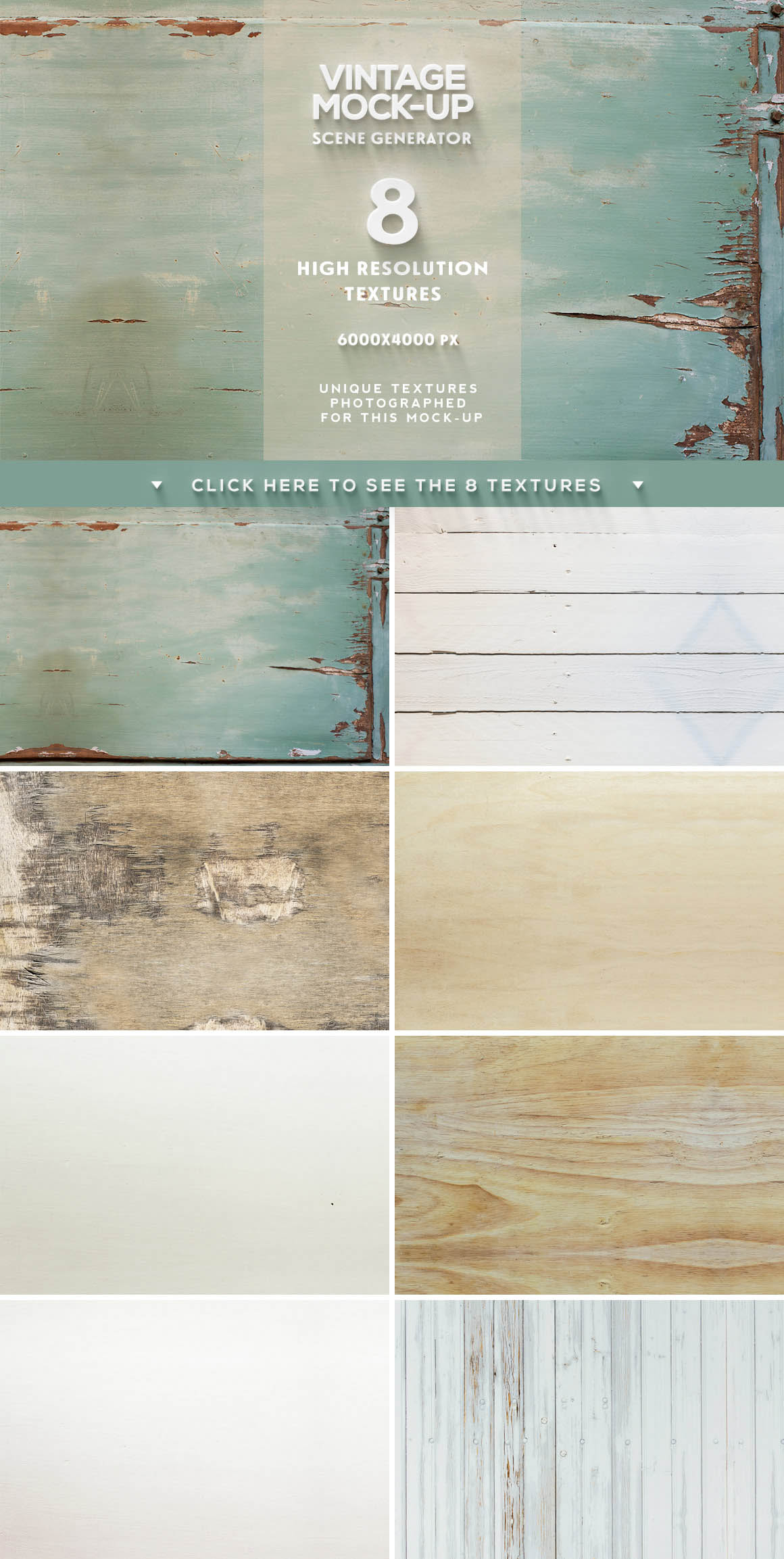 What you will find here is basically a collection of some photographed personal items which I have been collecting and other kind of objects that I decided to adapt for this mock-up. You can use them freely and independently in the custom scenes which I’ve included or in those that you wish to create. The photographs of each item were taken in high resolution (300 DPI), which allows you to resize them without losing their quality. Also you will find 8 pre-made scenes (6000 x 4000 px) and an empty SceneGenerator.psd (6000 x 4000 px) in order to create your own mockup from scratch with the items and the textures included in this package. Finally you will find 8 included textures (6000 x 4000 px) unique for this mock-up; they too, have been taken in high resolution (300 DPI).