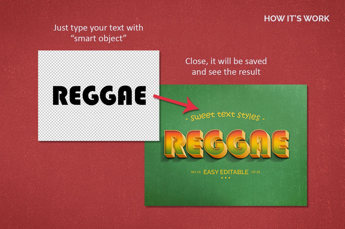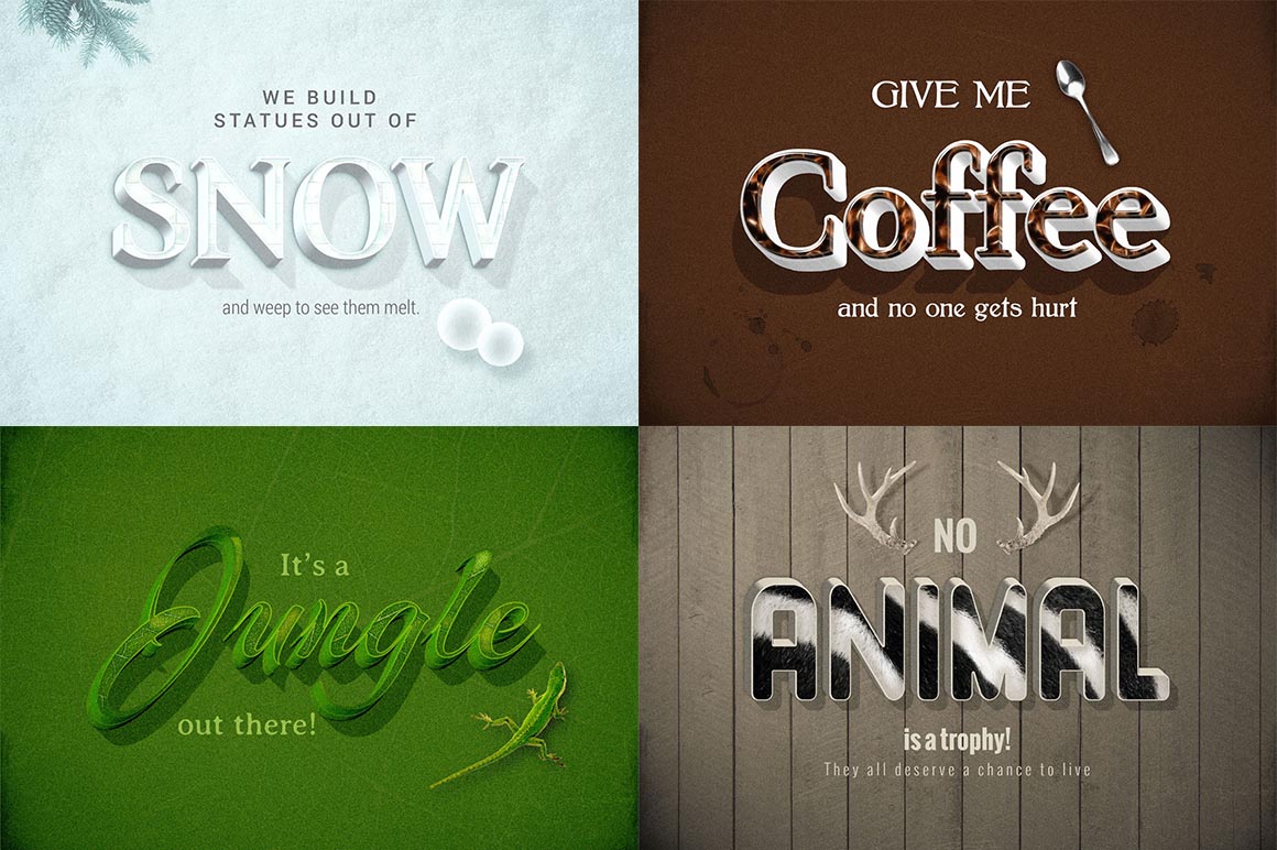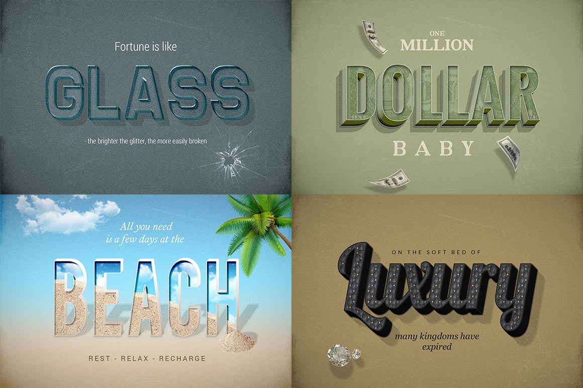 TEN 3D-TEXT STYLES Very easy to use. Replace the text via smart object layers. FEATURES: All elements are fully editable. Easy to use (Smart-object-replacement) All layers are organized in groups. Size: 1500×1200 px / 300 dpi