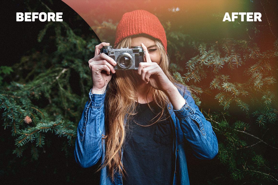129 high quality JPEG 4000×2500 with lens leaks and film burns overlay effects. To create amazingly beautiful photos.