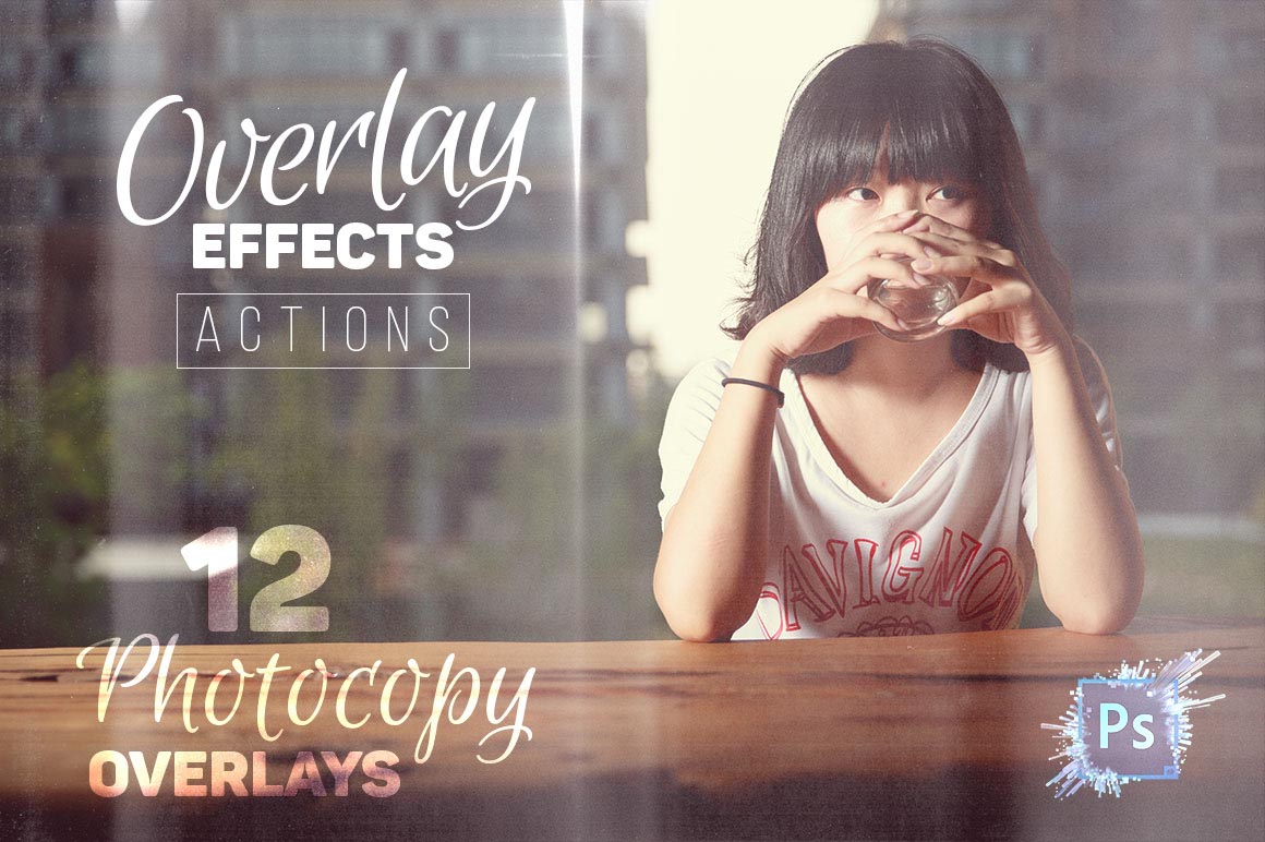 12 high quality JPEG 3500×2500 photocopy overlay effects with actions. Included 3 vintage color effect layer.