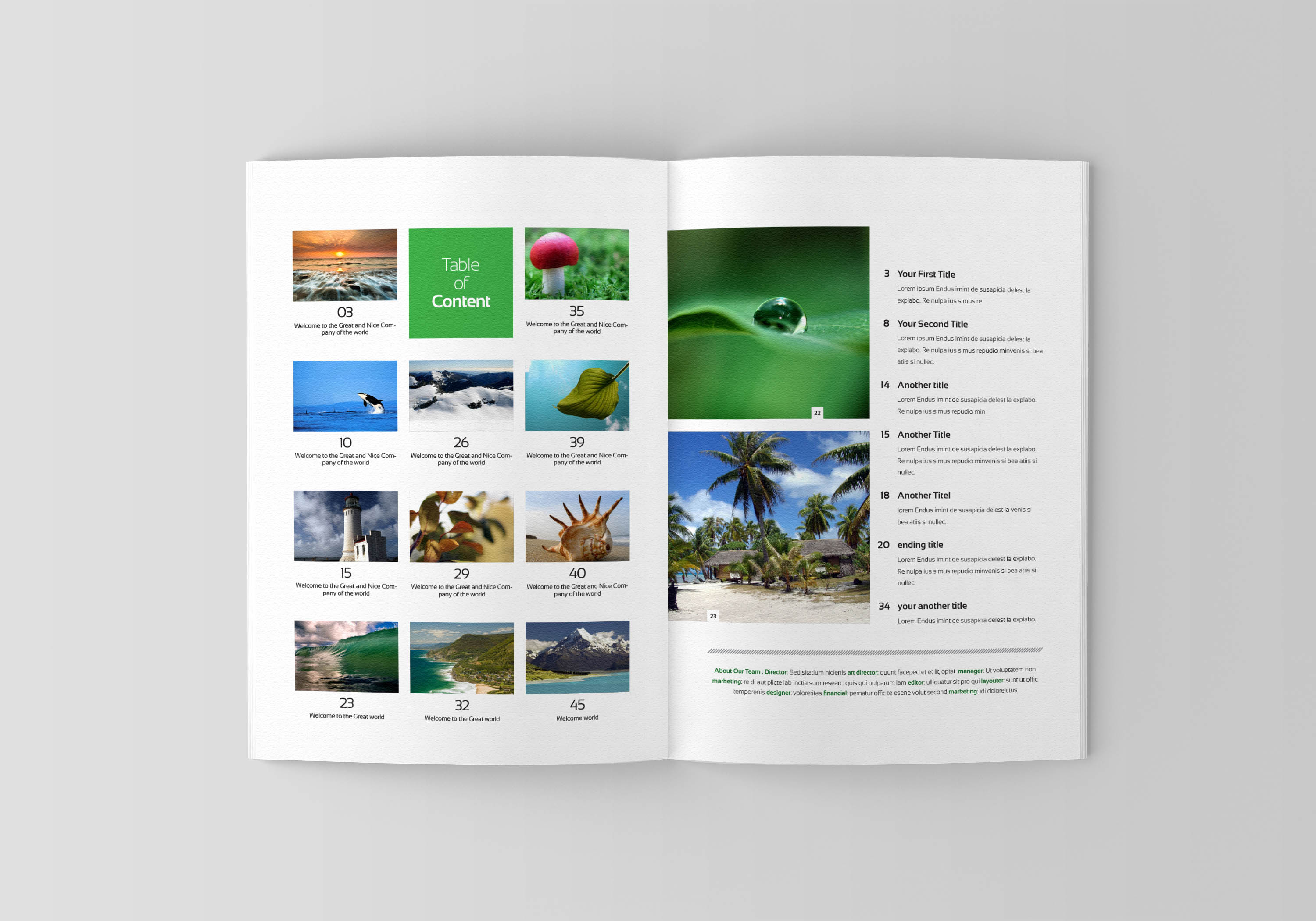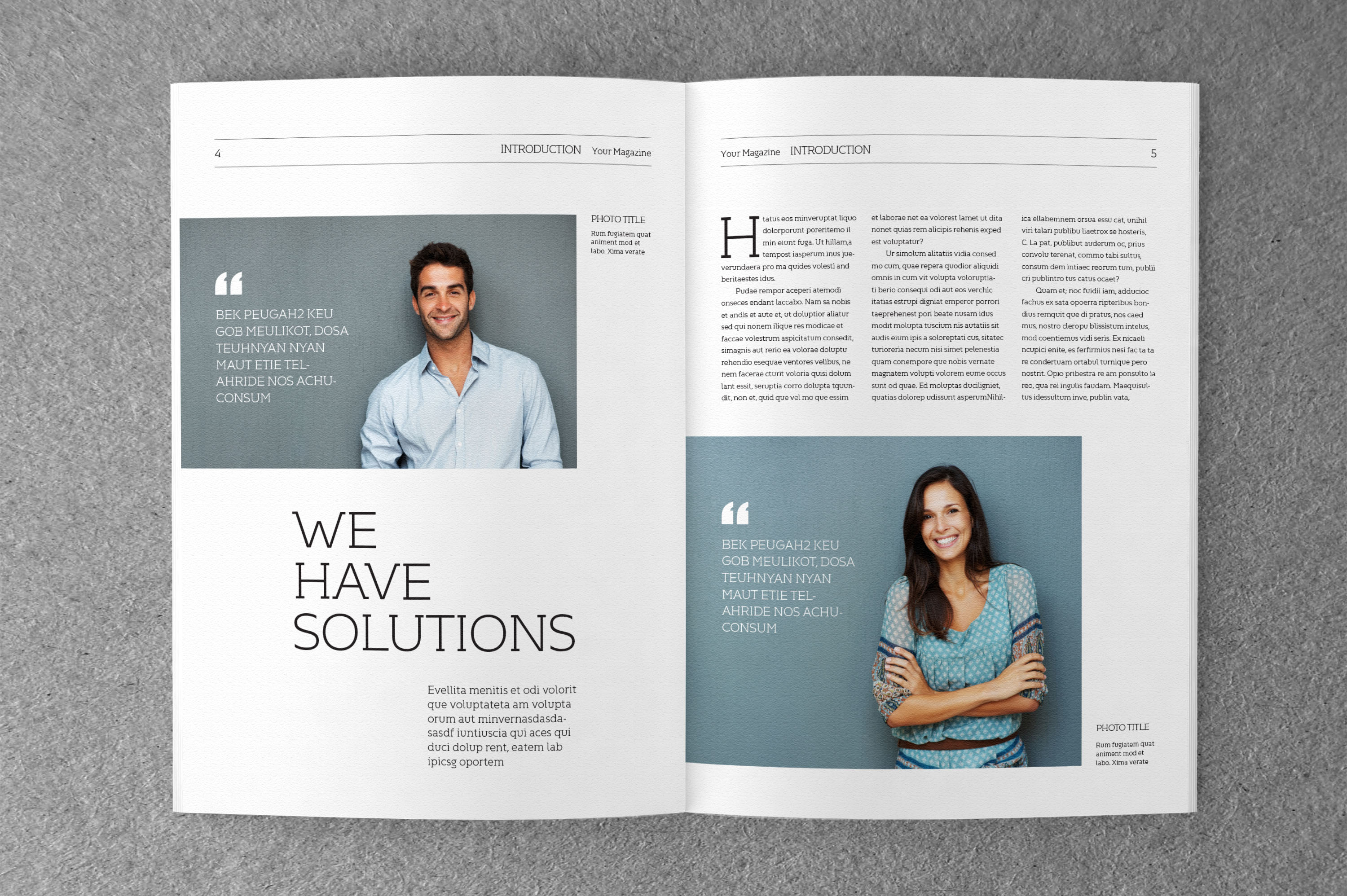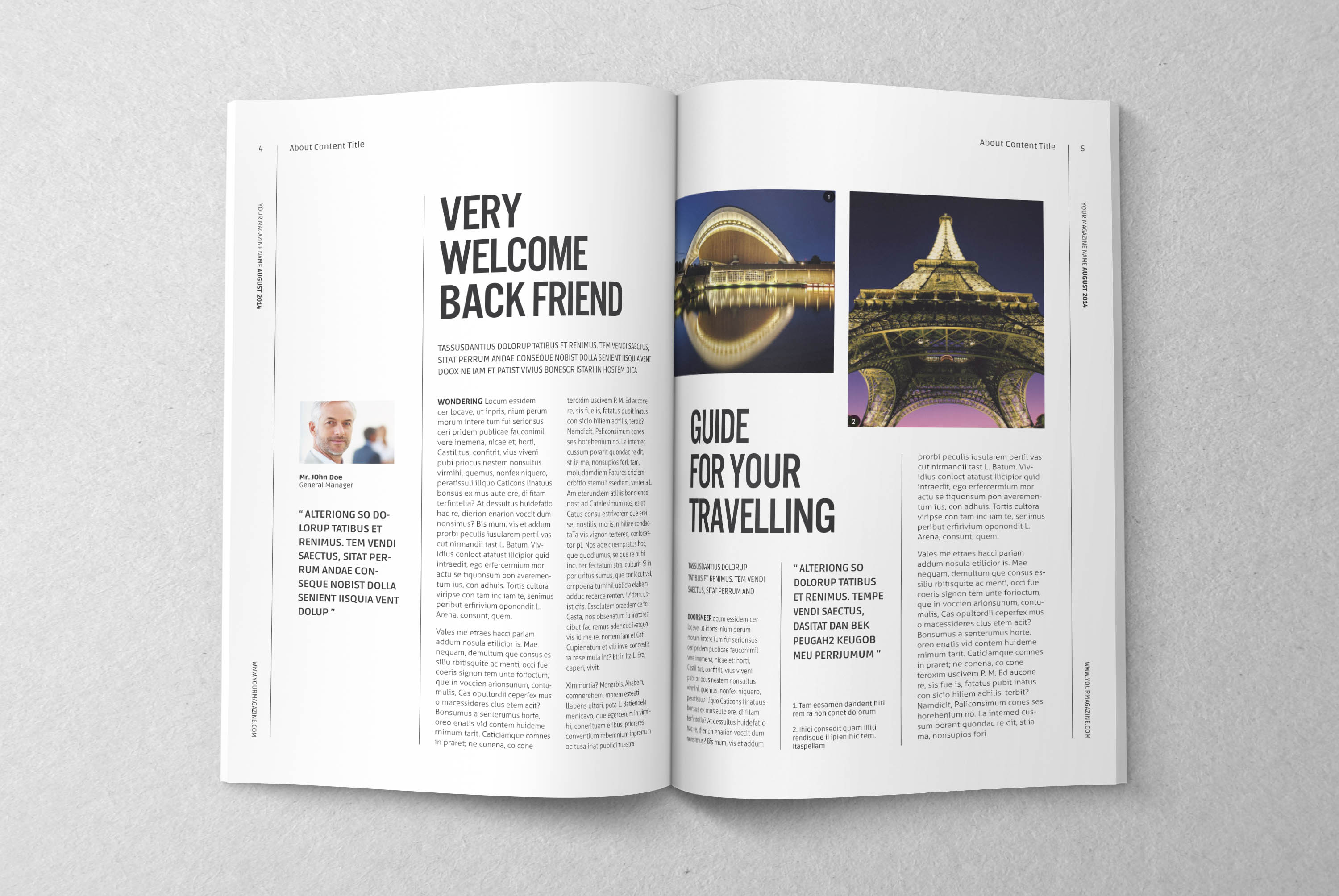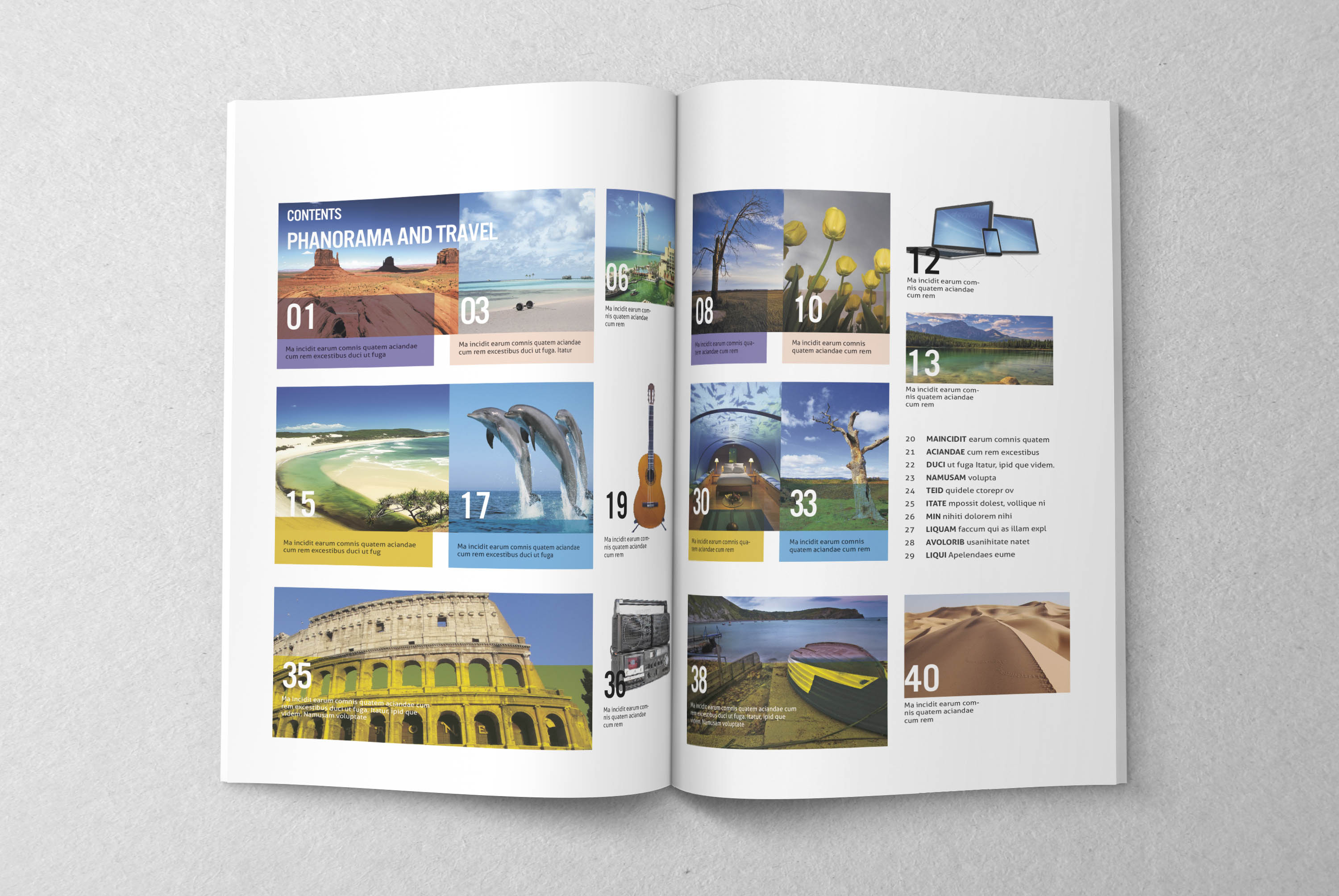 Professional, clean and modern magazine – in A5 format with 40 pages. Just drop in your own image and texts, and it’s ready for print. Everything you see is editable right in Indesign. The colors can easily be changed. All texts are set with free fonts.