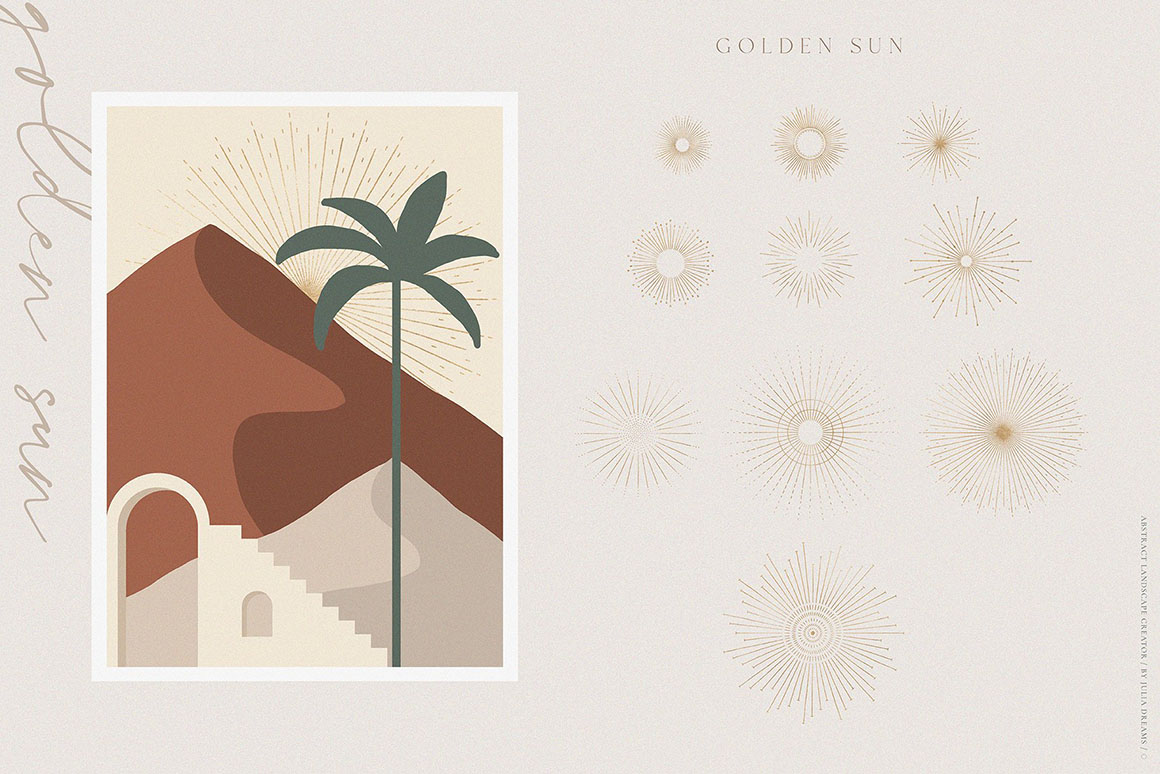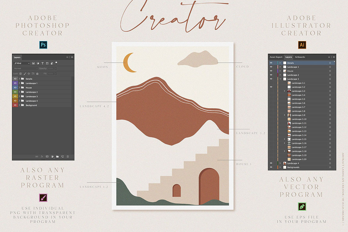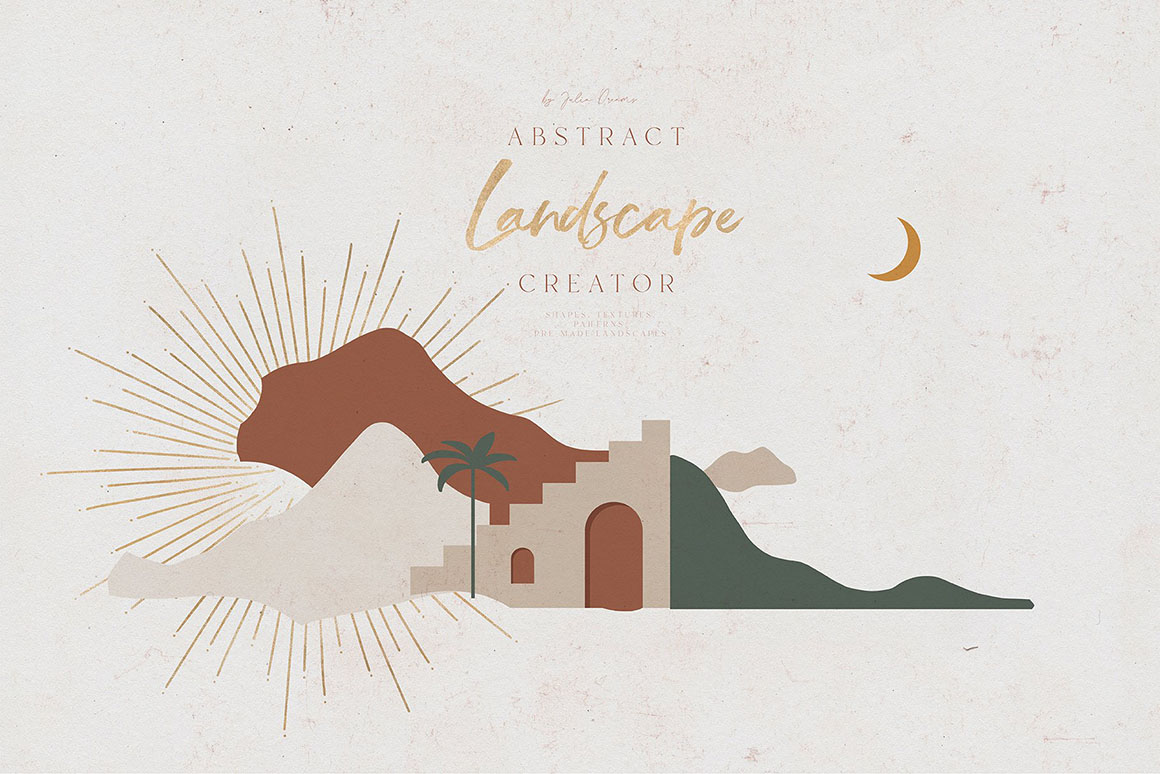 Desert and Mountains, Hills and Roads, Sun and Moon create an absolutely emotional atmosphere of the landscape creator collection. Hand painted with love lanscape elements can perfectly complement your project and help create a sophisticated, restrained and fashionable style. All these elements can make a special atmosphere in your project: from wedding to stationery branding, from Instagram branding to posters and postcards. Specially designed creator for Illustrator and Photoshop for convenient use. Use ready-to-use landscapes or create your own individual composition using all these elements.