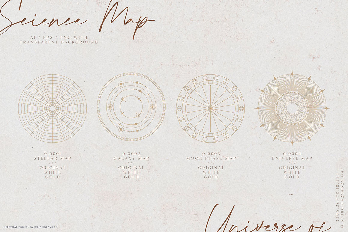 - 4 Science Maps – ai, eps and png [ gold, white & original] with transparent background;