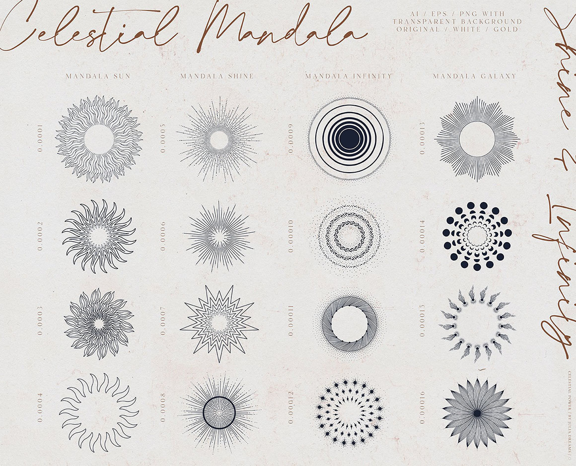 - 16 Mandala Elements – ai, eps and png [ gold, white & original] with transparent background;