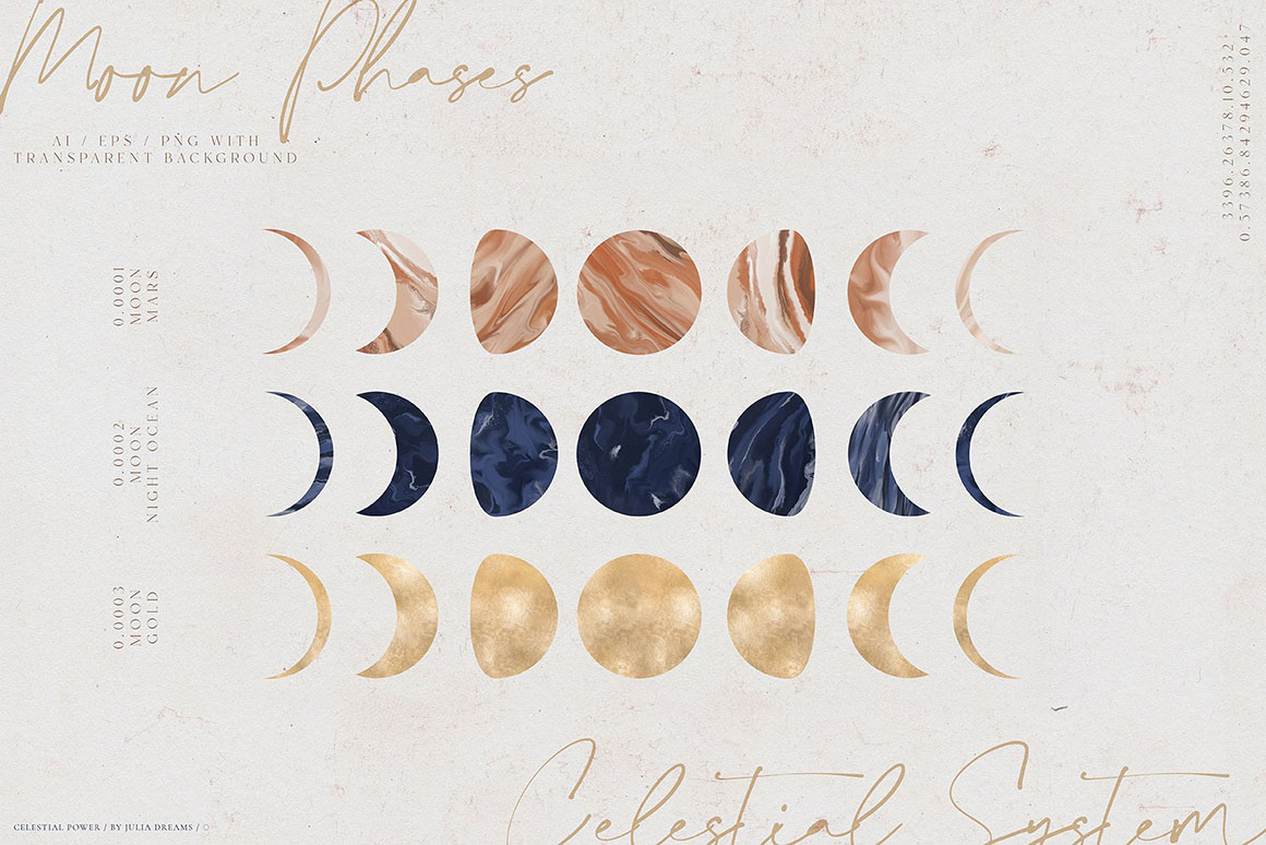 - 7 Moon elements – ai, eps and png [ gold, night, mars & original] with transparent background;