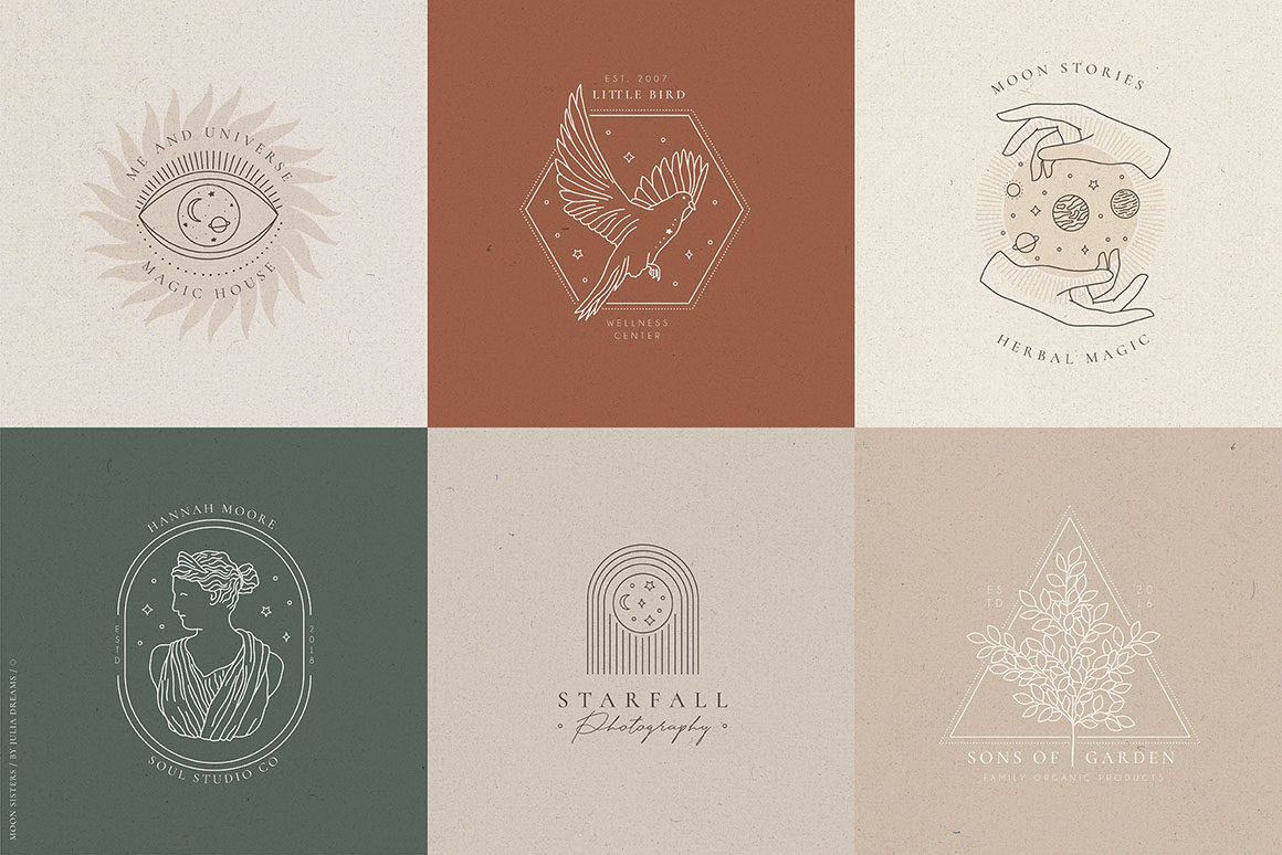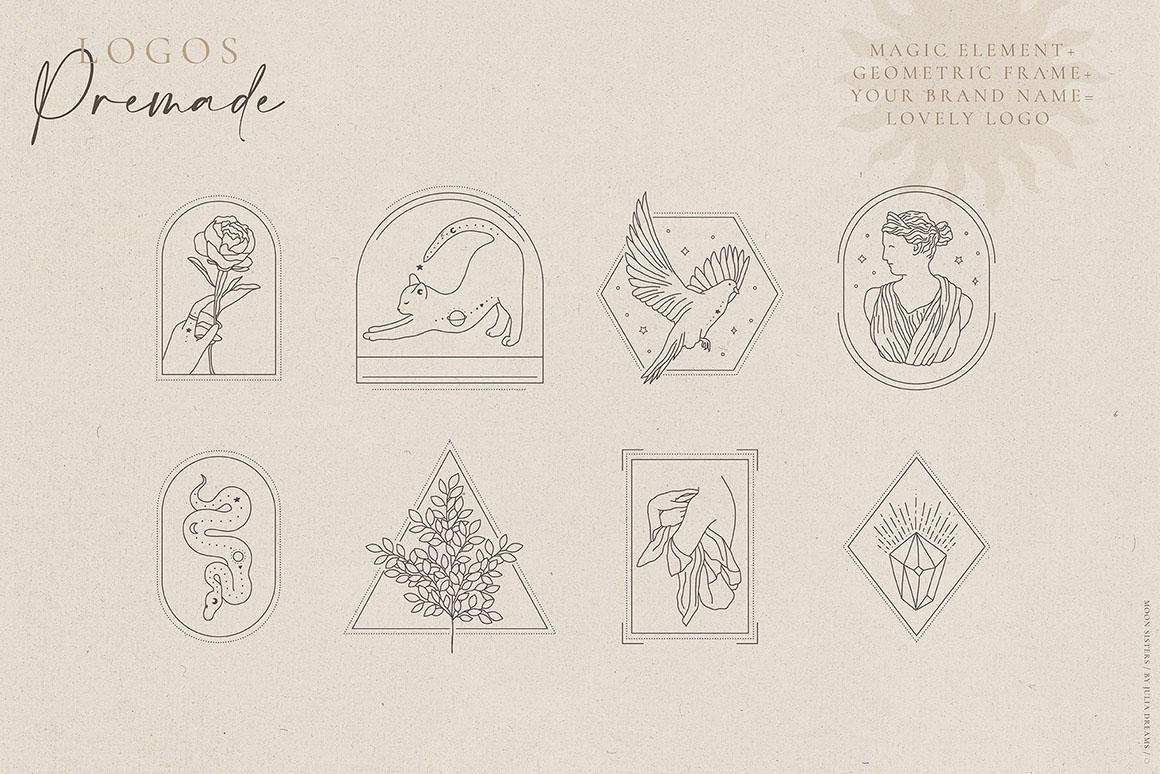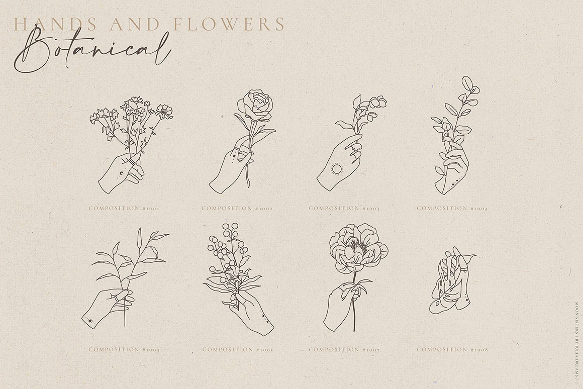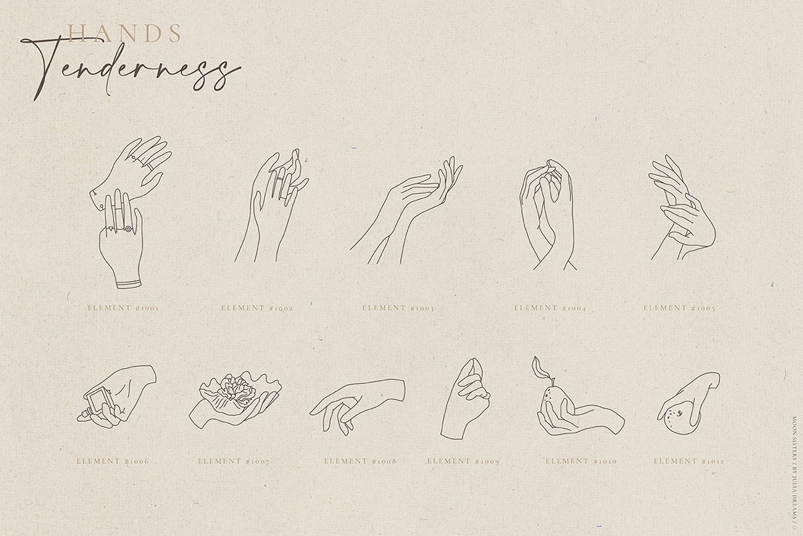 Moon and Bird, Flower and Cat, Hands and Universe create an absolutely emotional atmosphere of the collection. Hand painted with love elements can perfectly complement your project and help create a sophisticated, restrained and fashionable style. All these elements can make a special atmosphere in your project: from wedding to stationery branding, from logo to posters and postcards. This collection was carefully crafted and great attention was paid to details. It consists of different pre-made logos, botanical elements, hands, instagram highlights that can be used individually or combined with other elements. Use ready-to-use logos and compositions elements or create your own individual logo using all these elements.