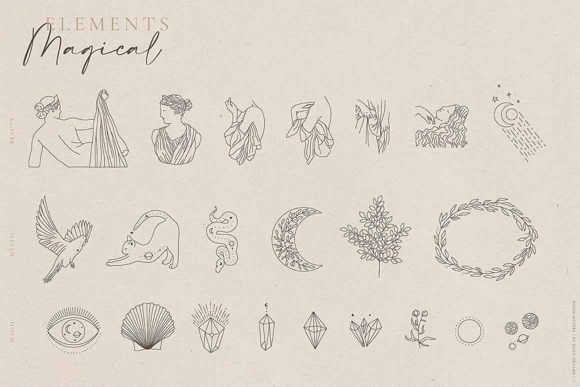 Need some modern & trendy style illustrations with megic or celestial style? Whatever the case, this amazing illustration or artistic graphics bundle with lot of handdrawn illustrations, elements & patterns is great source for all print or branding designers…. These graphics are in hi-res PNG or vector AI, EPS format so all are great for your new web design or any print design projects. Enjoy 😉