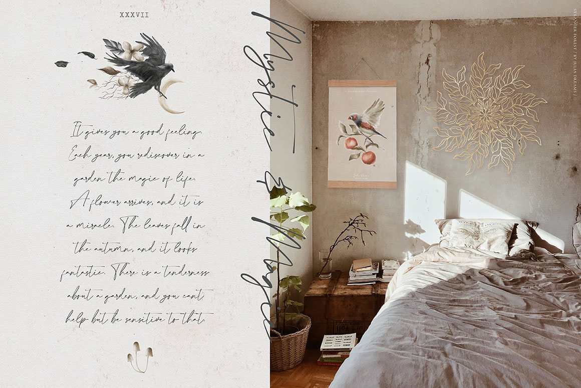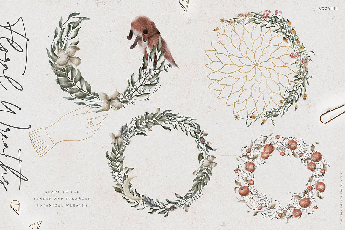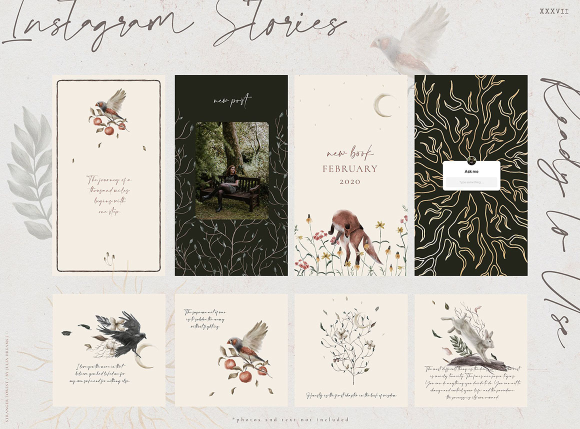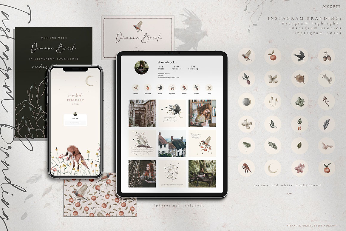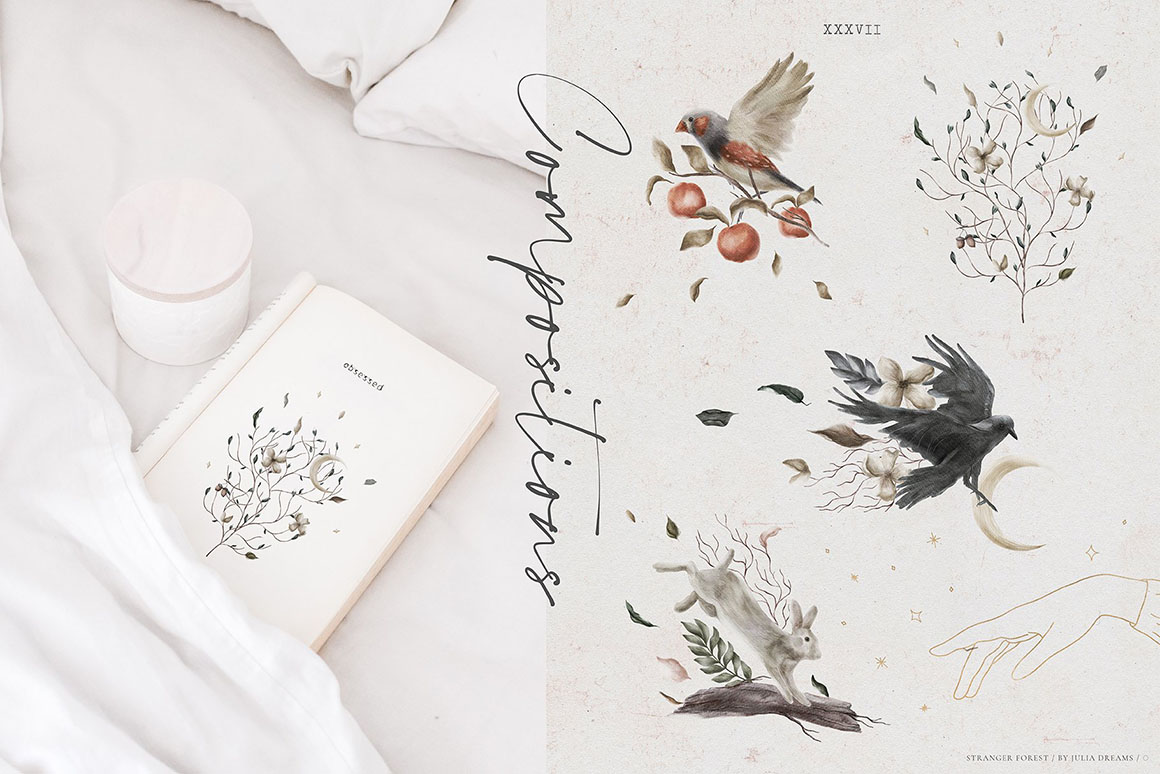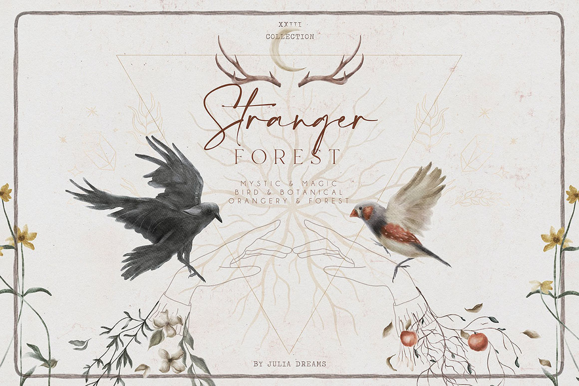 Mystic and Magic, Bird and Botanical, Orangery and Forest – all these elements are the atmosphere of this beautiful collection. Hand painted with love elements can perfectly complement your project and help create a sophisticated, restrained and fashionable style. All these elements can make a special atmosphere in your project: from wedding to stationery branding, from logo to posters and postcards. This collection was carefully crafted and great attention was paid to details. It consists of different instagram branding elements, botanical elements, animals, patterns that can be used individually or combined with other elements.