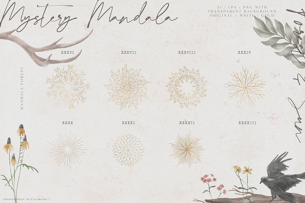- 8 Mandala Elements – ai, eps and png [ white, gray & gold ] with transparent background;