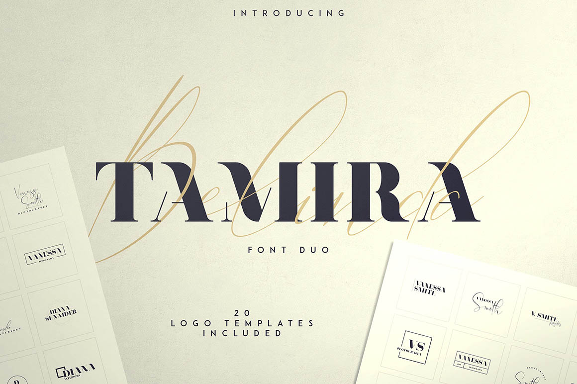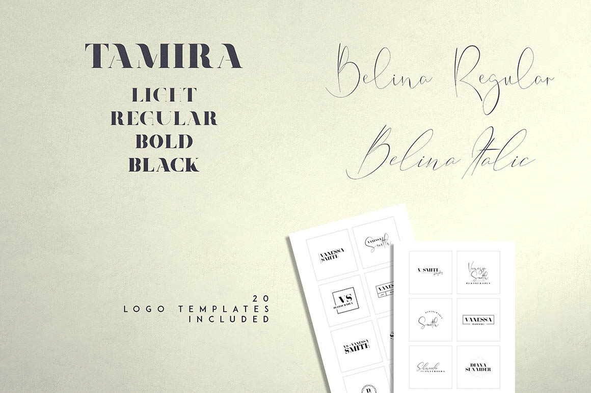 21. Belinda Tamira – Font duo + 20 Logos from VPcreativeshop