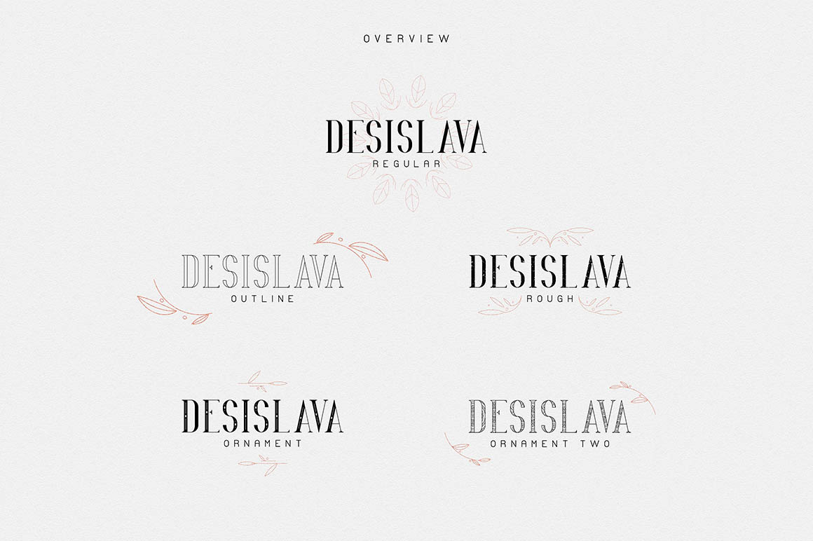 Desislava is perfect for branding projects, home-ware designs, product packaging, magazine headers – or simply as a stylish text overlay to any background image.