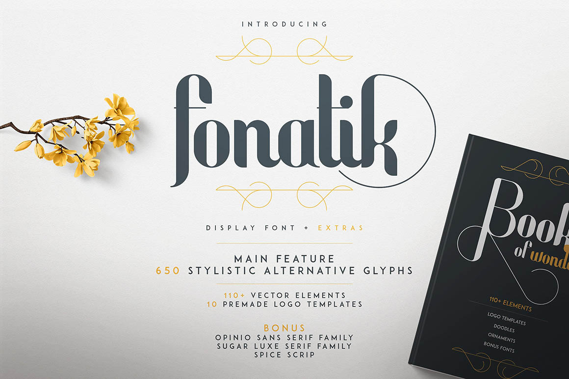 Fonatik is elegant, clean font with 650 stylistic alternative glyphs, 110+ vector elements, 10 premade logo templates, 3 bonus font families and multilingual support. It’s a very versatile font that works great in large and small sizes.
