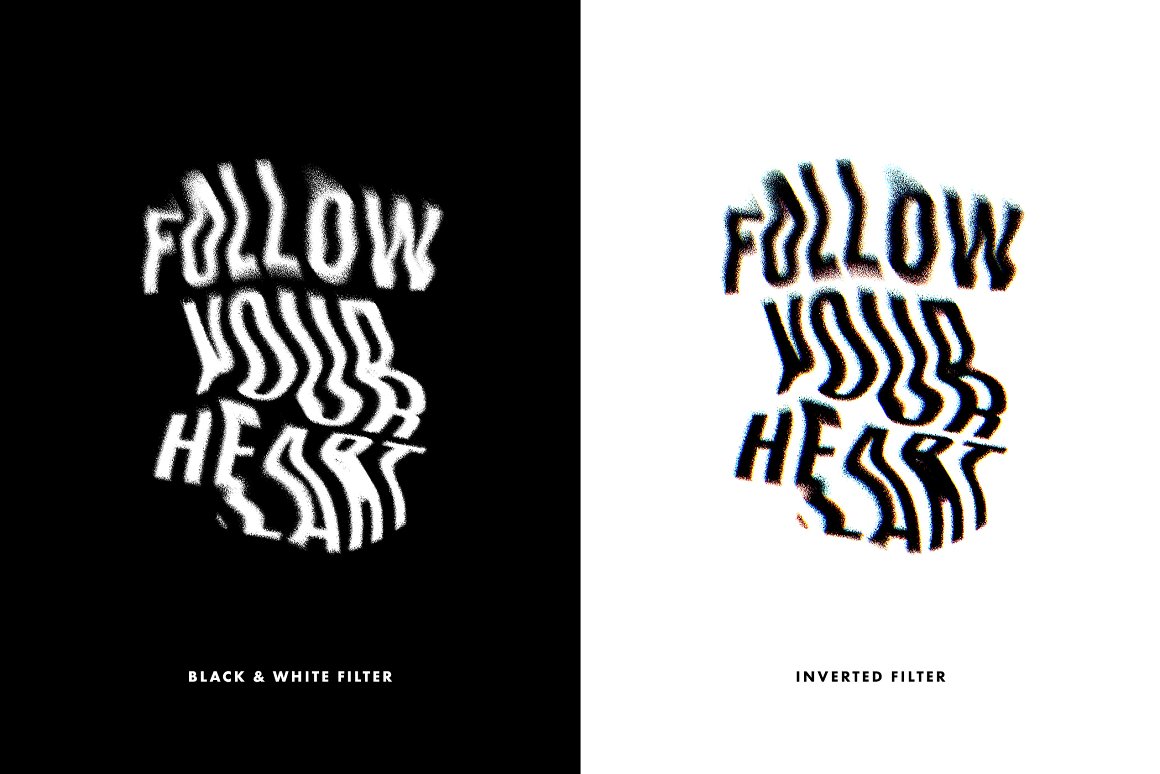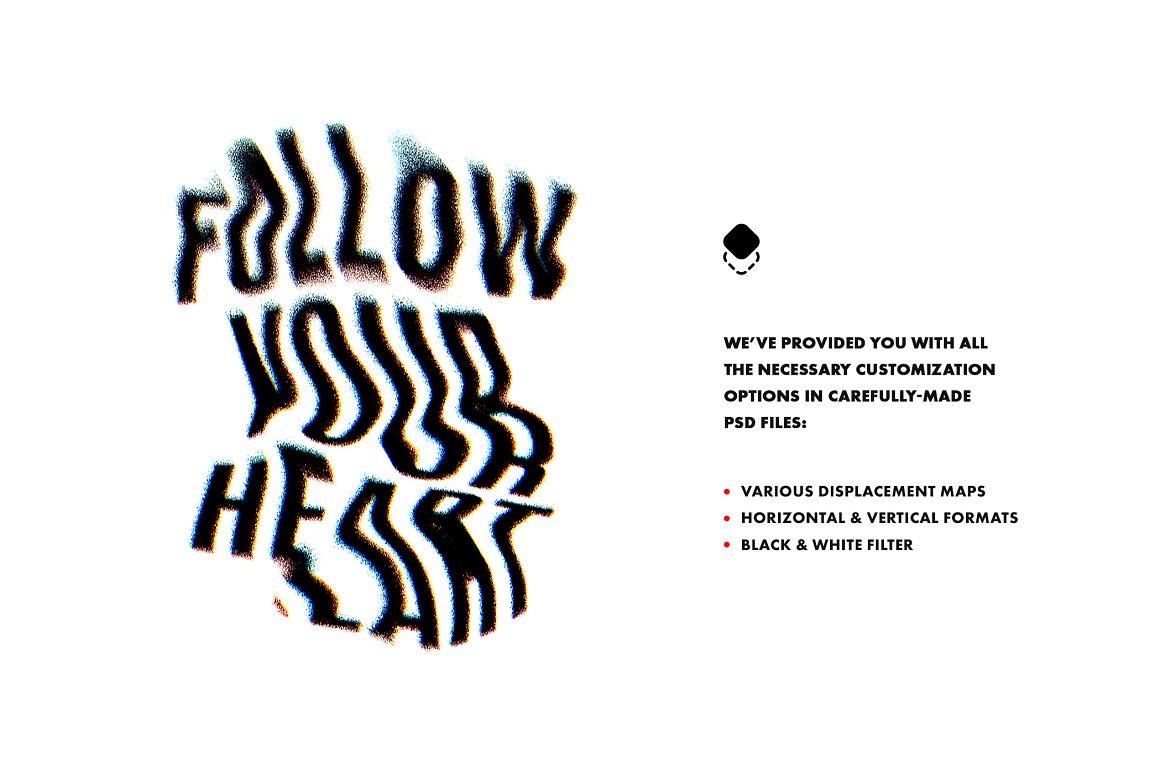 Enjoy watching the gravitating typography getting distorted as you apply the chromatic glitch effect. The package comes as 6 PSD displacement maps (3 vertical and 3 horizontal ones). Create a cyberworld tribute with dark black & white filter, where every detail is trembling with broken psychedelic pixels. Yet, if you need to focus on the photocopy twist more, you can turn off the colored glitching elements and make it all about a ”broken scanner” result. Carry out spectacular futuristic posters, captivating merch, cosmic banners and newsletters, attention-getting ads and bold branding concepts.