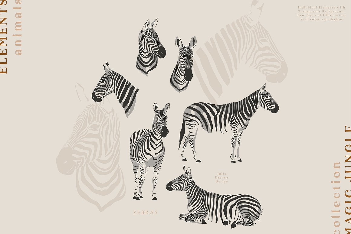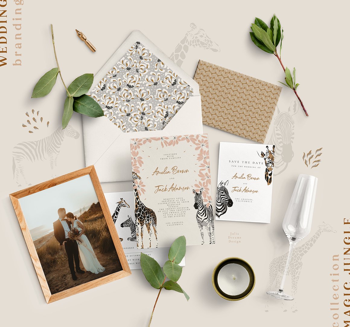 Magic & Wild Jungle time! Illustrative and realistic animals create a fashionable, delicate and at the same time restrained style for your project. This is a great addition to create wedding branding, stationery, greeting card, photo frames and other beautiful things. Just add ready-made graphics: patterns and compositions. But also a big variety of individual elements: illustrations, decorative and floral elements. These graphics are ideal for the creation of the corporate identity of your shop or your small store. Or if you suddenly need to decorate your room or create a wedding invitation. Add this beautiful hand painted elements and florals to create a postcard.