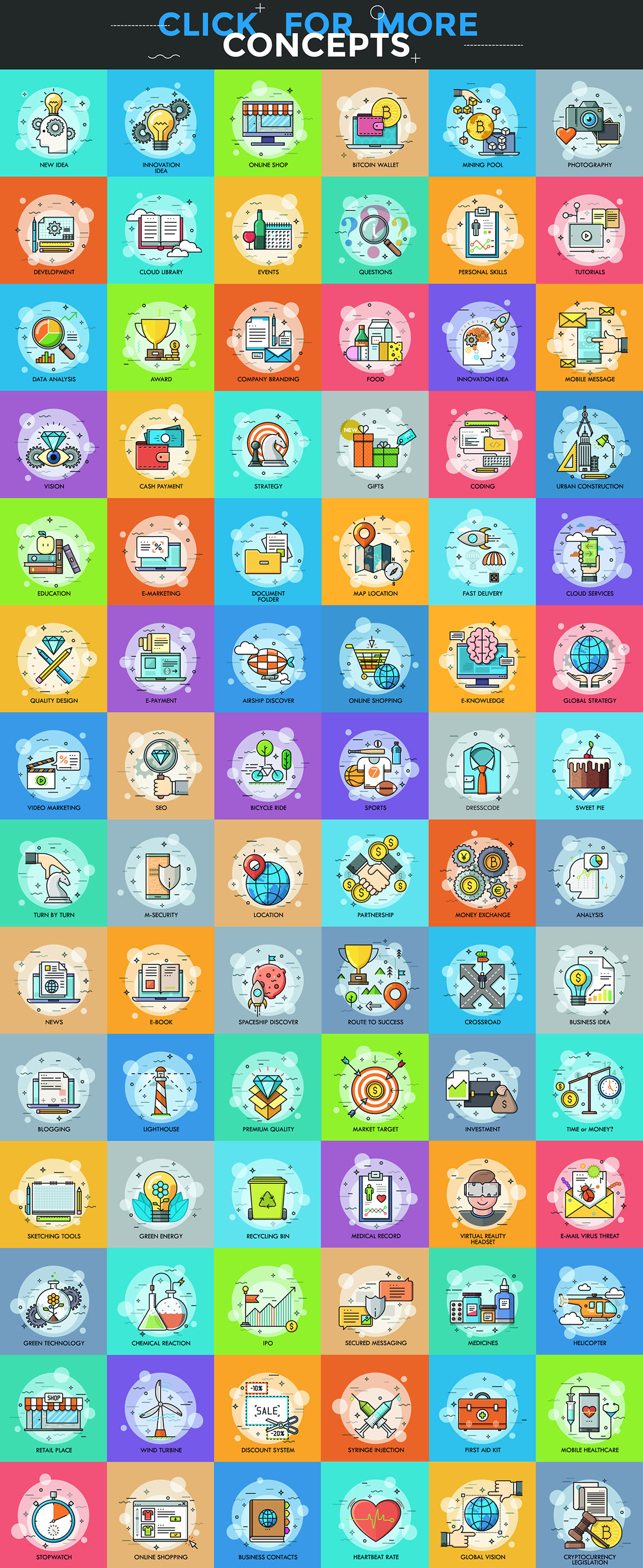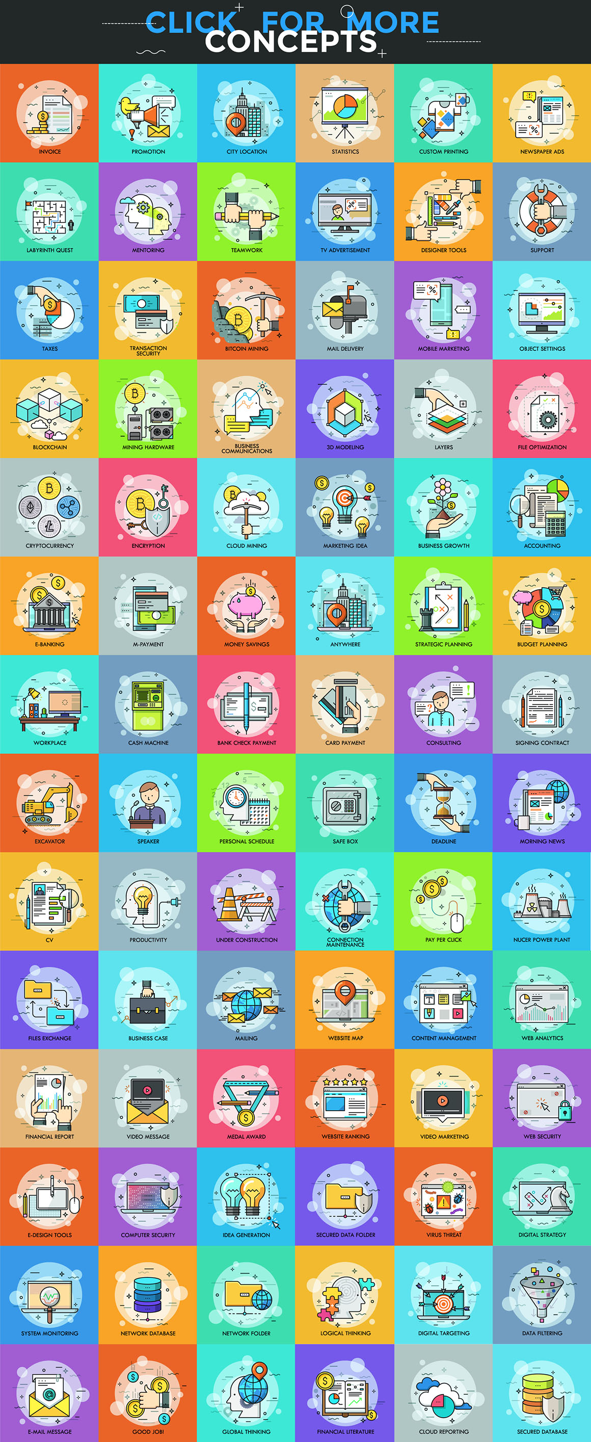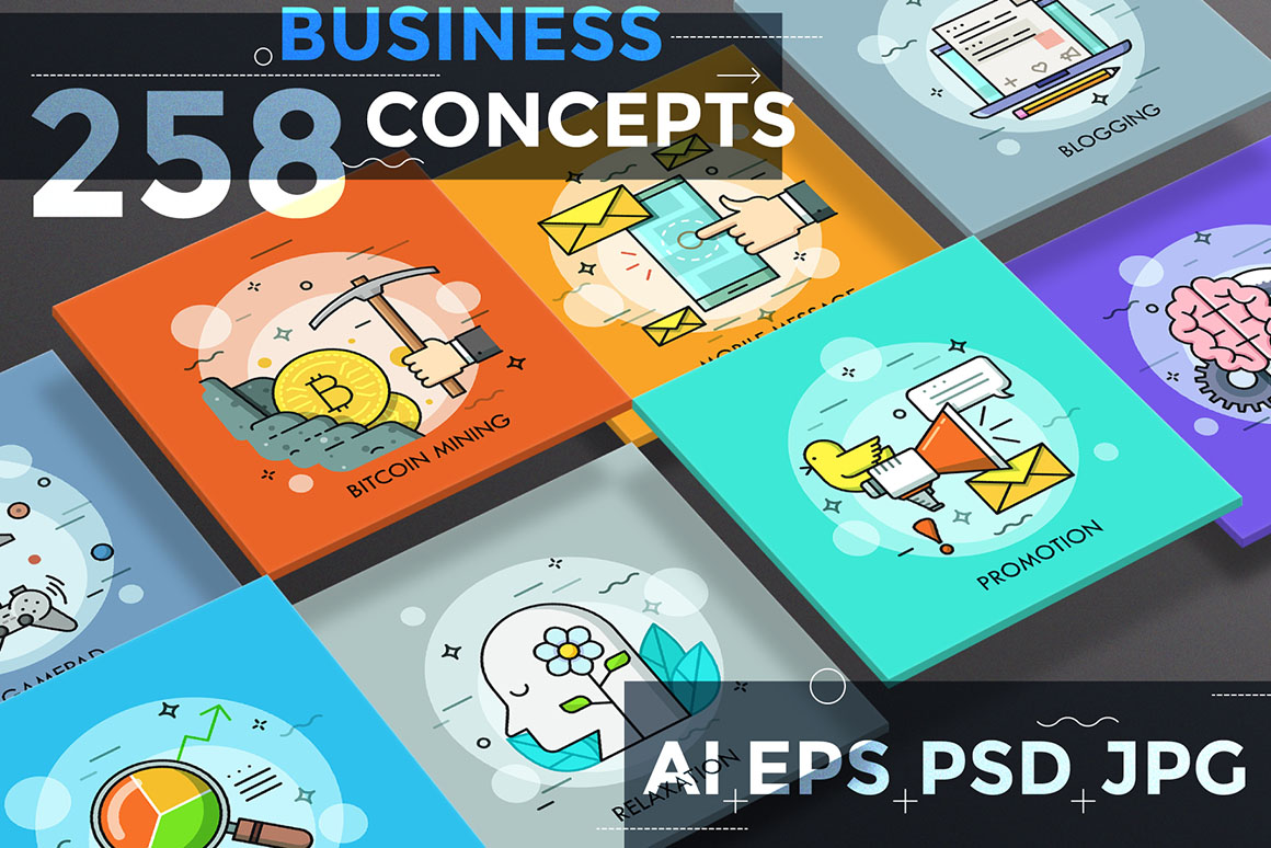 01. Set of Thin Line Business Concepts from AndrewKras Set of Thin Line Business & Marketing Concepts includes 258 thin line flat design style cartoon icons/banners for business service and support, company presentation and information, business startup, planning and strategy, market research, marketing and advertising, digital marketing, social media and networking, finance and banking, e-commerce and shopping, cryptocurrency mining, online payment, teamwork and workflow, human resources and career, communication, graphic and web design, web and app development, seo, health care, education, apps, games, print materials, online training and courses. Set of flat line design vector illustration concepts for website and mobile websites banners, and printed materials. Included: