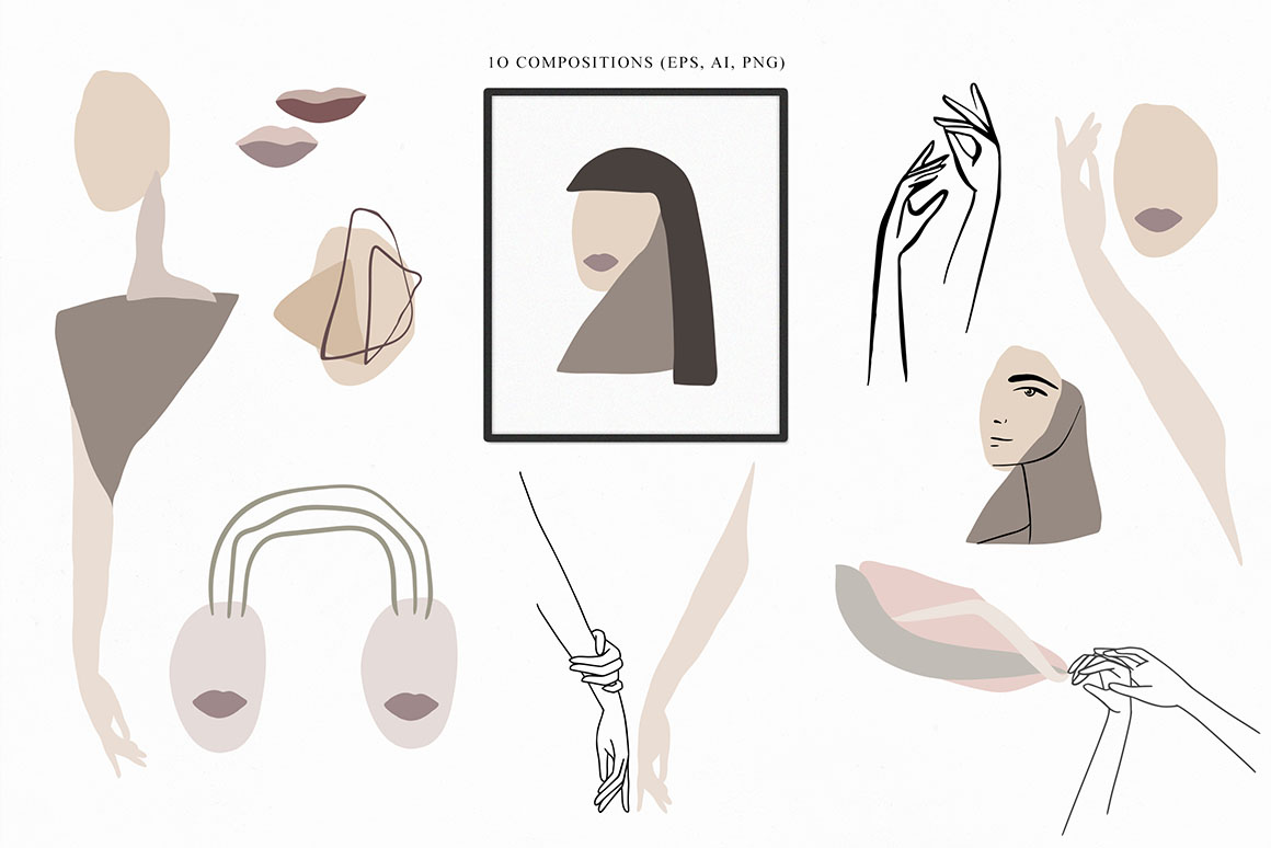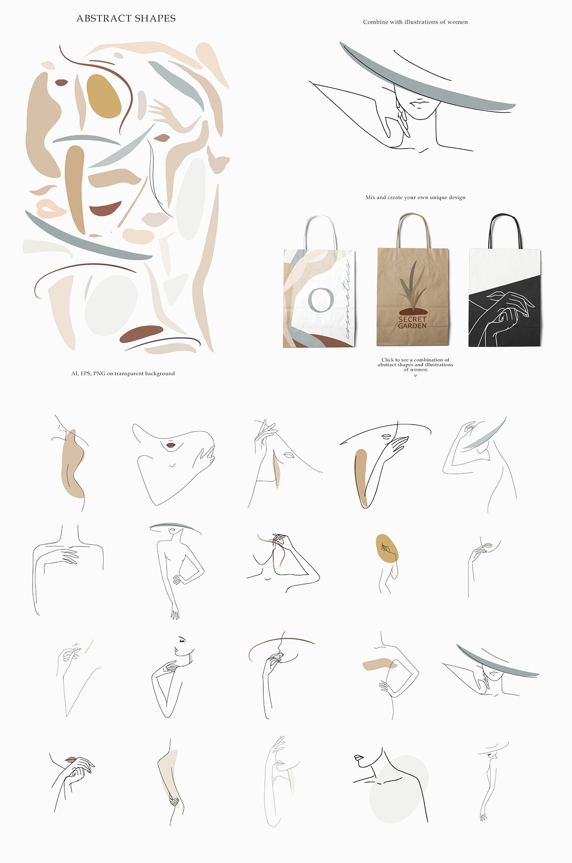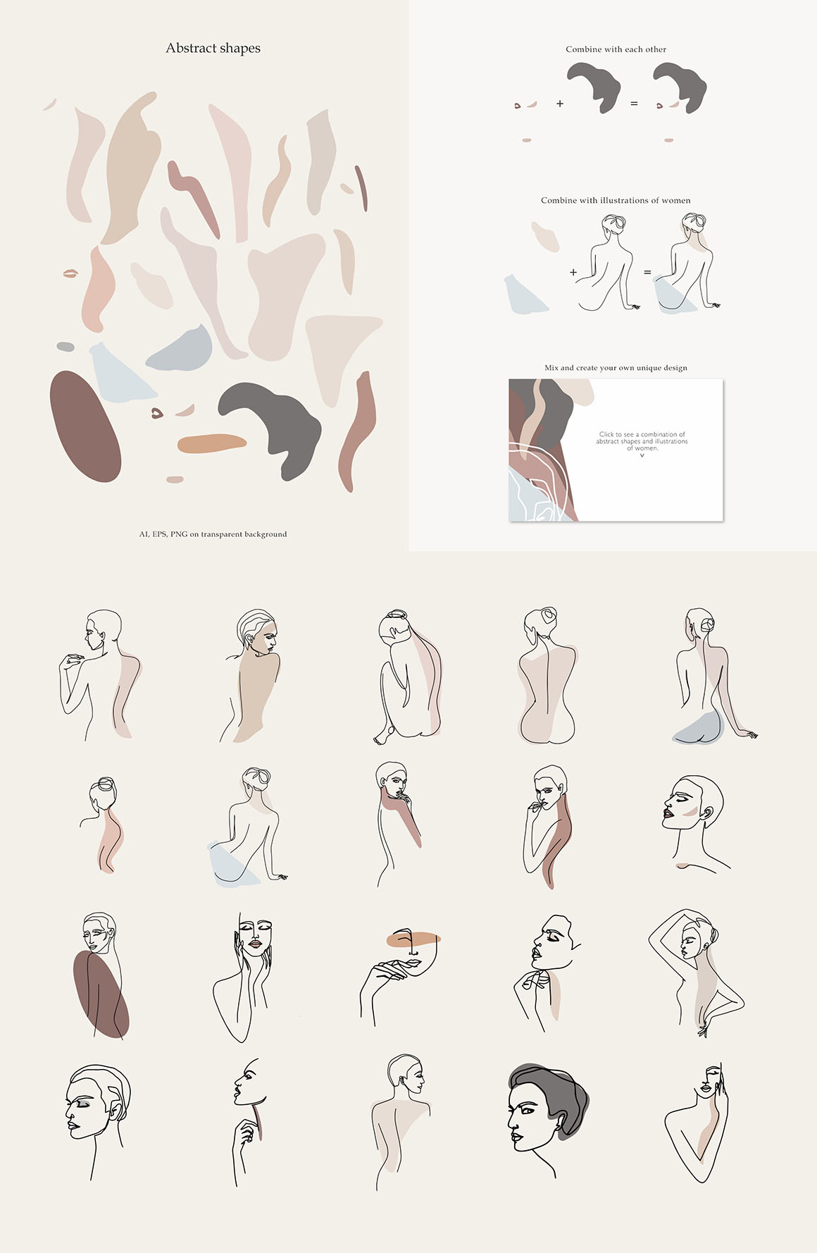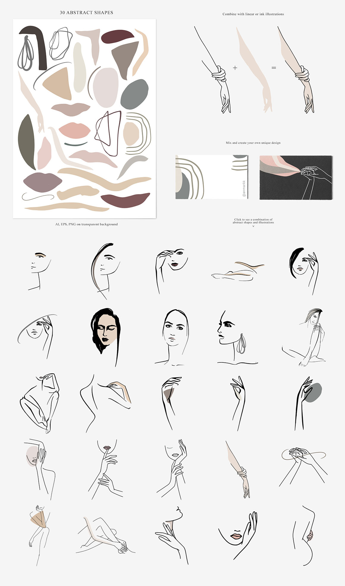 This Line Art BUNDLE is packed with over 1700 items from 10 graphic collection (one of them is Abstract women CREATOR). Female silhouettes, fashion elements, accessories, floral elements, one-line graphics, abstract shapes, female, male and children’s hands and much more. This BUNDLE is perfect for logo, posters, wall art, branding, packaging, wedding decor, magazines, book cover, cosmetic business, social media, greeting cards, flyer, banner, web header, collages, scrapbooking, craft and DIY projects, blogs, postcard and many more. In addition to PNG files, each collection includes a vector format (AI and EPS).