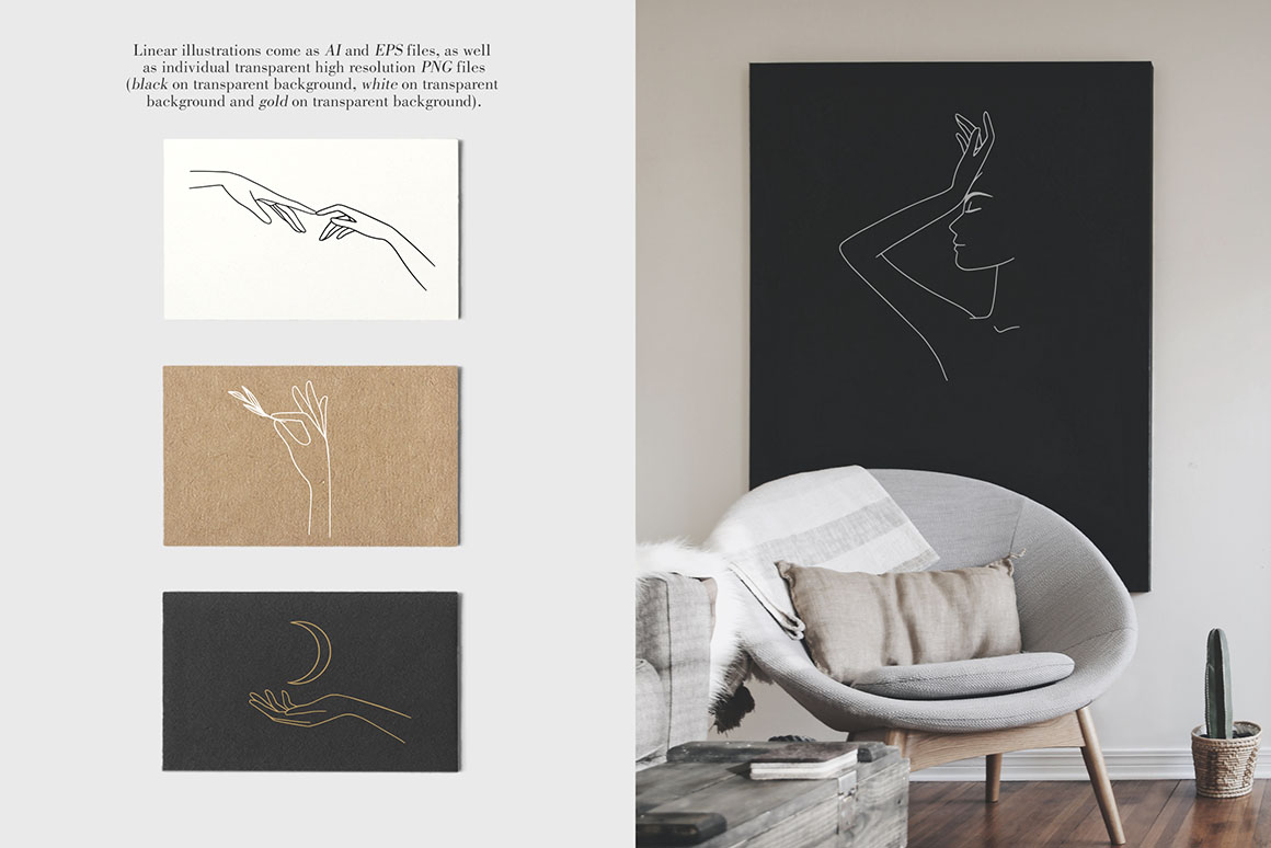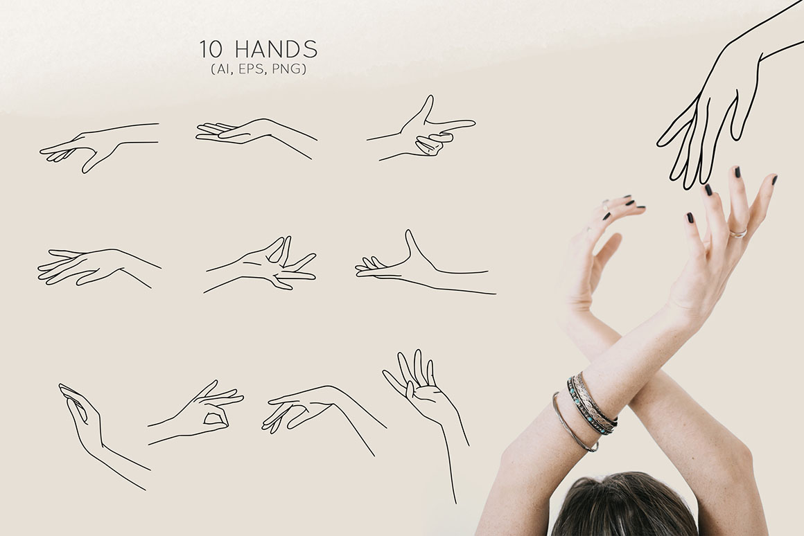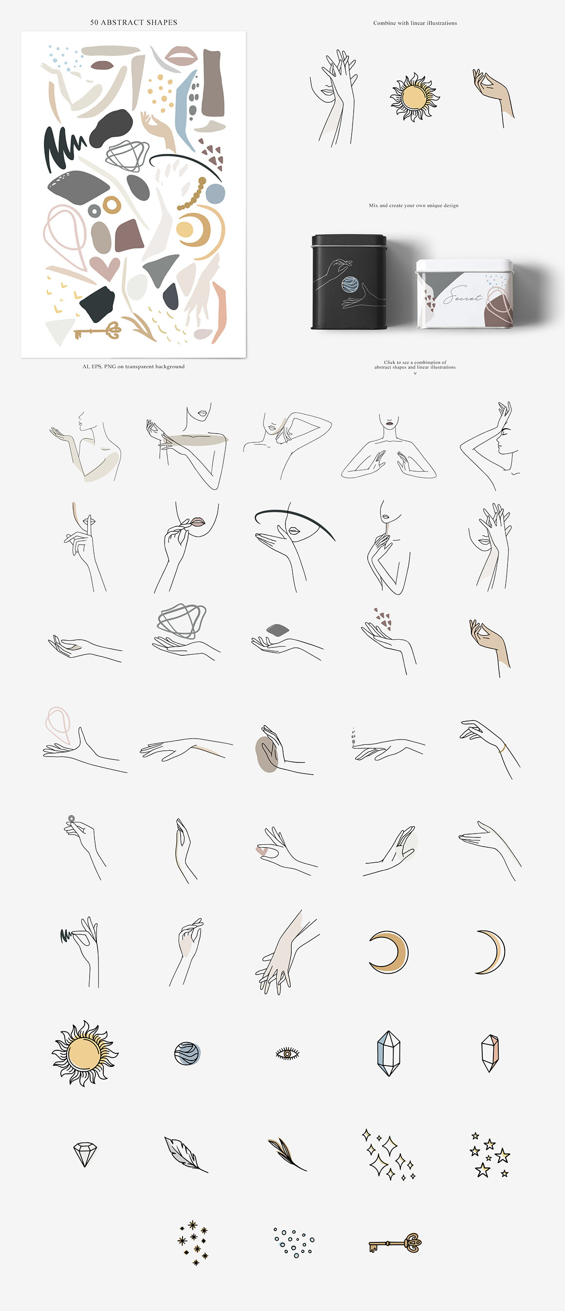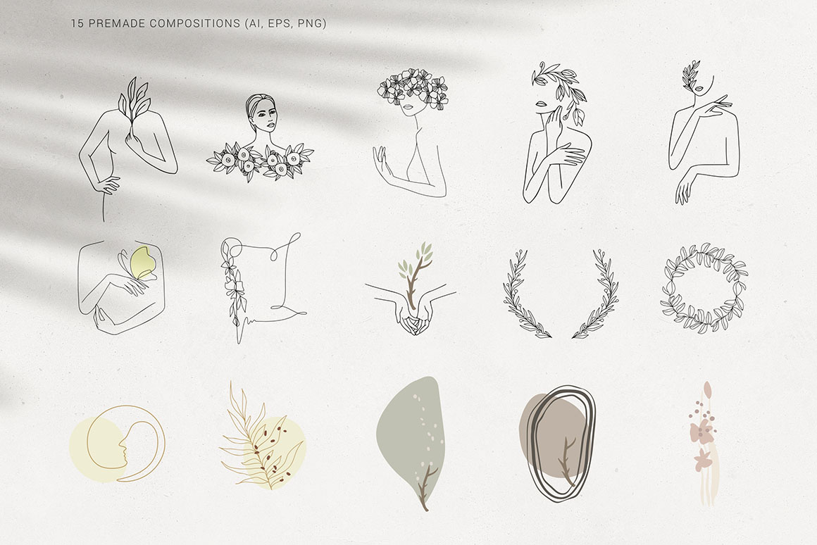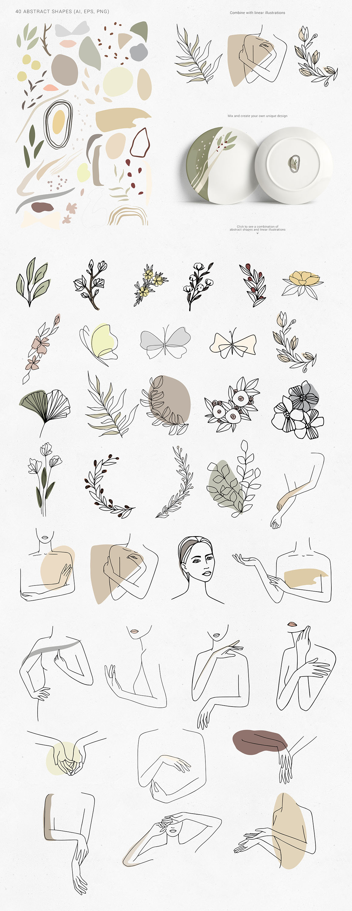 This Line Art BUNDLE is packed with over 1700 items from 10 graphic collection (one of them is Abstract women CREATOR). Female silhouettes, fashion elements, accessories, floral elements, one-line graphics, abstract shapes, female, male and children’s hands and much more. This BUNDLE is perfect for logo, posters, wall art, branding, packaging, wedding decor, magazines, book cover, cosmetic business, social media, greeting cards, flyer, banner, web header, collages, scrapbooking, craft and DIY projects, blogs, postcard and many more. In addition to PNG files, each collection includes a vector format (AI and EPS).