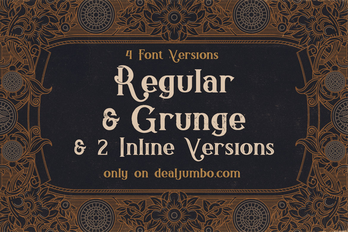 Bold & inline retro or vintage display serif – free font from Jumbo Design. Only basic characters in 4 font versions: Regular & Grunge + Inline & Inline Grunge. Download & enjoy 😉 Exclusive only for dealjumbo!