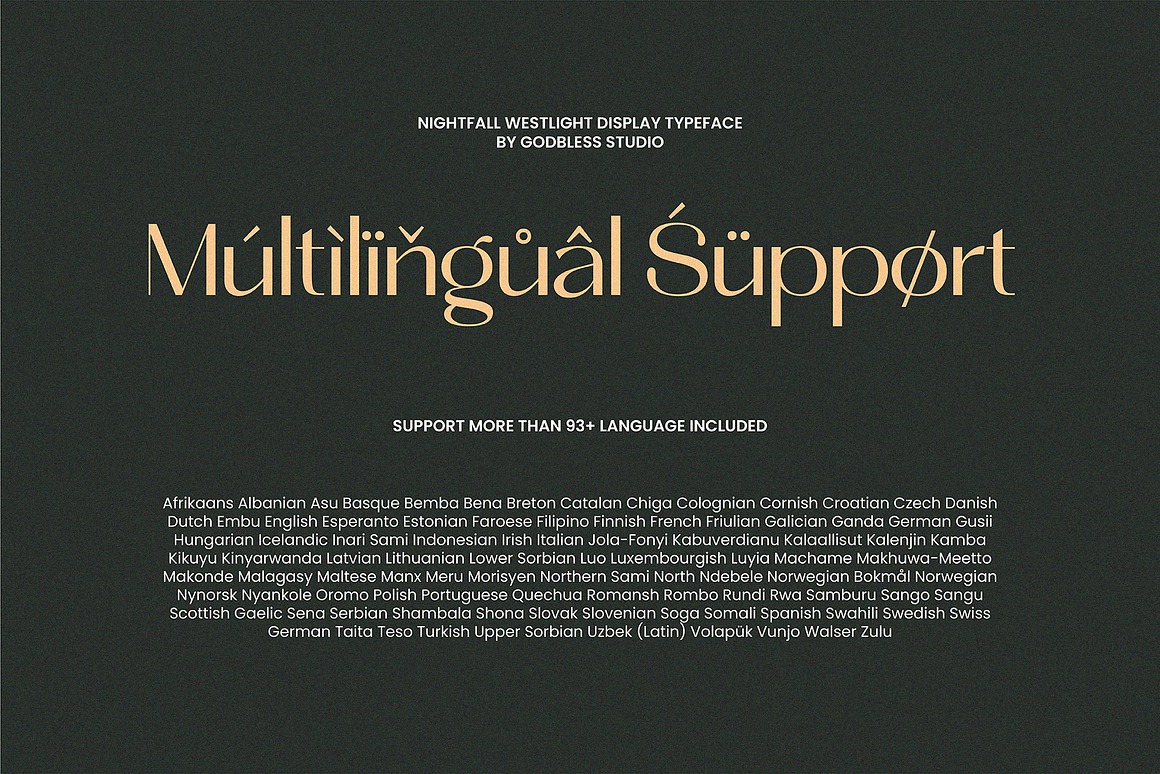 Introducing Nightfall Westlight, a modern sans display typeface designed to capture both boldness and elegance. With its clean lines, refined details, and italic style option, this font is built to elevate your design projects with a contemporary and professional edge. Crafted for standout headlines, branding, and eye-catching visuals, Nightfall Westlight is the perfect blend of clarity and character. Versatile and stylish, Nightfall Westlight is ideal for a wide range of uses—from logos, posters, packaging, and apparel designs, to social media graphics, editorial layouts, and digital projects. The font comes in Regular and Italic, giving you flexibility to adapt your designs for different moods and contexts. What makes it even more powerful is its set of alternates, allowing you to experiment with multiple styles and add unique flair to your typography. Plus, with multilingual support covering more than 90 languages, it ensures global reach and seamless use across international projects.