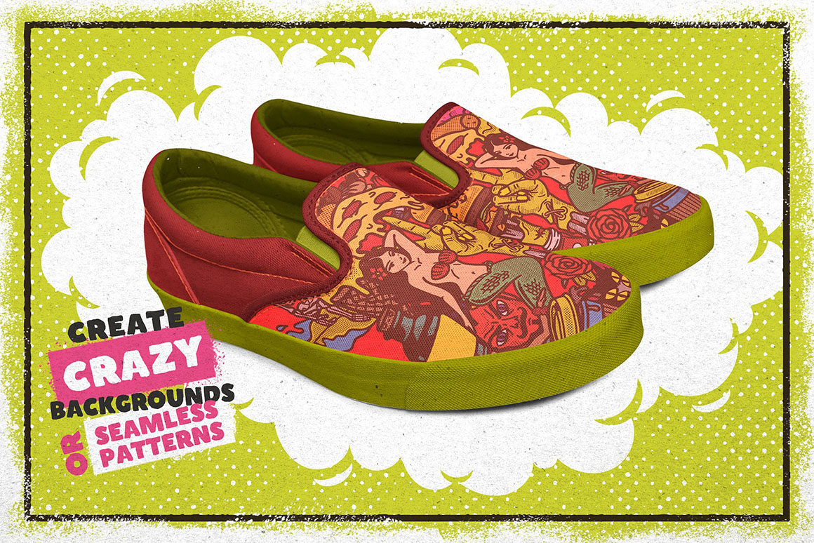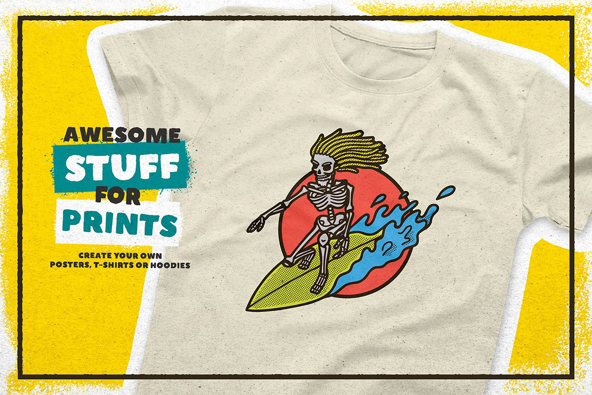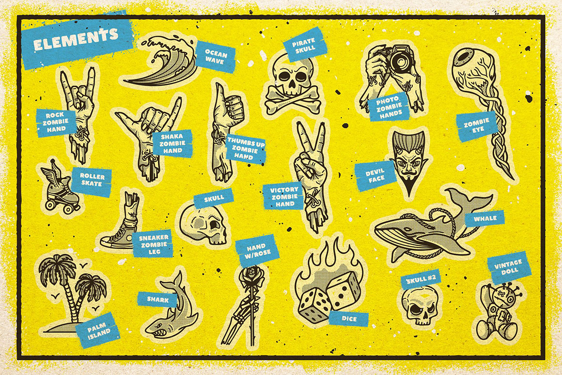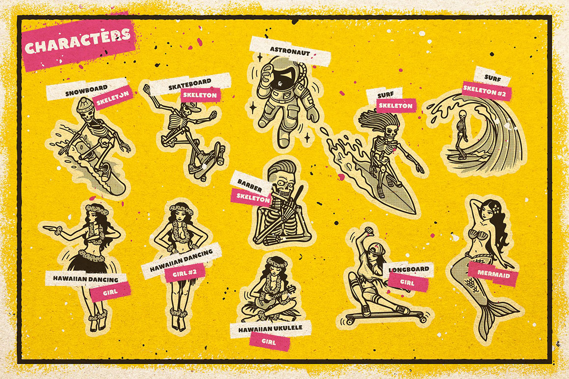 Sixty crazy characters and graphic elements inspired by old school tattoo artist like Sailor Jerry, amazing graphic by Jimbo Phillips, and other vintage things as punk rock album covers, skate and surf brands t-shirt prints etc. Absolutely incredible stuff for all who not indifferent for that time spirit.