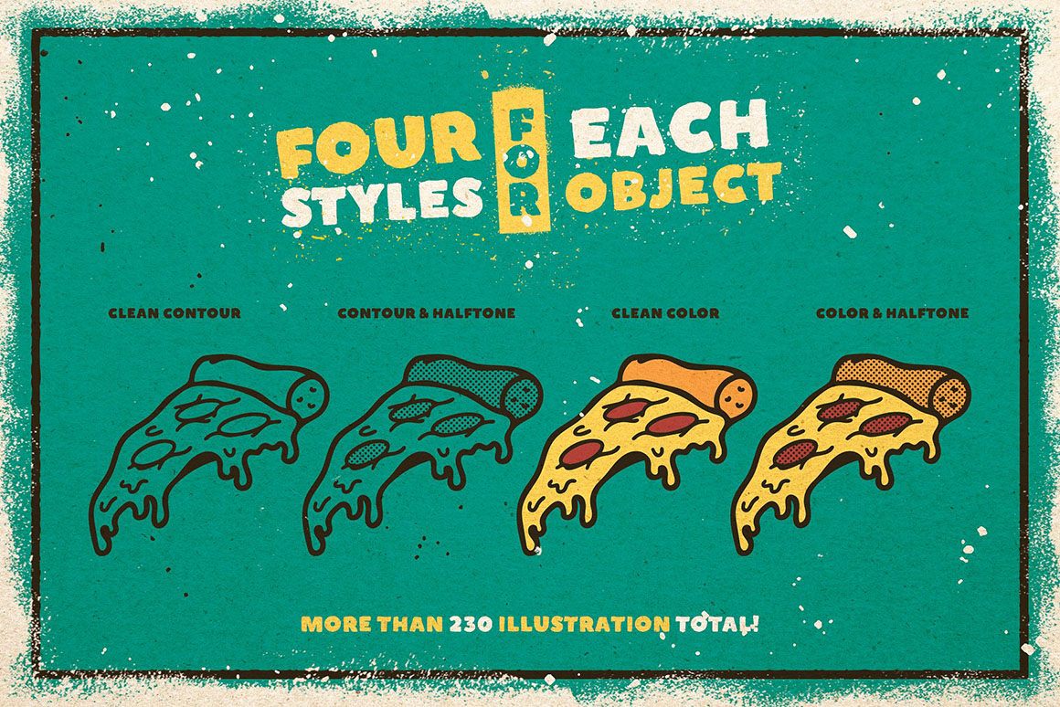 Fully organized in PSD, Ai, EPS & PNG files. Each illustration has four styles: clear contour, contour w/ halftones, clear color, color w/ halftones!
