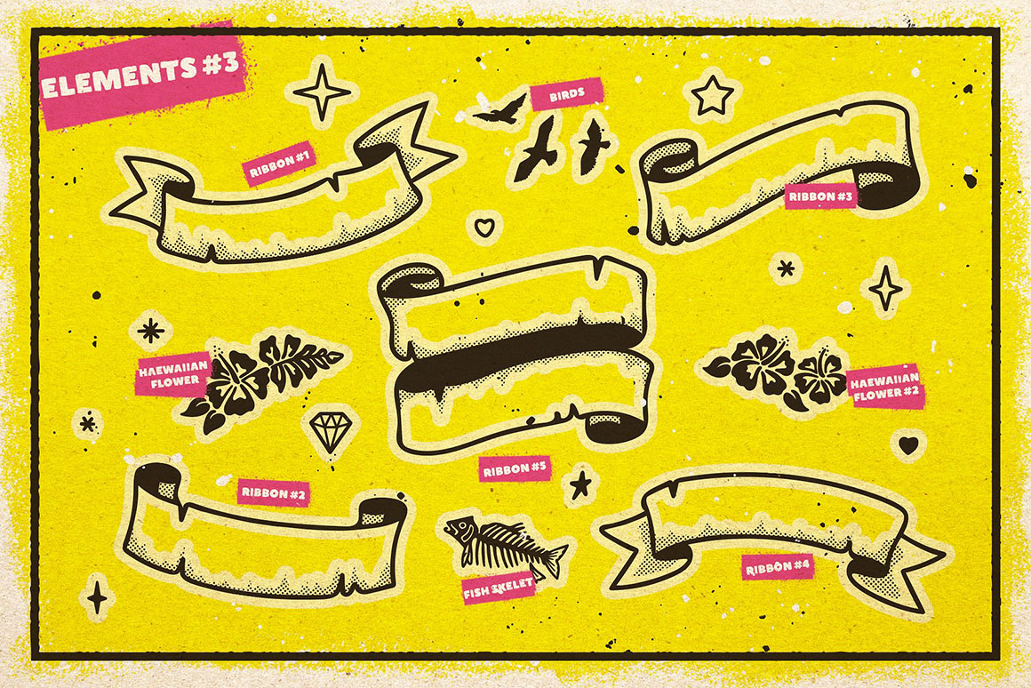 - 60 crazy characters and graphic elements inspired by old school tattoo!