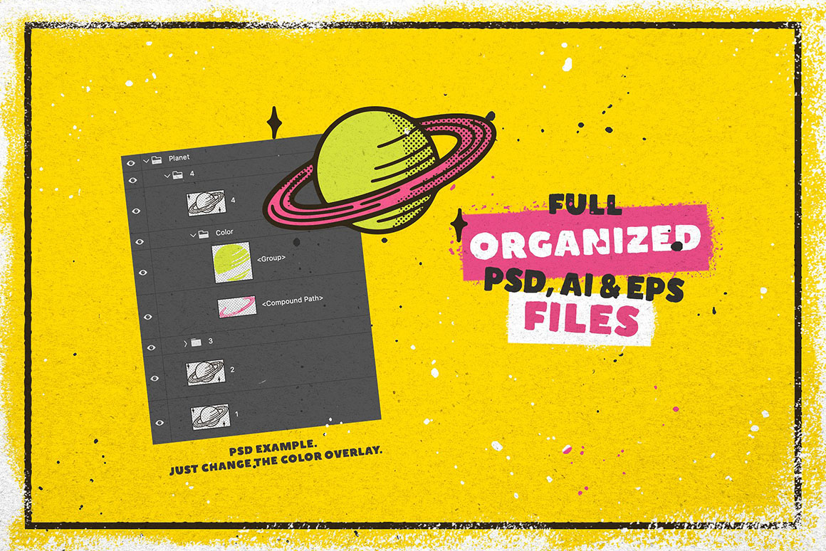 All these illustrations from VintageVoyage are fully organized in PSD, Ai, EPS & PNG files. Each illustration has four styles: clear contour, contour w/ halftones, clear color, color w/ halftones. So, it gives you so many variations to use it in your projects. Also, you can change any color as you want: all colors grouped by elements.