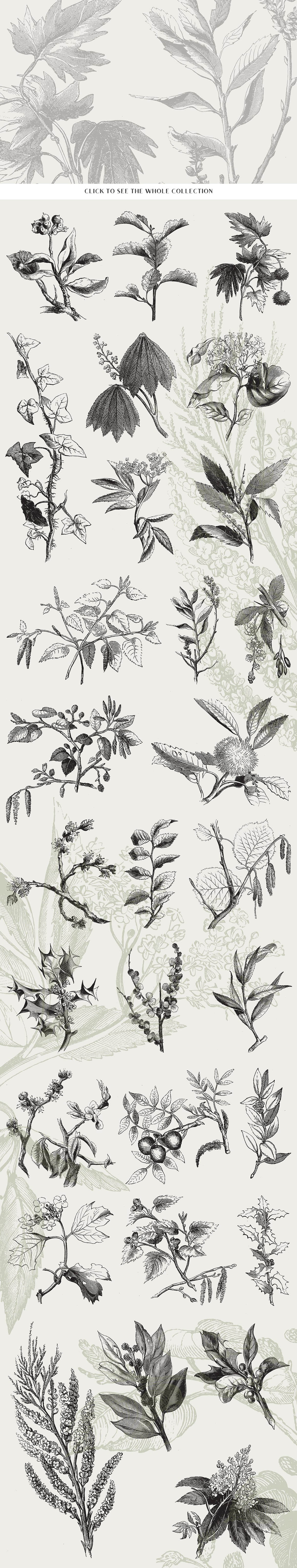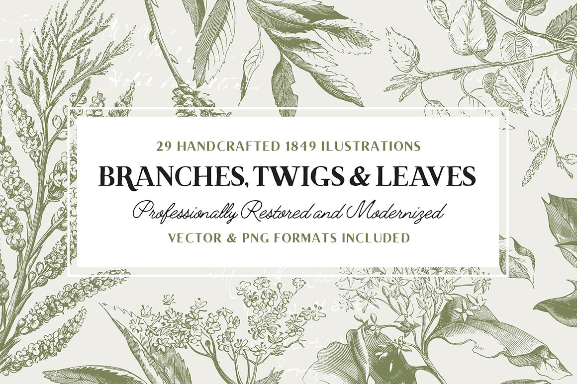 Introducing our Collection of 29 Engraved Illustrations of Branches, Twigs, and Leaves – Available in Both PNG and Vector Formats. Our focus is to collect, restore and repurpose old and forgotten artwork for the modern creator and within this collection, you will find 29 detailed engravings/illustrations of a variety of branches, twigs, and leaves that are perfect for a whole variety of design projects. This set includes the following species of tree – The Elder, Dogwood, Birch, Oriental Plane, Chestnut, Ivy, Holly, Guelder, Huntingdon Willow, Tamarisk, Elm, Barberry, Hazel, Alder, Dutch Myrtle and more.
