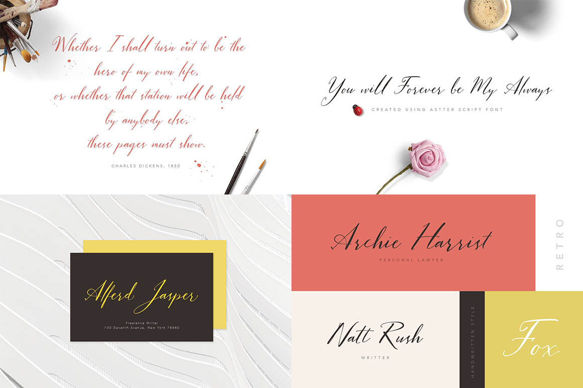 Astter is classic handwritten font, every single letters have been carefully crafted to make your text looks beautiful. With modern script style this font will perfect for many different project ex: quotes, blog header, poster, wedding, branding, logo, fashion, apparel, letter, invitation, stationery, etc. Astter script including ligature, alternate glyph and extra swirl.