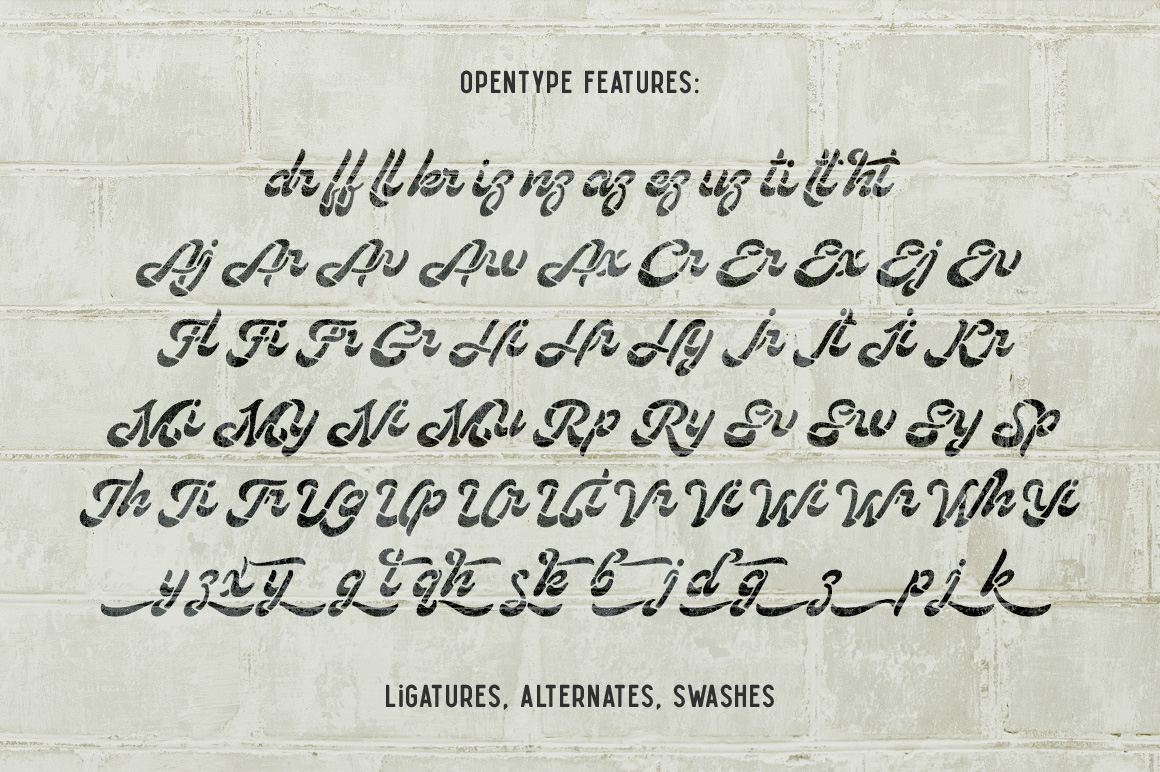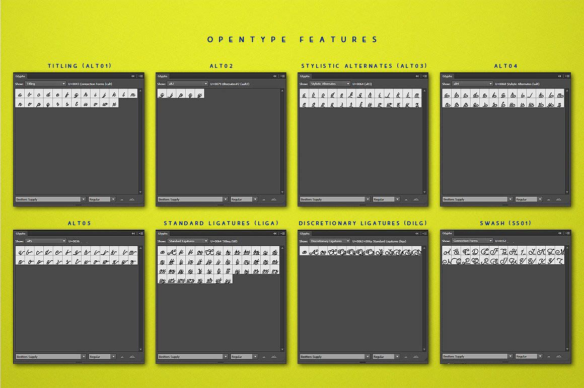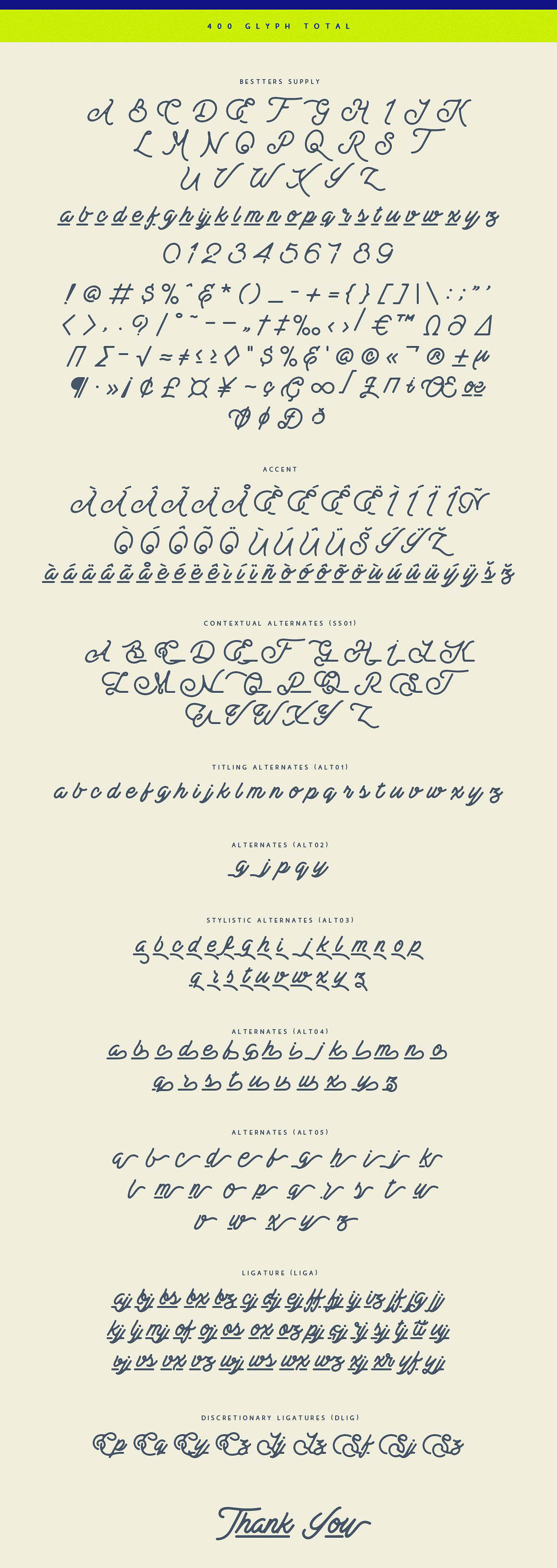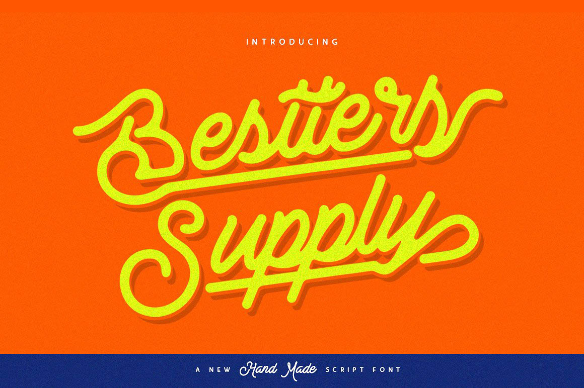 Bestters Supply is a hand made script font, bold, classic and fun vintage script.Can be used for various purposes.such as logos, t-shirt, letterhead, signage, news, shopping bag, posters, badges etc. Bestters Supply comes with Opentype features with 400 glyphs inside. Including alternate characters upper and lower case, ligatures, discretionary ligatures, and multiple language support. Please check the detail on page 7.