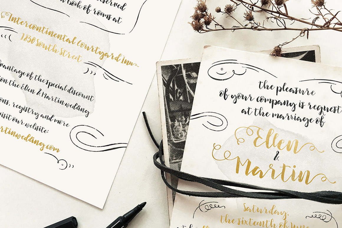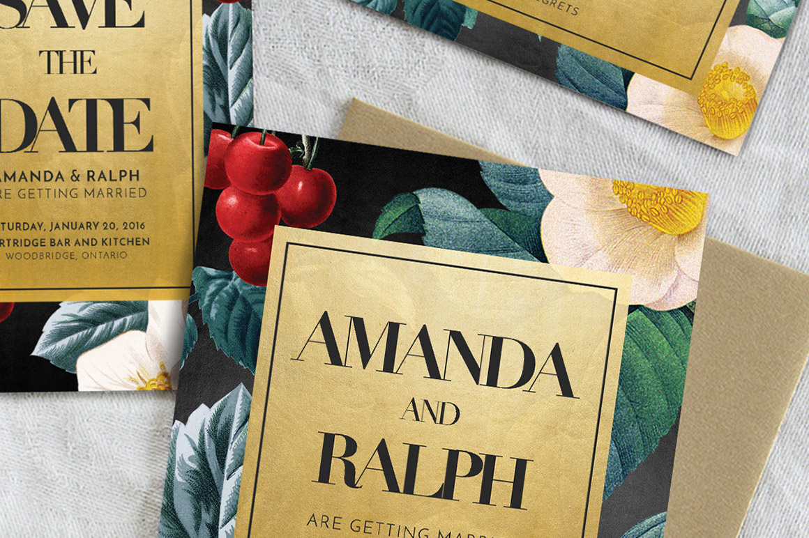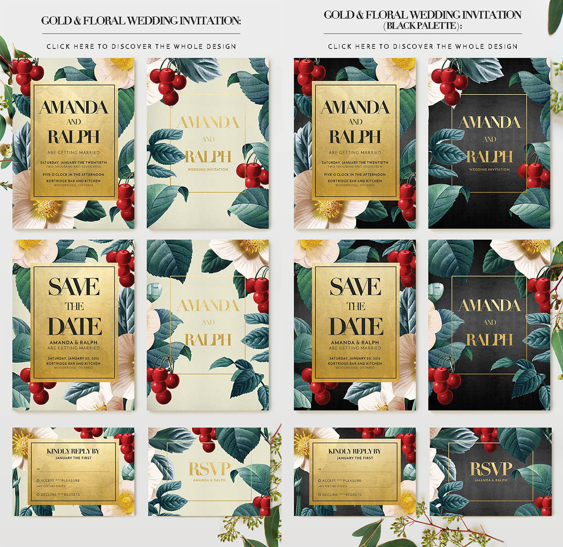 A elegant set of gold and vintage floral illustration specially made for your wedding celebration. There are 2 palettes available: the black palette, and the color palette that has editable background color. Inside the package, you will get: wedding invitation, save the date, and RSVP. They all come with front & back design. This well crafted design has color highlighted & well-arranged layers, just to make it easy for you to edit the wording. Gold Floral Wedding Invitation Features: