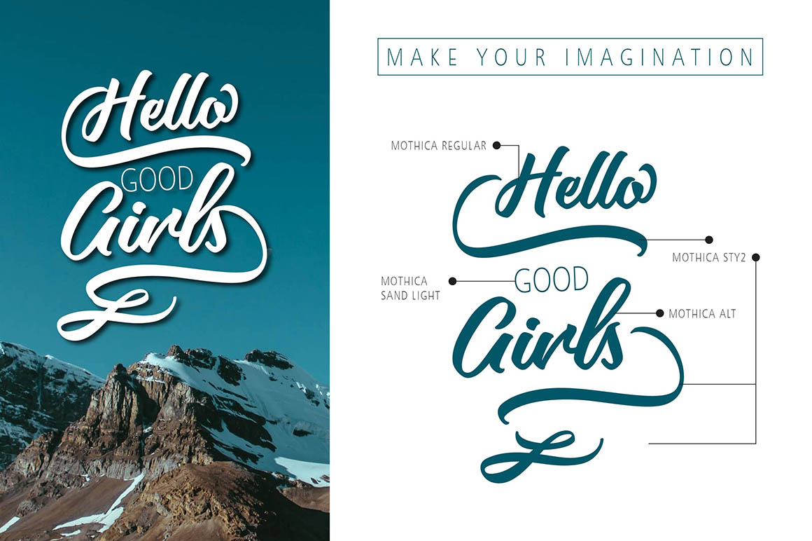 Mothica Script is a beautiful Script, It suitable for wedding invitation, greeting cards, T-Shirt, Logo or any design that you create.comes with a complete set of standard characters, Alternates, Punctuation & international glyphs. Features: