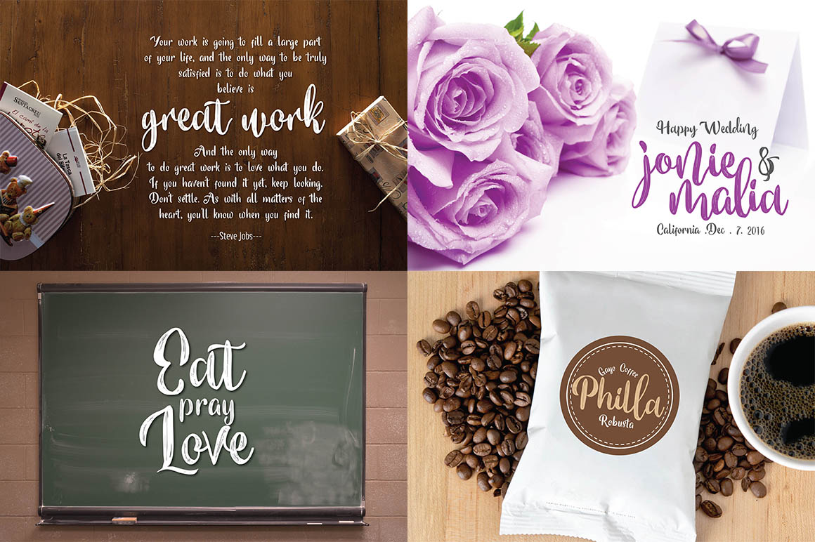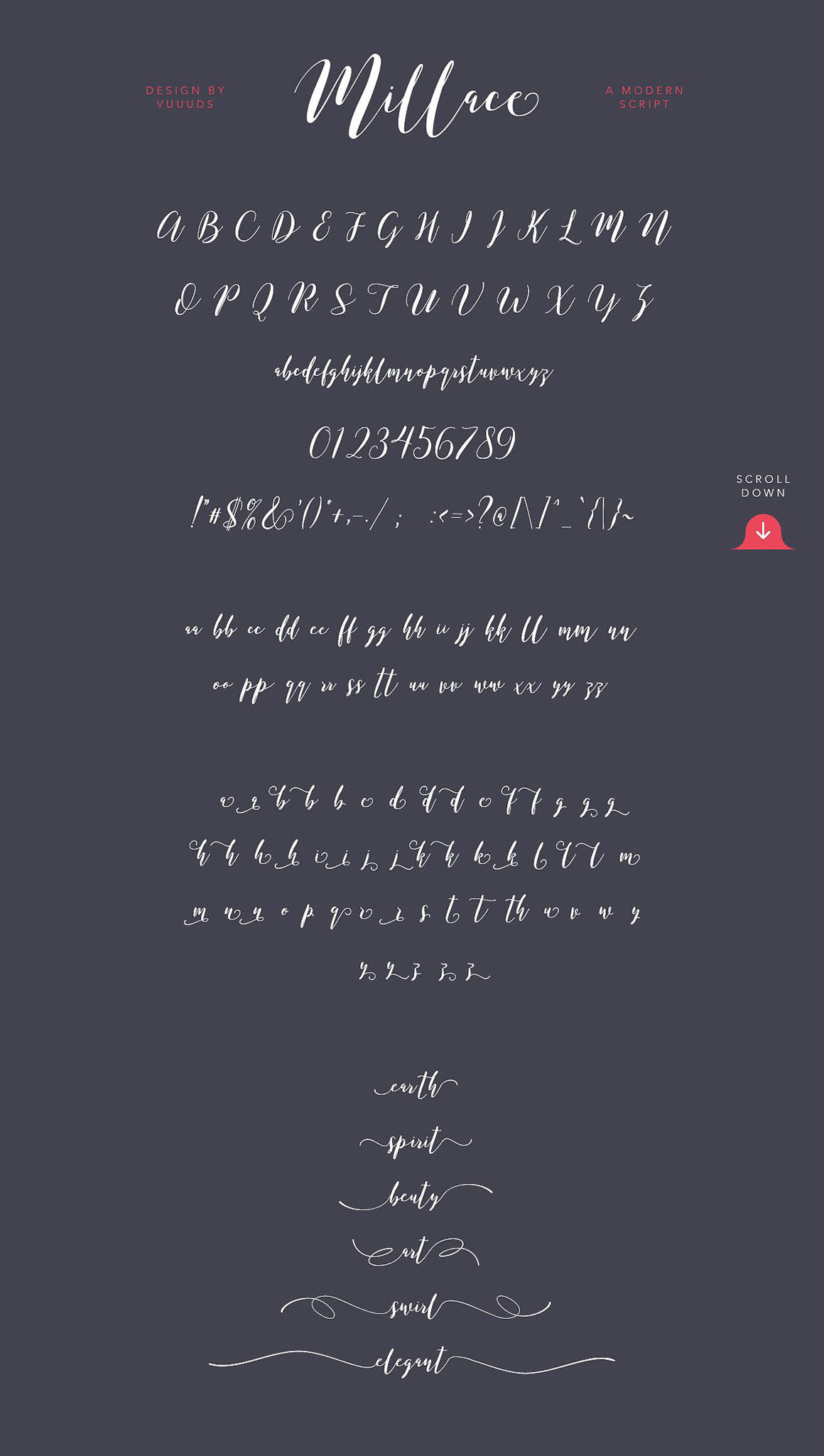 Millace is modern script font, every single letters have been carefully crafted to make your text looks beautiful. With modern script style this font will perfect for many different project ex: quotes, blog header, poster, wedding, branding, logo, fashion, apparel, letter, invitation, stationery, etc. Millace script including alternate glyph and extra swirl.