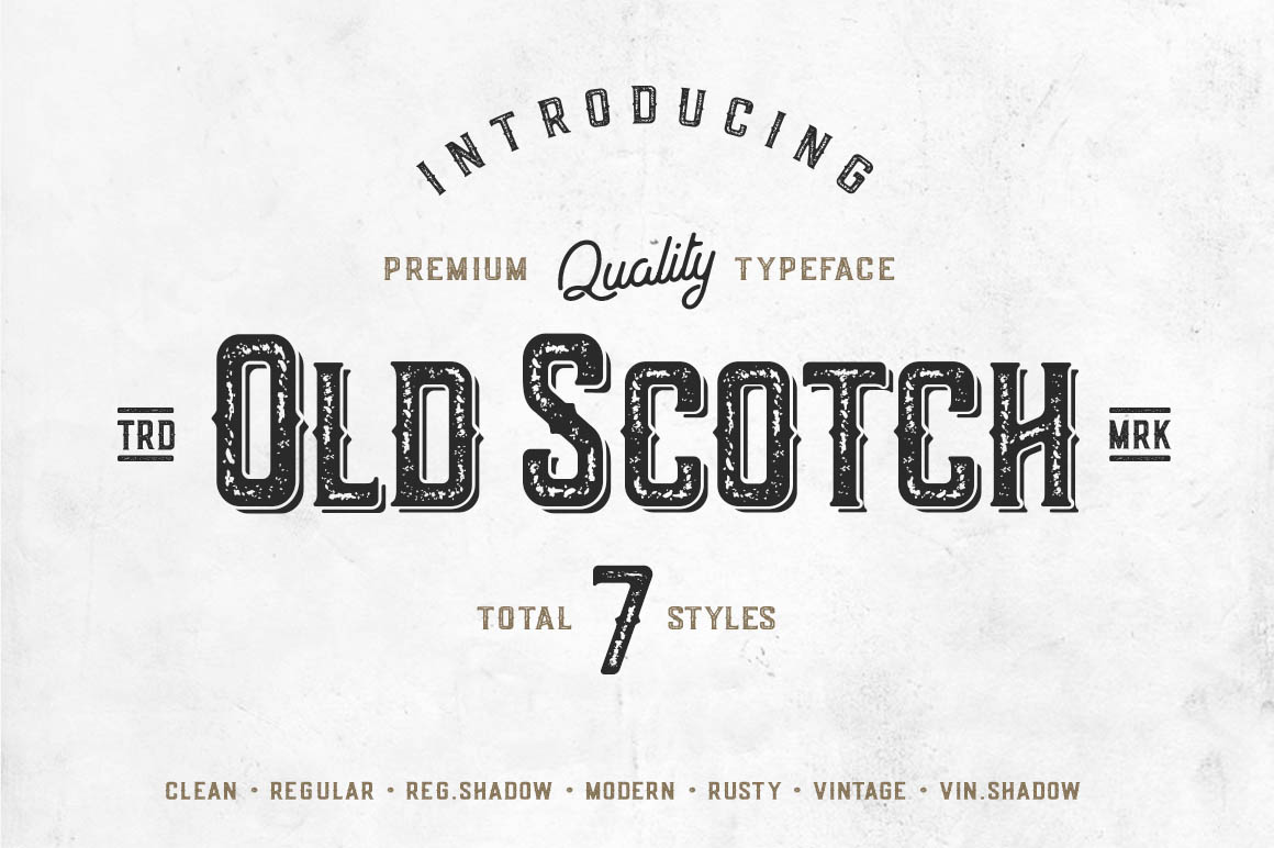 Old Scotch is a highly detailed vintage yet modern font inspired from beer and brewery vintage style. The font have smooth edges to simulate vintage printing. Come with 7 font styles : Clean, Regular, Regular Shadow, Modern, Rusty, Vintage, Vintage Shadowto be paired together for an great vintage and classic look. Made for those who like aesthetics in vintage and classic design. Suitable and applicable for any material graphic designs, especially vintage designs.