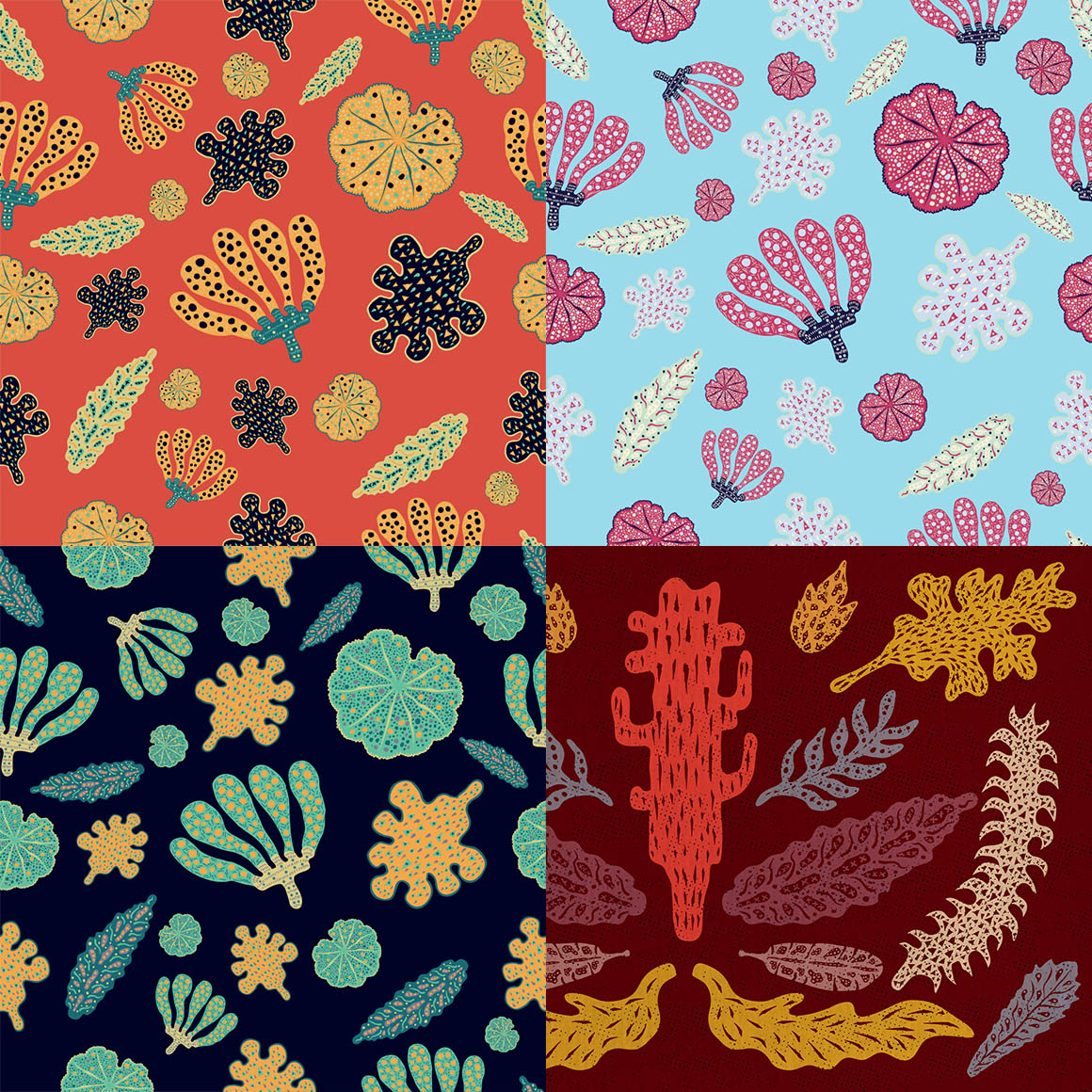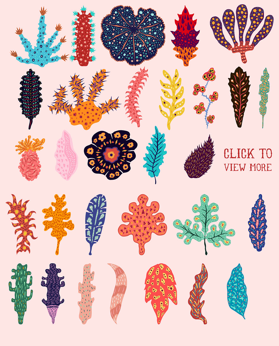 - 30 original and colorful psychedelic illustrations of leaves, plants and flowers drawn by hand, vectorized and digitally colorized
