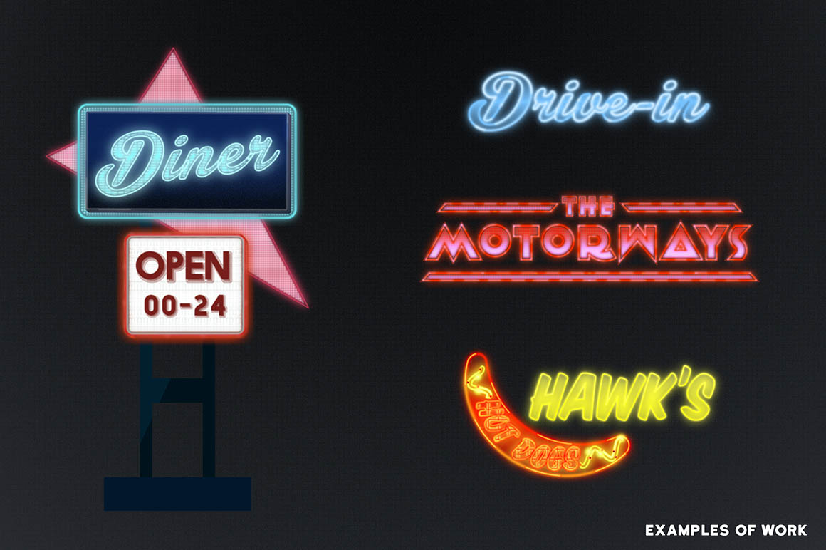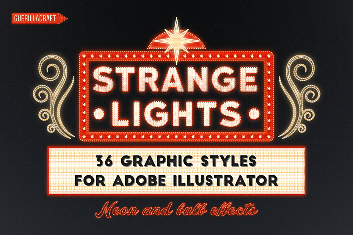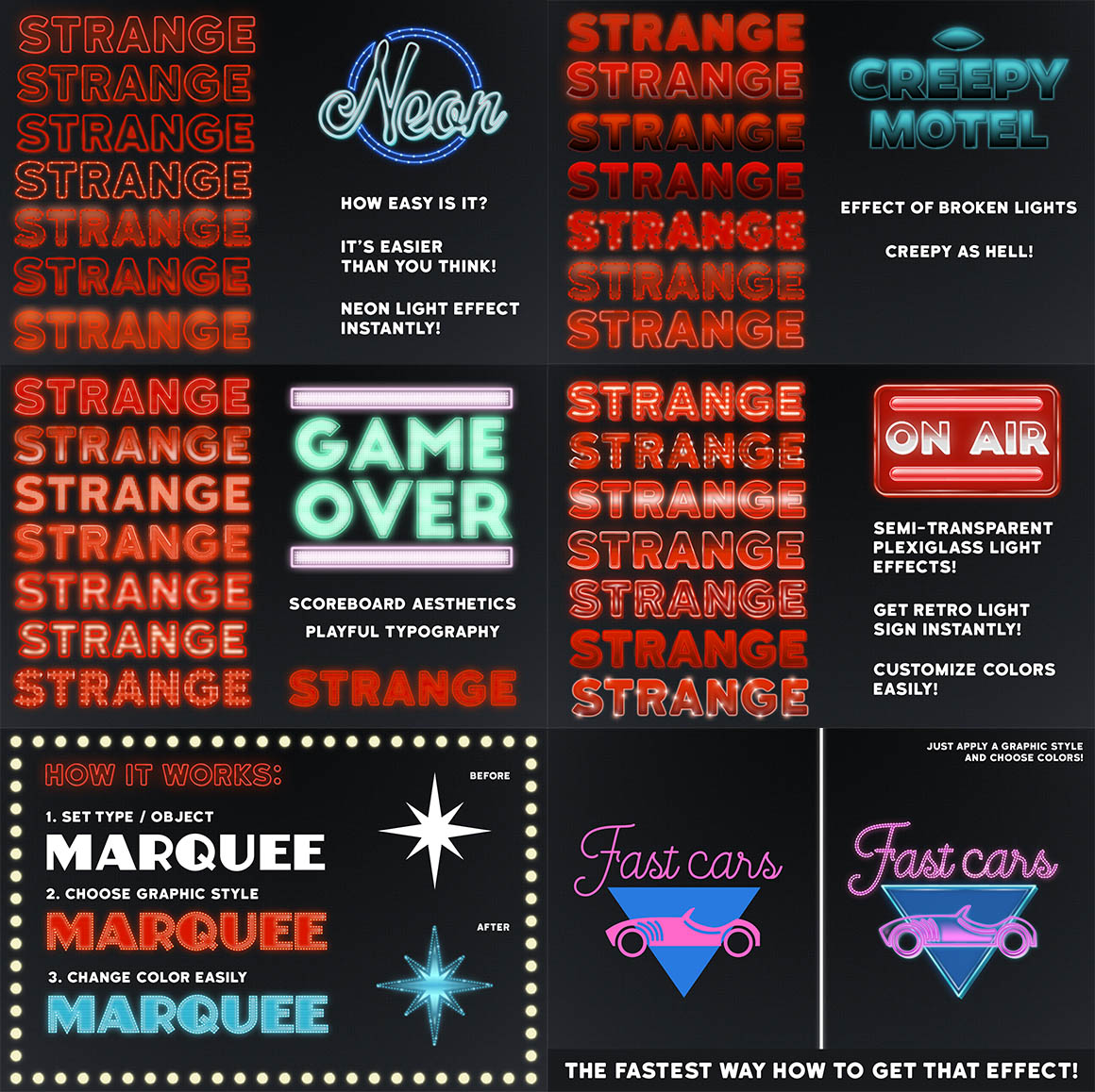 Strange Lights are great graphic styles for Adobe Illustrator. With these superb high-quality styles you can get neon & light sign effects instantly! Work with CS6 and newer. Inspired by Las Vegas lights, vintage Drive-in signs and 80s graphics, I made these powerful set of graphic styles. You can easily create fluorishing text titles and customize colors as you can. It includes: