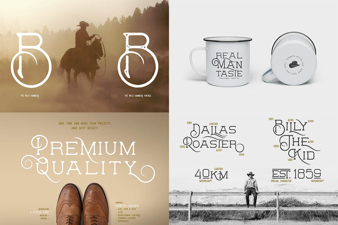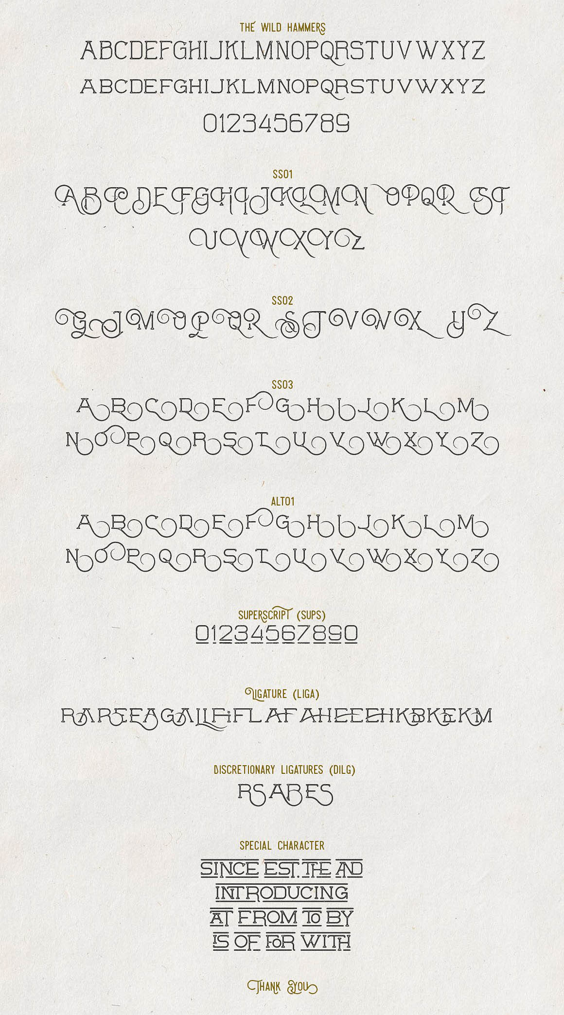 Say hi to The Wild Hammers; An American flavor typeface. Really easy to use for create logo, display font, t-shirt, leather product and any classic or modern general design. The Wild Hammers comes with Opentype features alternate upper and lowercase characters, and supports international languages. To check all glyphs please click 5th preview!