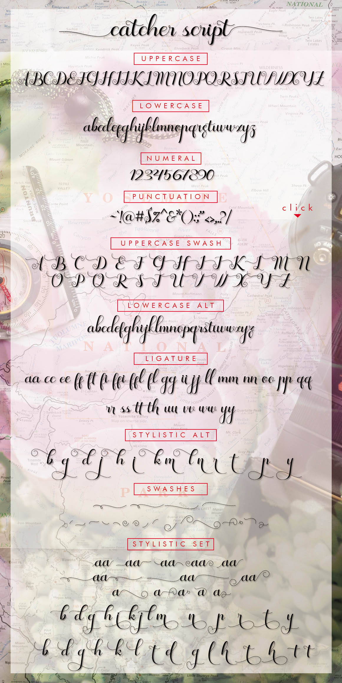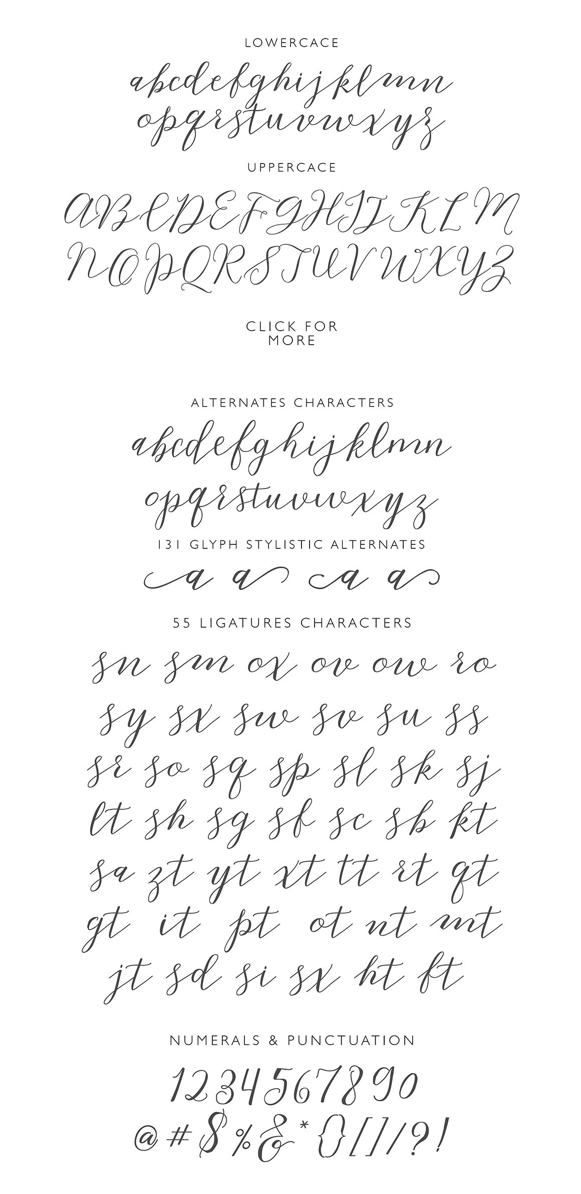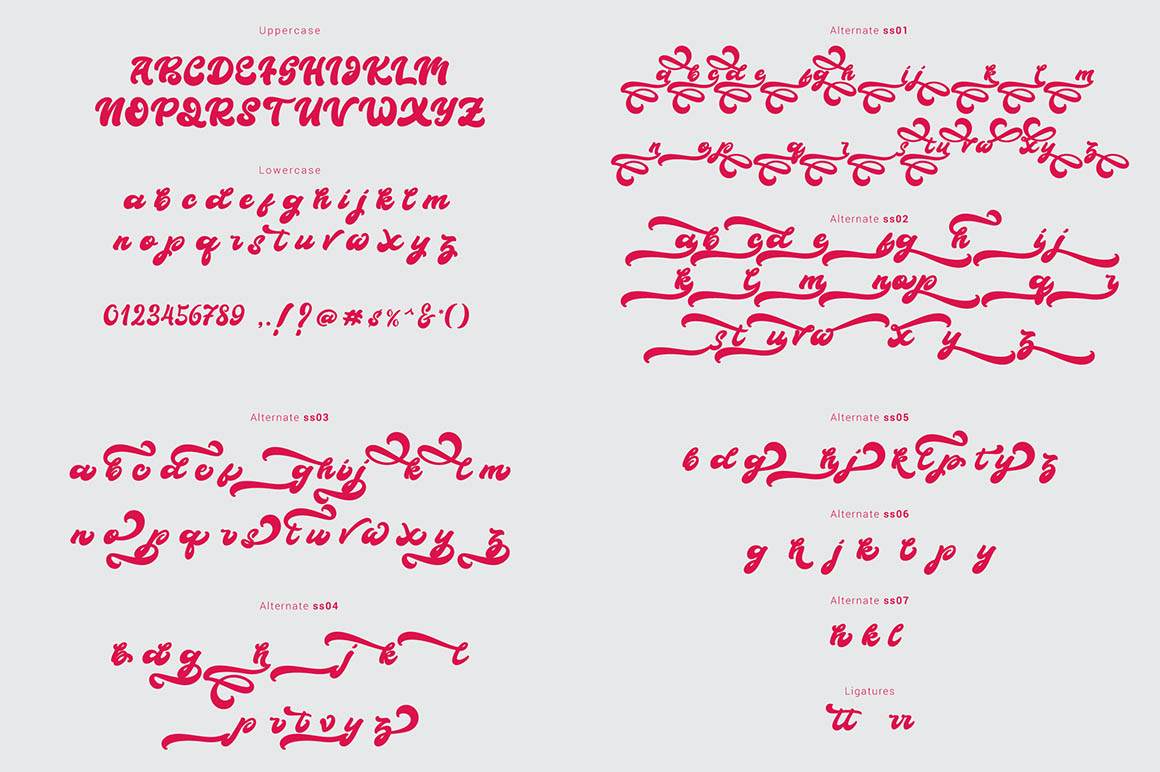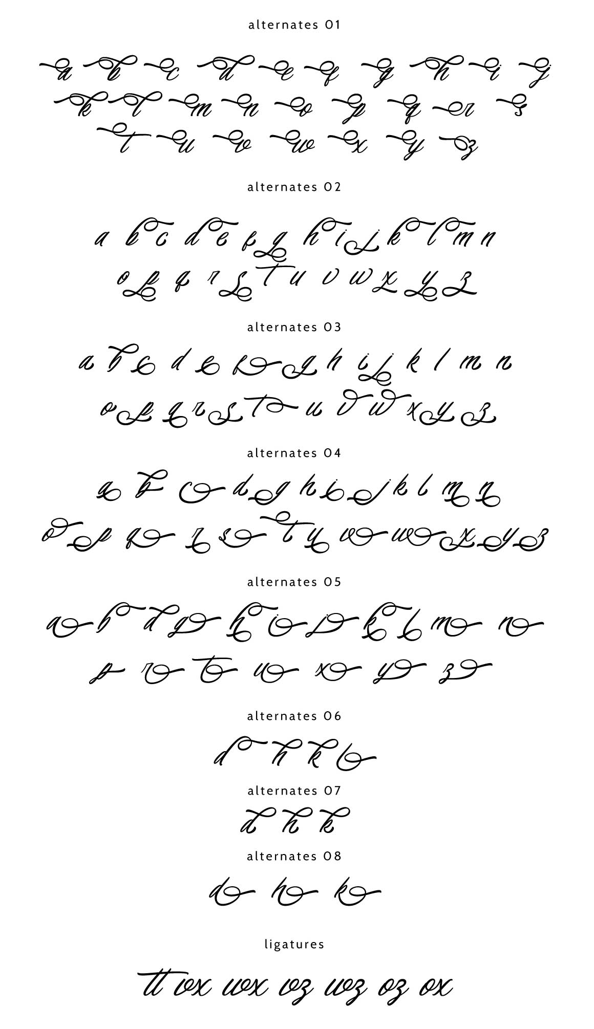 If you don’t have a program that supports OpenType features such as Adobe Photoshop or Illustrator, you can access all the alternate glyphs using Font Book (Mac) or Character Map (Windows).