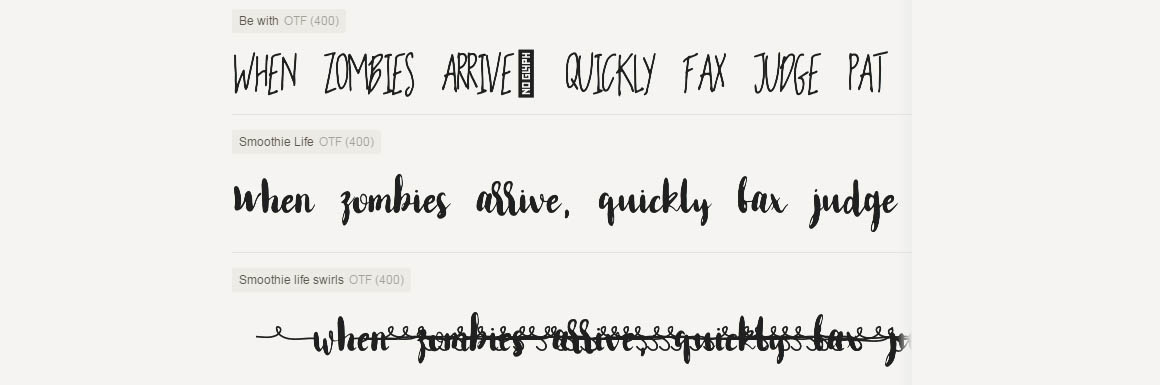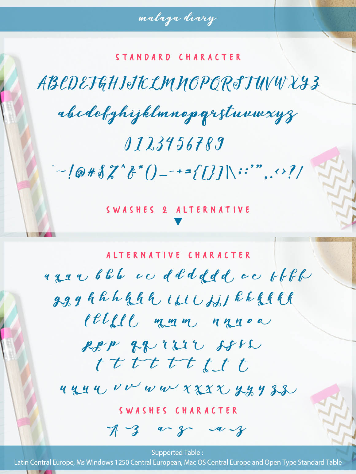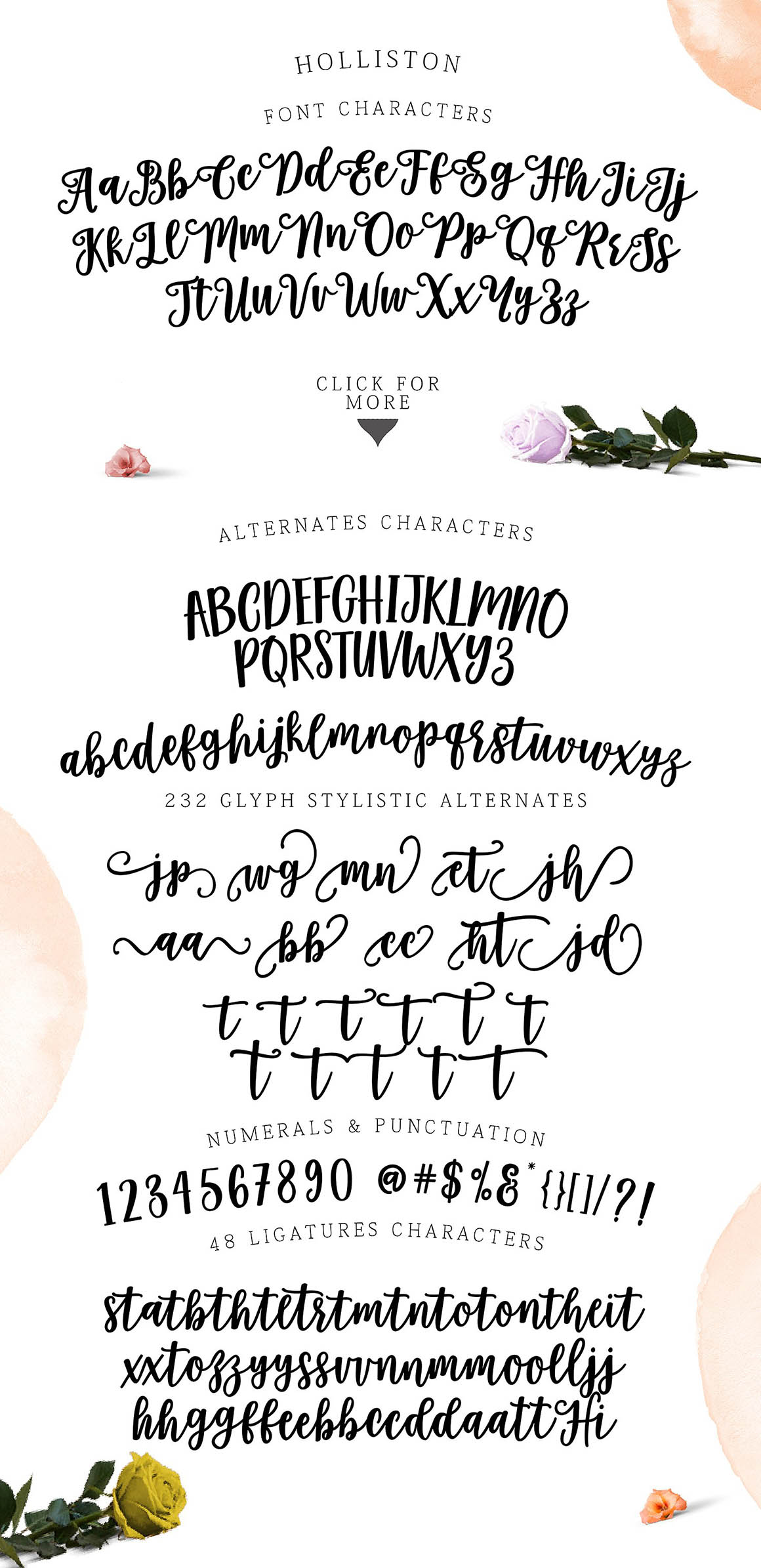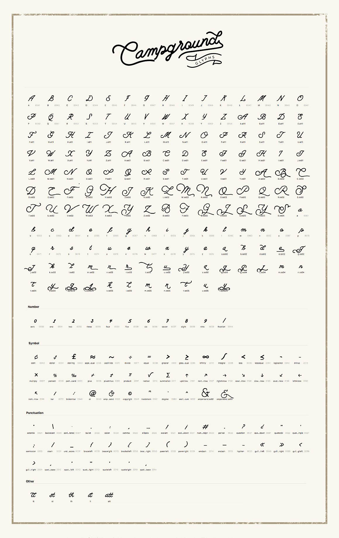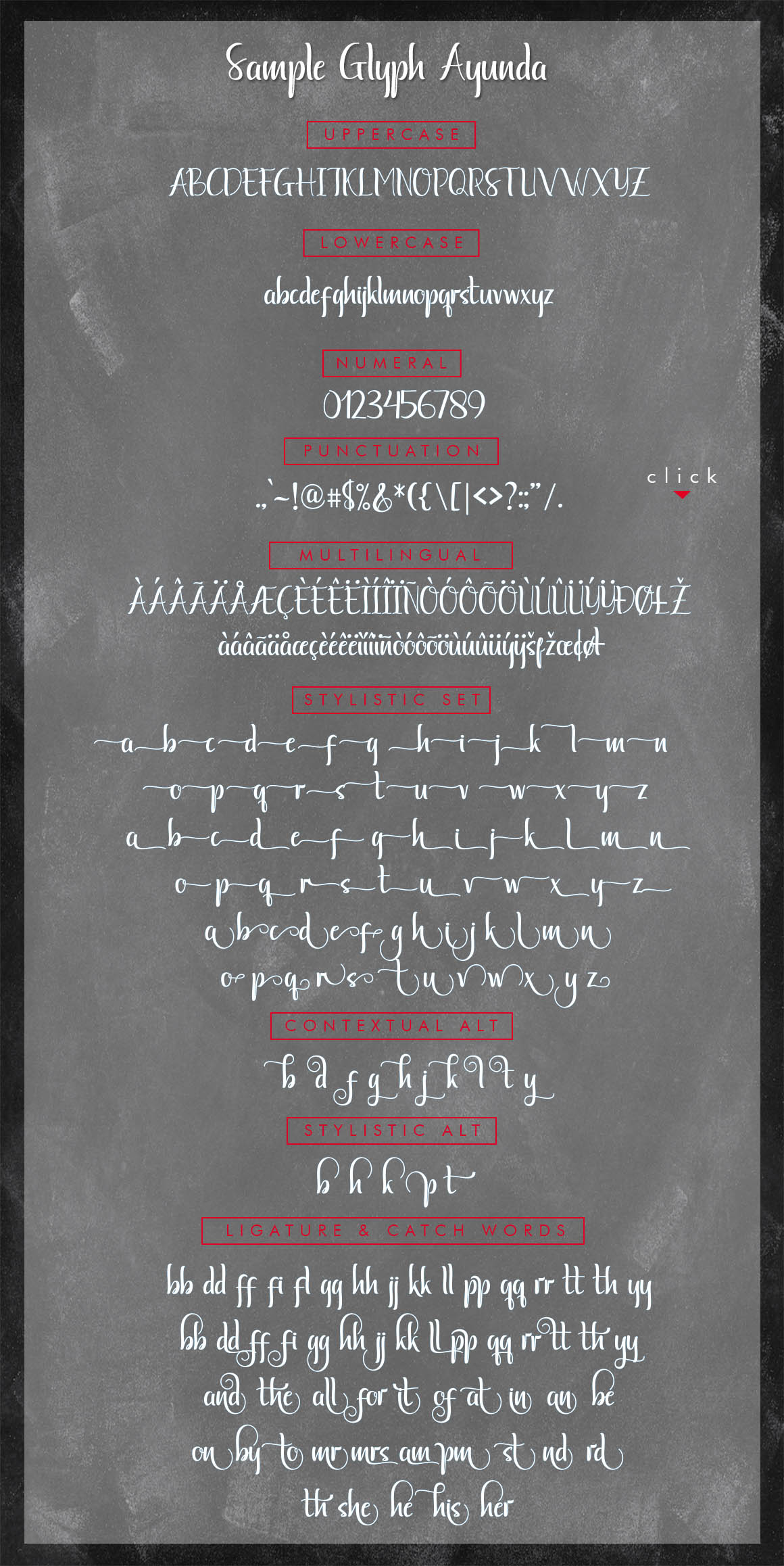 If you don’t have a program that supports OpenType features such as Adobe Photoshop or Illustrator, you can access all the alternate glyphs using Font Book (Mac) or Character Map (Windows).