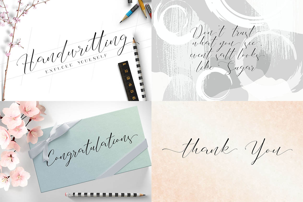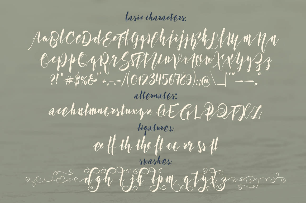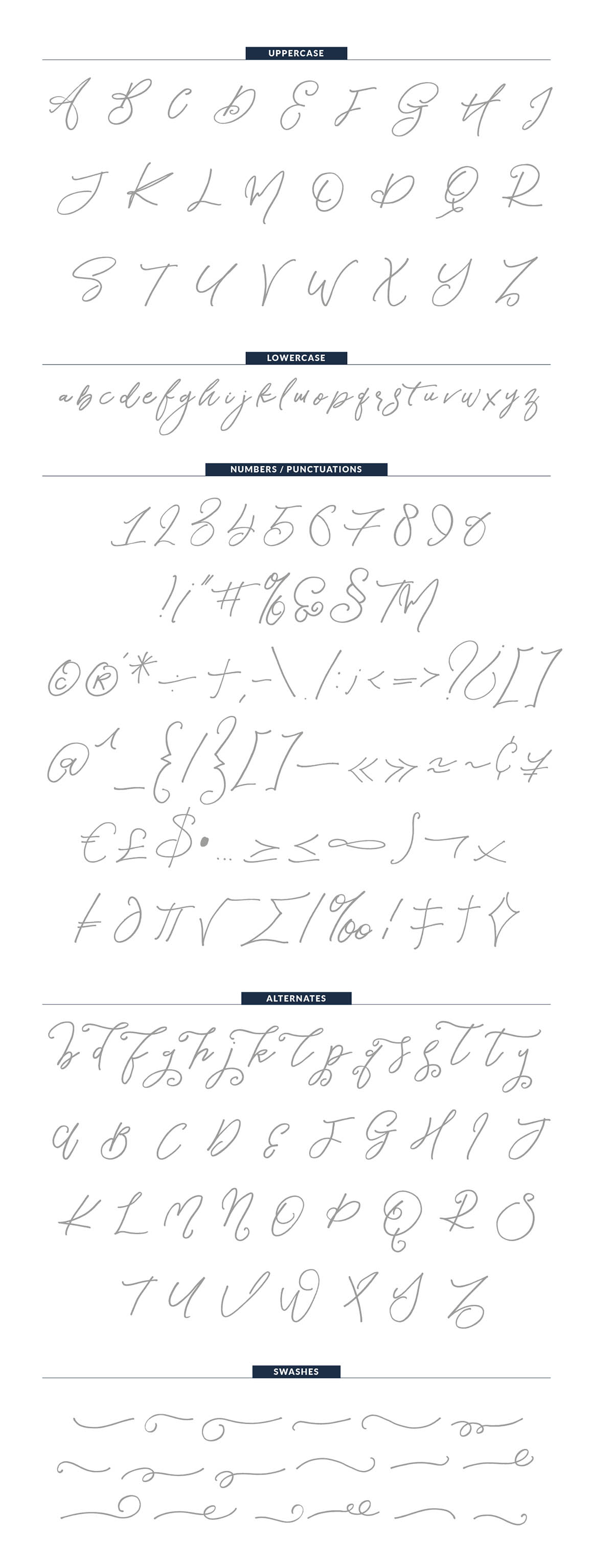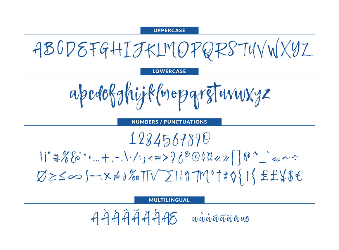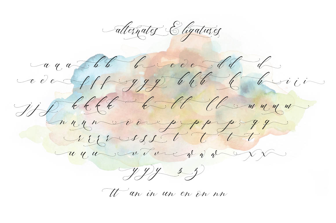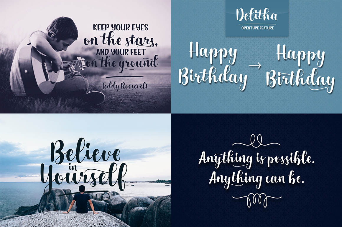 Delitha is a beautiful hand painted script that comes with a set of extras. All letters have been carefully painted giving your words a wonderful flow. Delitha can be used for fashion, apparel, stationery, magazines, film, books and marketing. After careful evaluation of the connections between characters, intelligent standards have been established for use of the OpenType feature, that used together with the ‘stylistic alternates, stylistic sets, and swash’ feature, offers a gentle and friendly pace. It can be accessed by using OpenType savvy program such as Adobe Illustrator and Adobe InDesign.