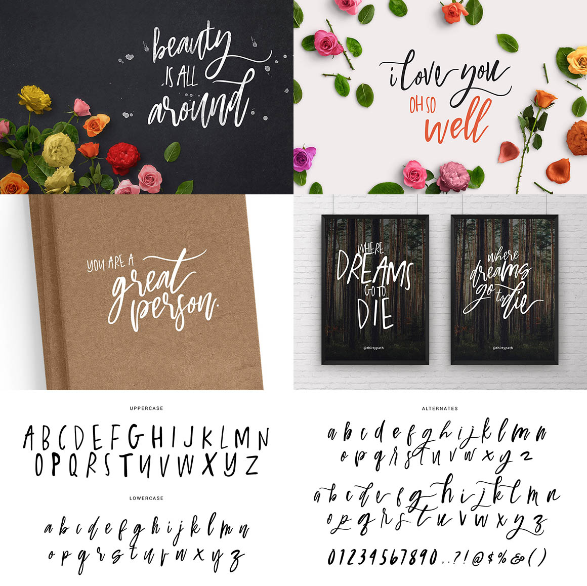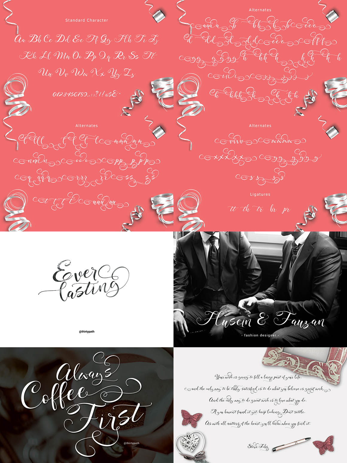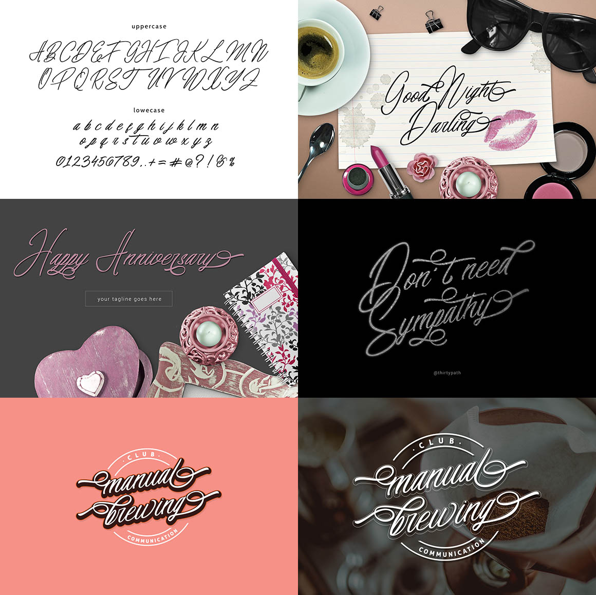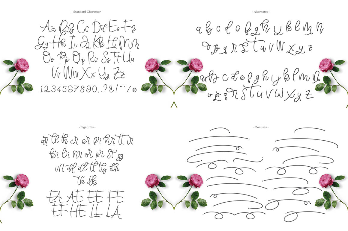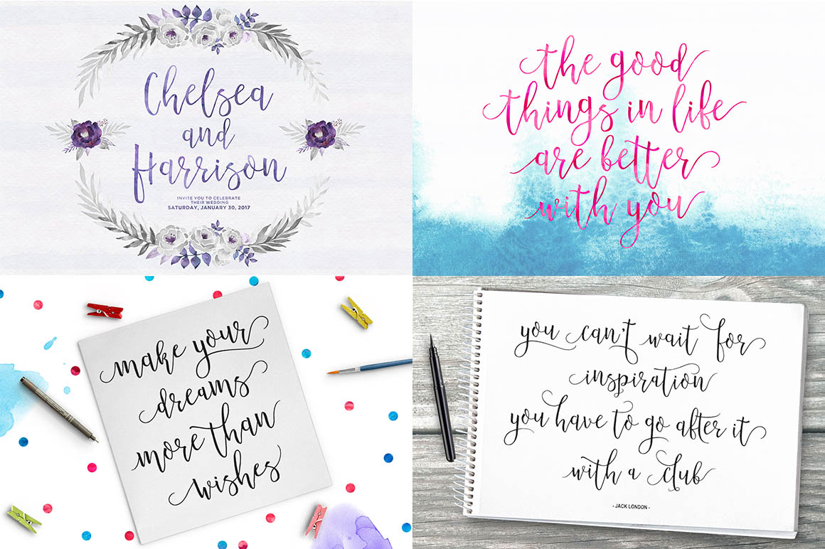 Delitha is a beautiful hand painted script that comes with a set of extras. All letters have been carefully painted giving your words a wonderful flow. Delitha can be used for fashion, apparel, stationery, magazines, film, books and marketing. After careful evaluation of the connections between characters, intelligent standards have been established for use of the OpenType feature, that used together with the ‘stylistic alternates, stylistic sets, and swash’ feature, offers a gentle and friendly pace. It can be accessed by using OpenType savvy program such as Adobe Illustrator and Adobe InDesign.