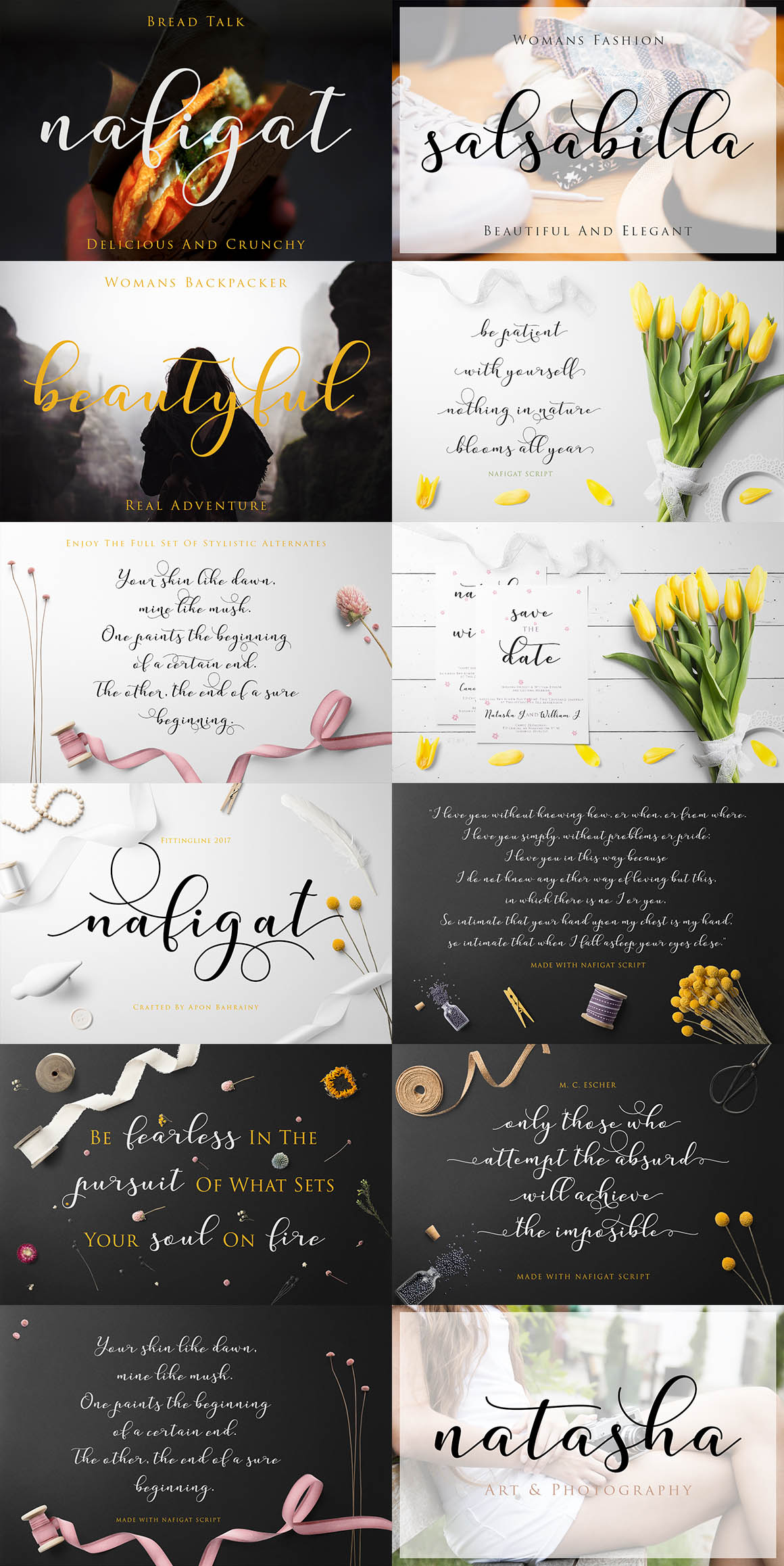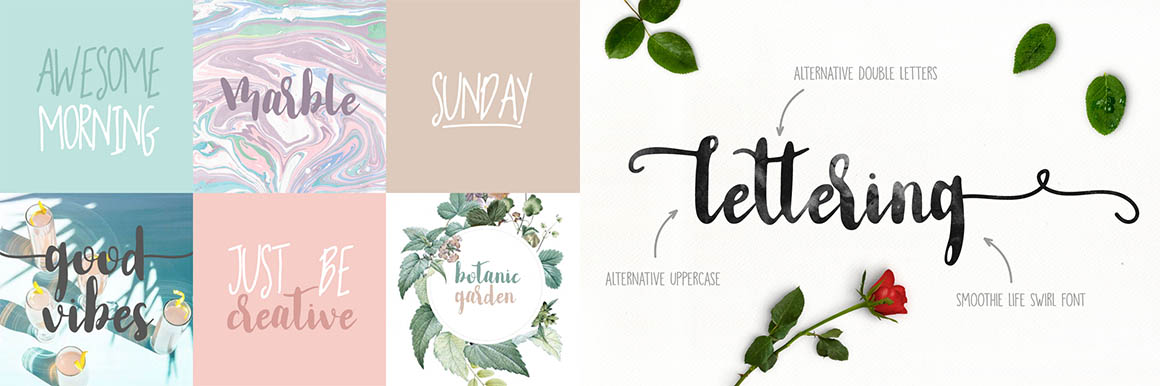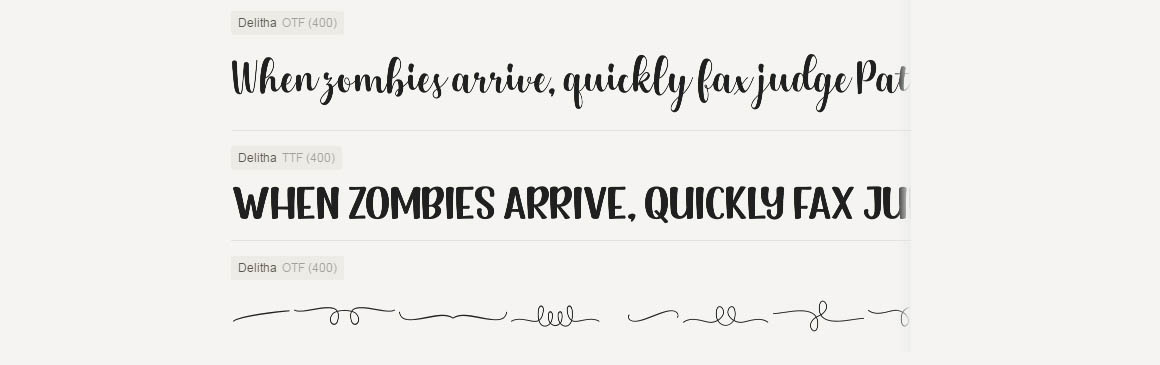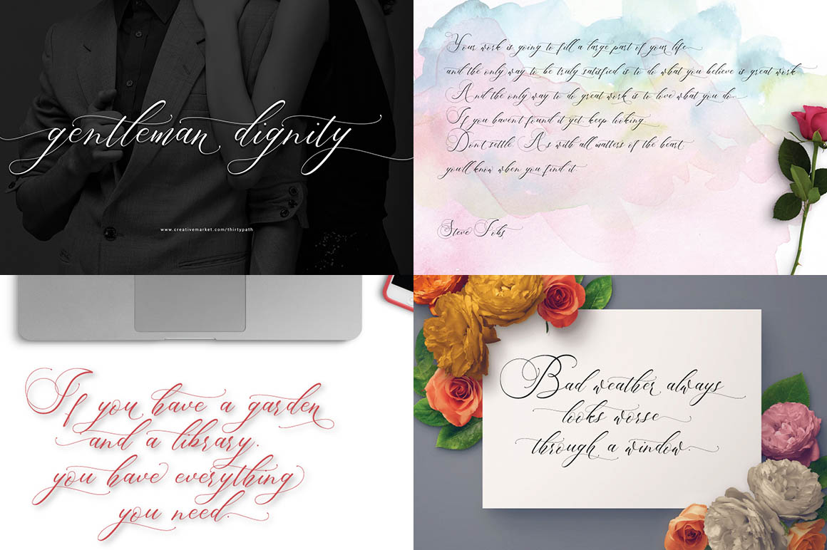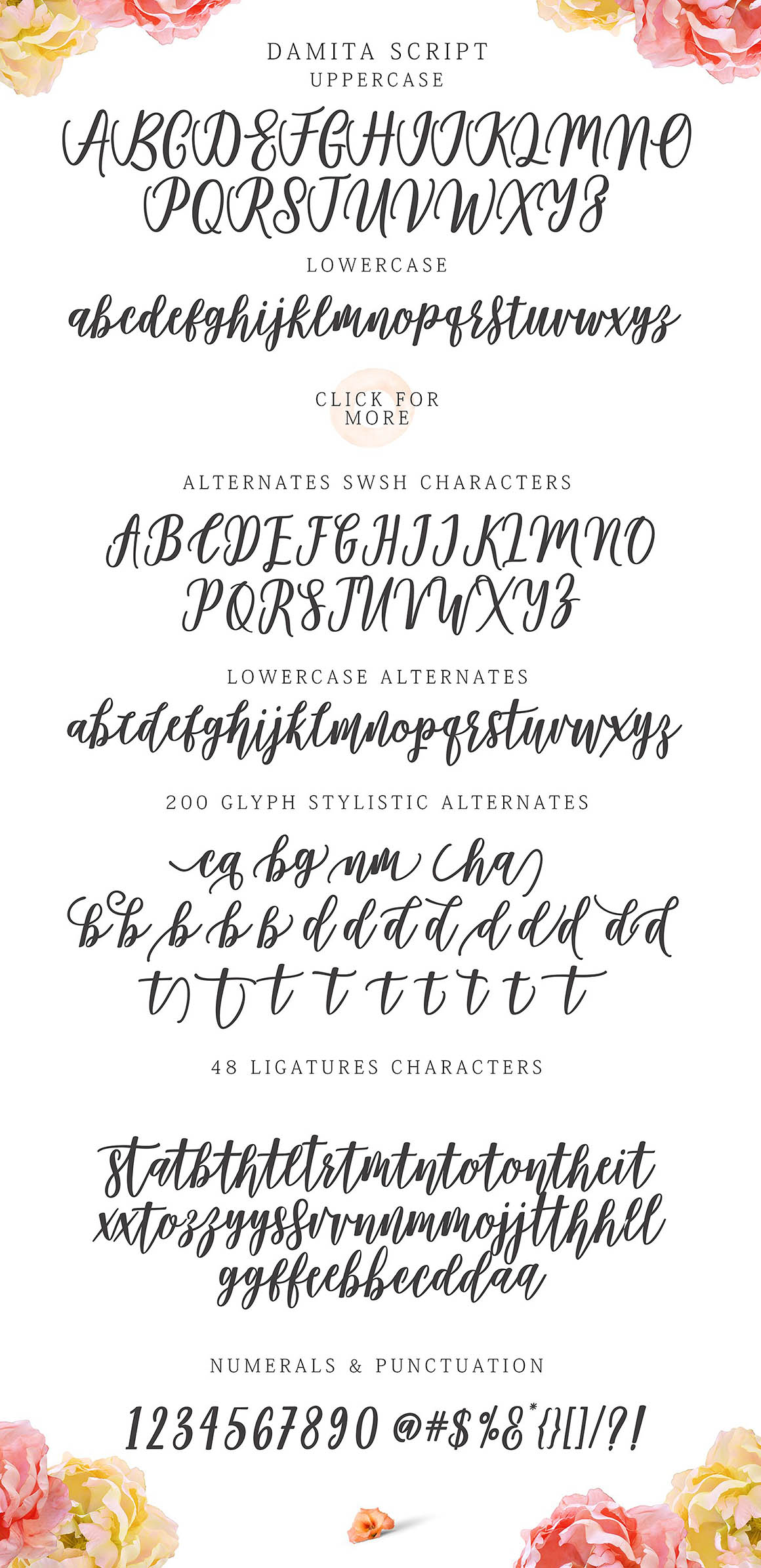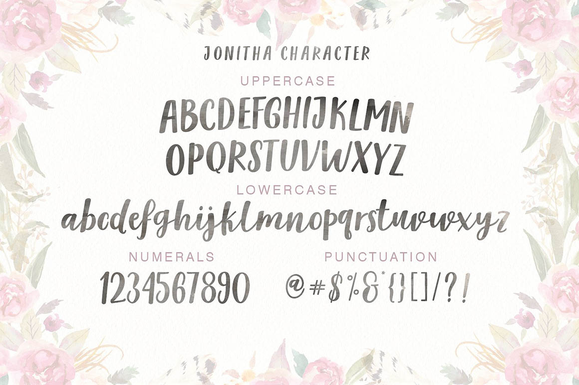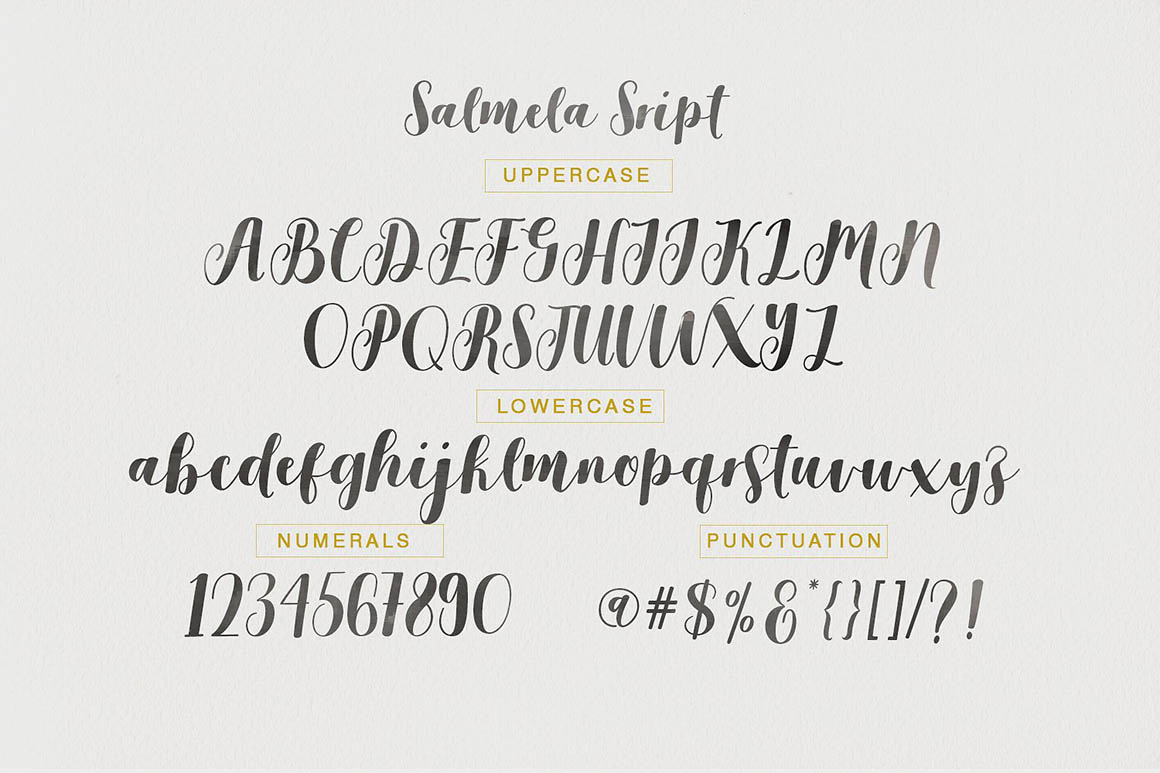 Delitha is a beautiful hand painted script that comes with a set of extras. All letters have been carefully painted giving your words a wonderful flow. Delitha can be used for fashion, apparel, stationery, magazines, film, books and marketing. After careful evaluation of the connections between characters, intelligent standards have been established for use of the OpenType feature, that used together with the ‘stylistic alternates, stylistic sets, and swash’ feature, offers a gentle and friendly pace. It can be accessed by using OpenType savvy program such as Adobe Illustrator and Adobe InDesign.