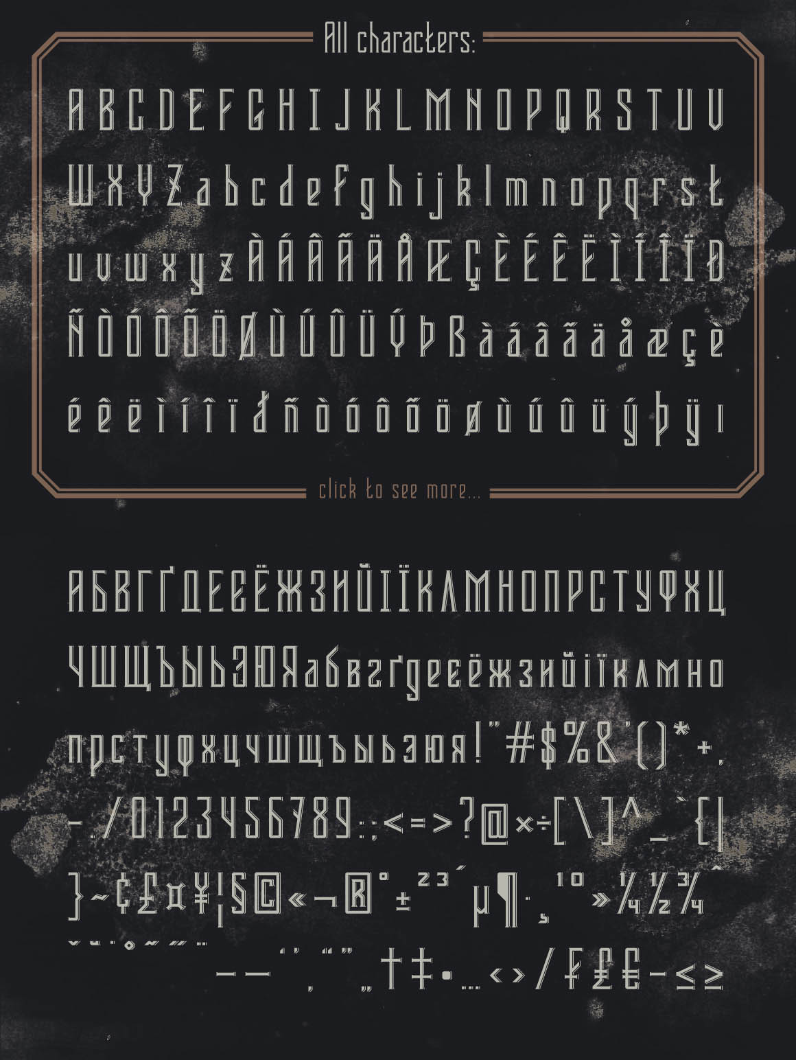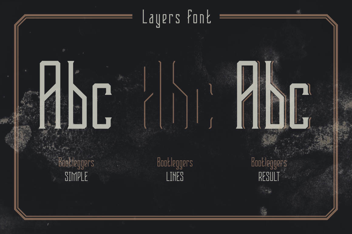 Hello! Introducing a vintage style font “Bootleggers”. It’s made of strong straight lines with tiny and accurate accent lines. It has a wide spectre of languages support, including West European, Cyrillic languages etc. (all avaliable characters you can see on the 4th screenshot). There is also a separate font files for two font layers, for easy combining the styles.