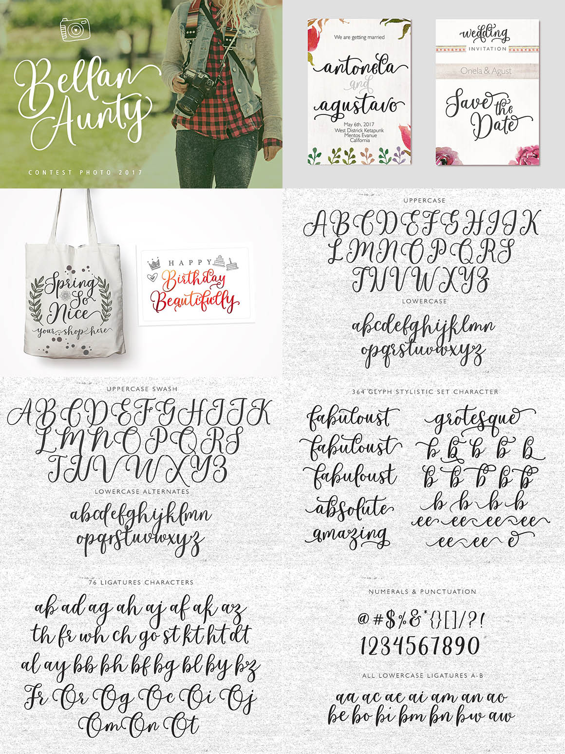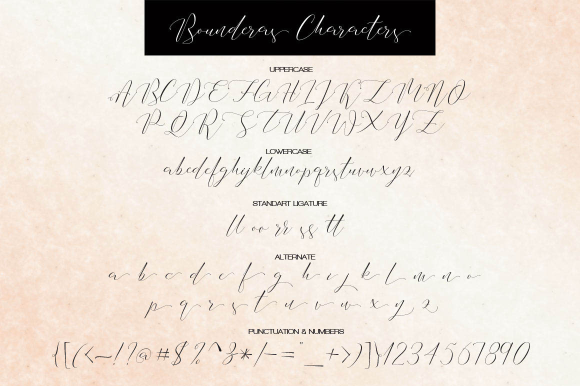 Presenting to you a Bounderas Script, a hand lettering modern calligraphy, This font was created with full of love, with smooth pulled. Bounderas Script creating the natural font for your designs beyond a standard font and include Ligatures (letters custom). You are very welcome to use it for various purpose like wedding invitations, logos, signatures, t-shirts design, cards, printed quotes, product packagings, headings, blogs, graffiti, website headline and more. Enjoy this exclusive set and explore your fantastic design. Includes • Bounderas Script an all-lowercase and uppercase scripts (OTF, TTF & WEBFONT) • Numbers + punctuation • Ligatures (letter custom) • Bounderas Script has special feature ‘end swashes’