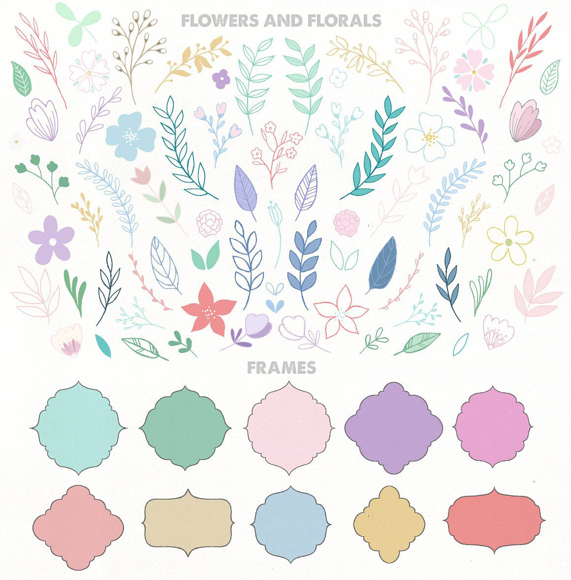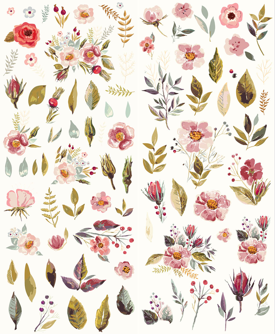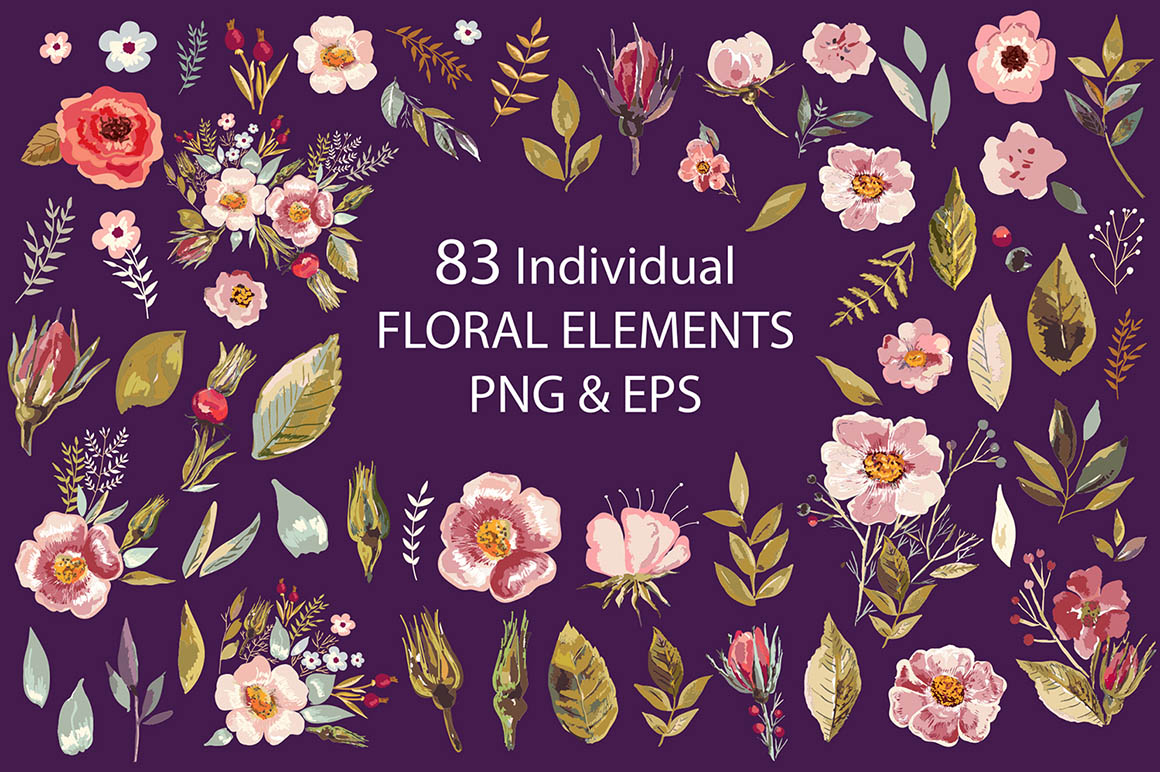 Stunning Collection with 83 INDIVIDUAL FLORAL ELEMENTS. Can be used in any amazing design: greeting cards, stationary, wedding decoration, invitations, stickers, art prints, web design, posters, t-shirts, logos, labels, bags, packaging and more.