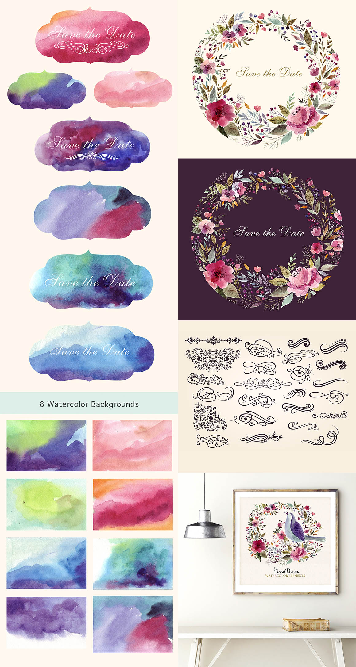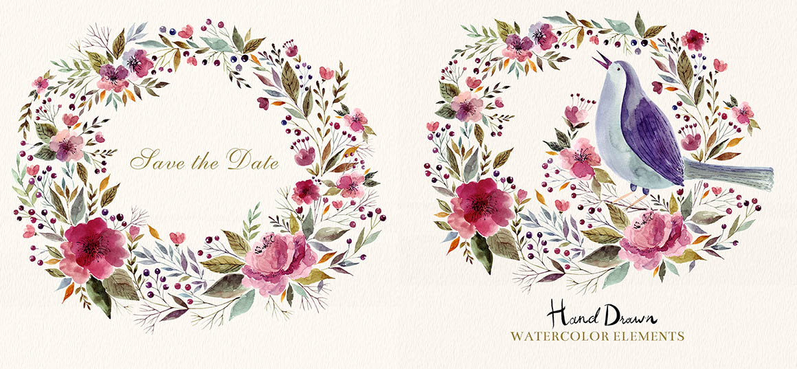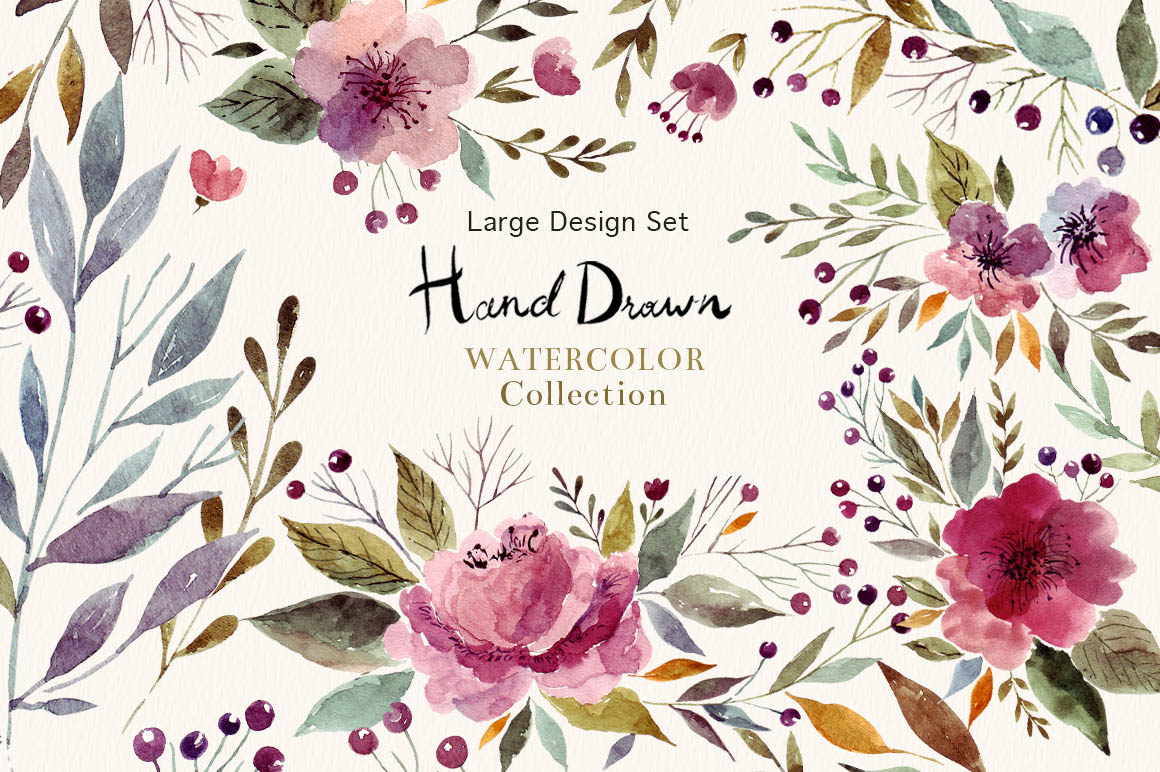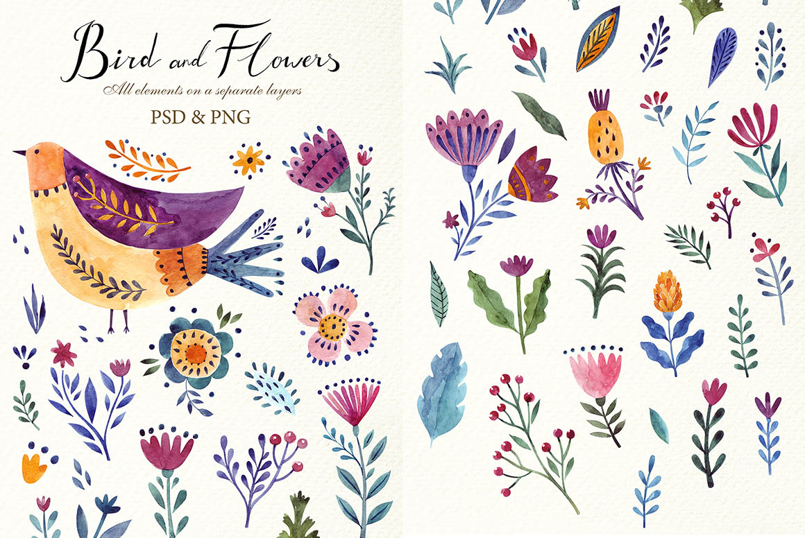 This is a New Big Great Watercolor Collection with flowers, bird, ornaments, background, wreath. All watercolor elements was hand painted, scanned and carefully prepared to the best use in design. All elements prepared in PSD layered files. THE COLLECTION IS CONTAINING 55 DESIGN ELEMENTS: ornaments, flower elements, bird, flowers, leaves, brunches, wreath, all for the perfect design. Files prepared to PNG and PSD format for easy combining items and in your unique projects. Can be used in any amazing design: greeting cards, stationary, invitations, stickers, art prints, web design, posters, t-shirts, logos, labels, bags, packaging and more.